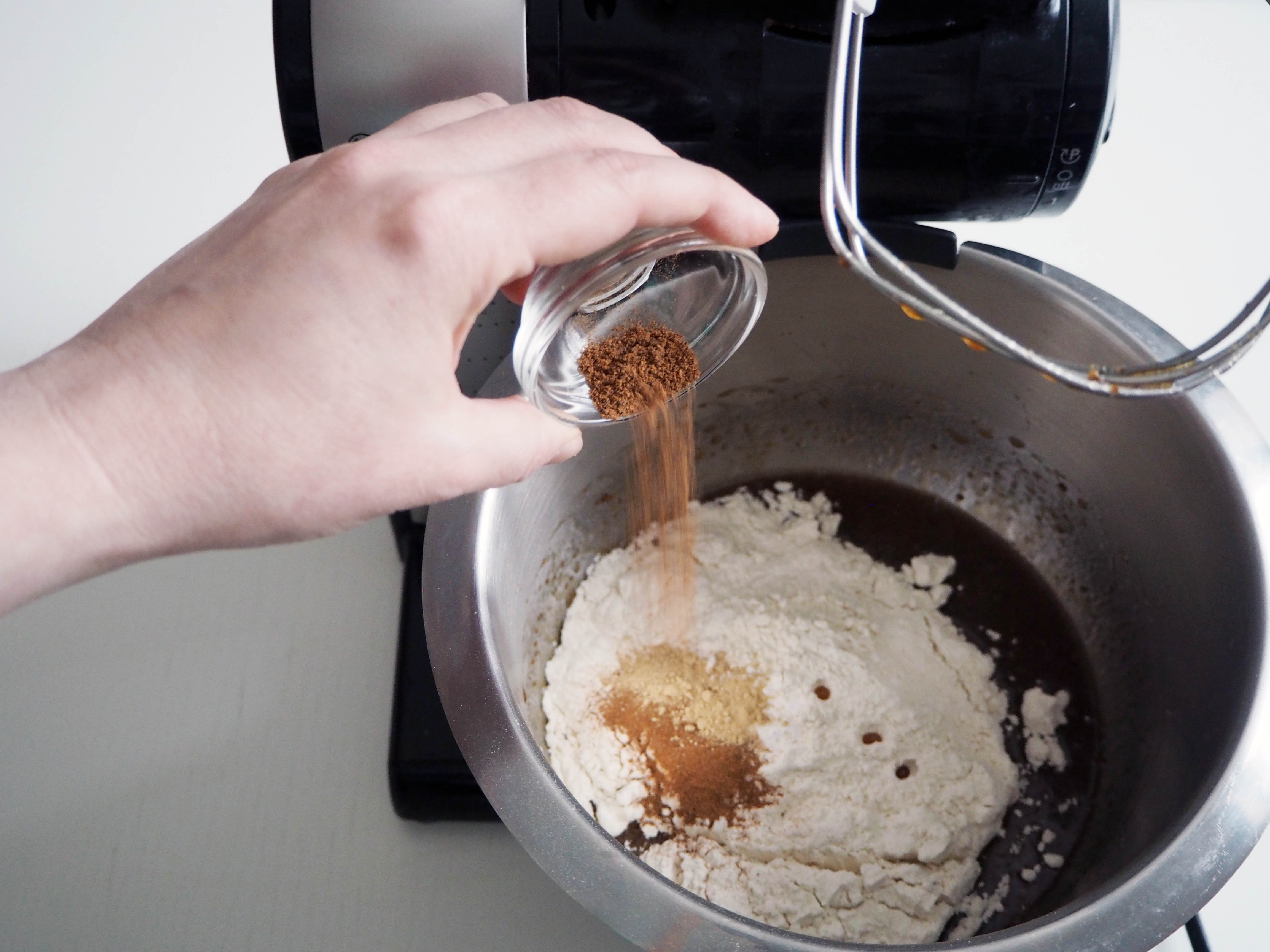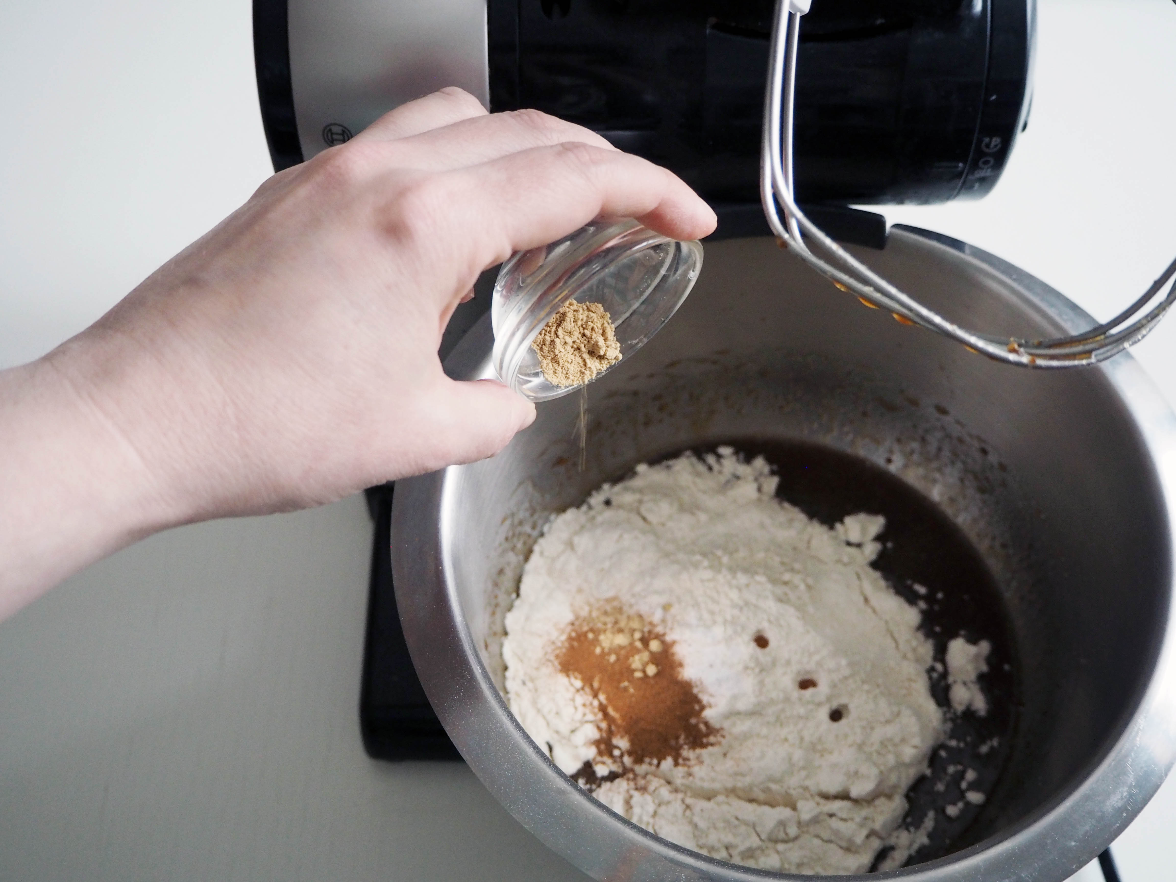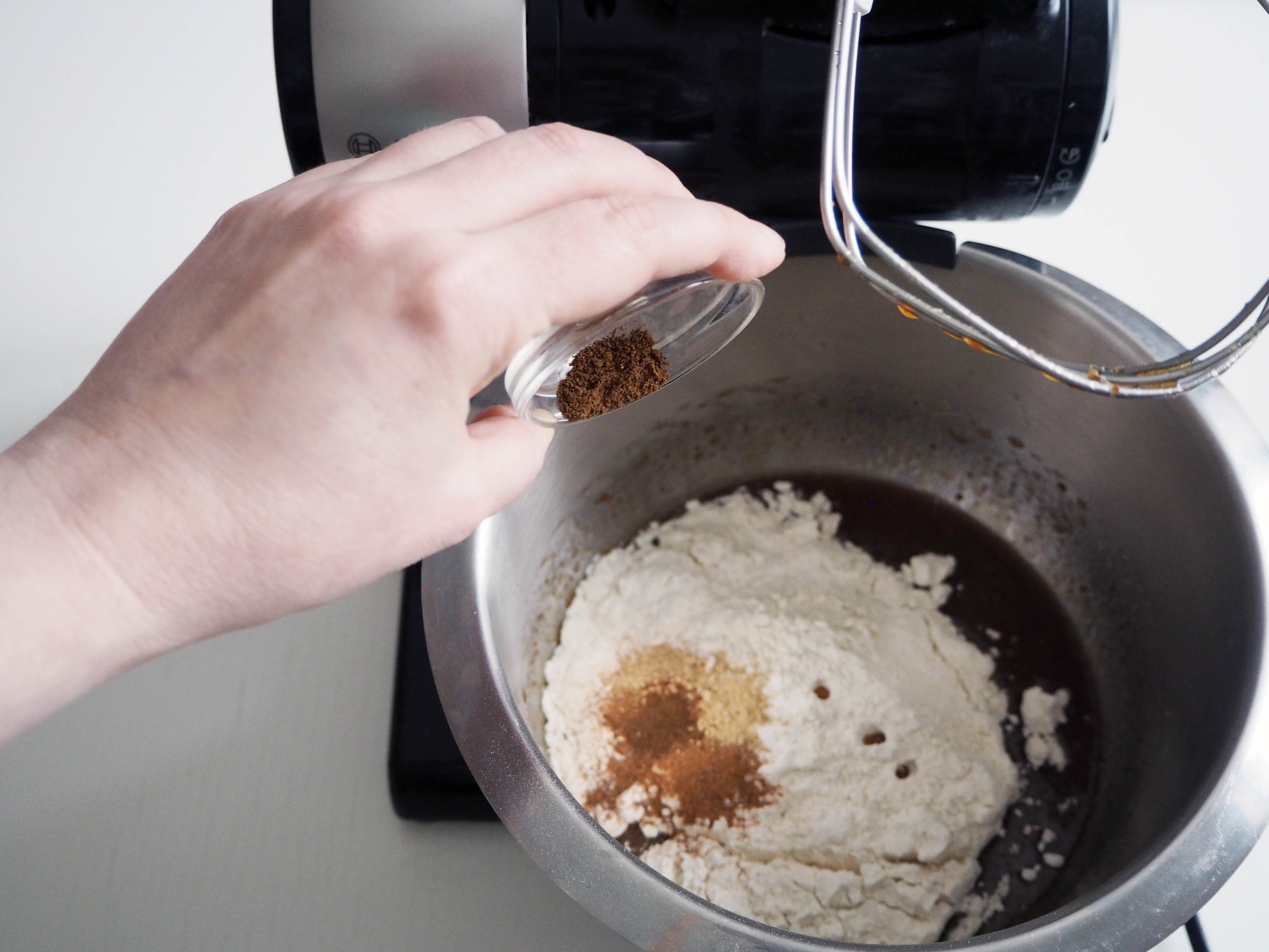 4. Add flour, baking soda, cinnamon, ginger, cloves and nutmeg and continue beating.