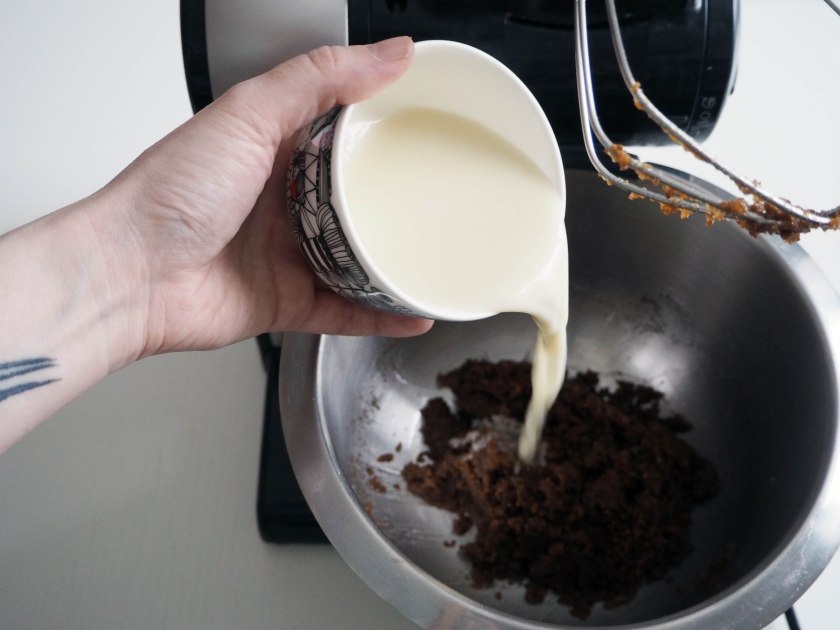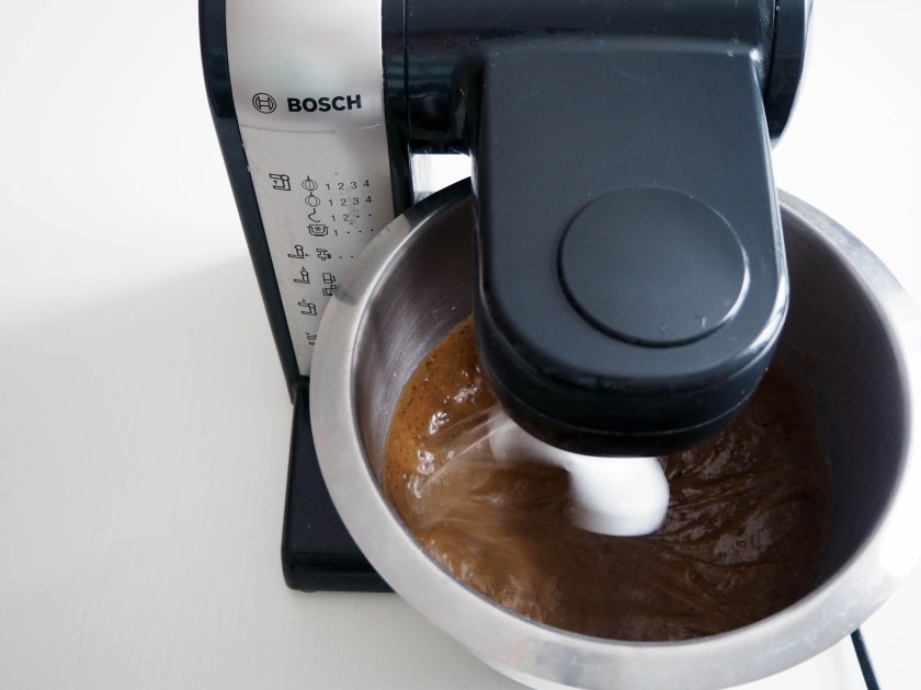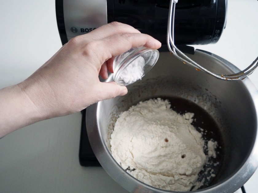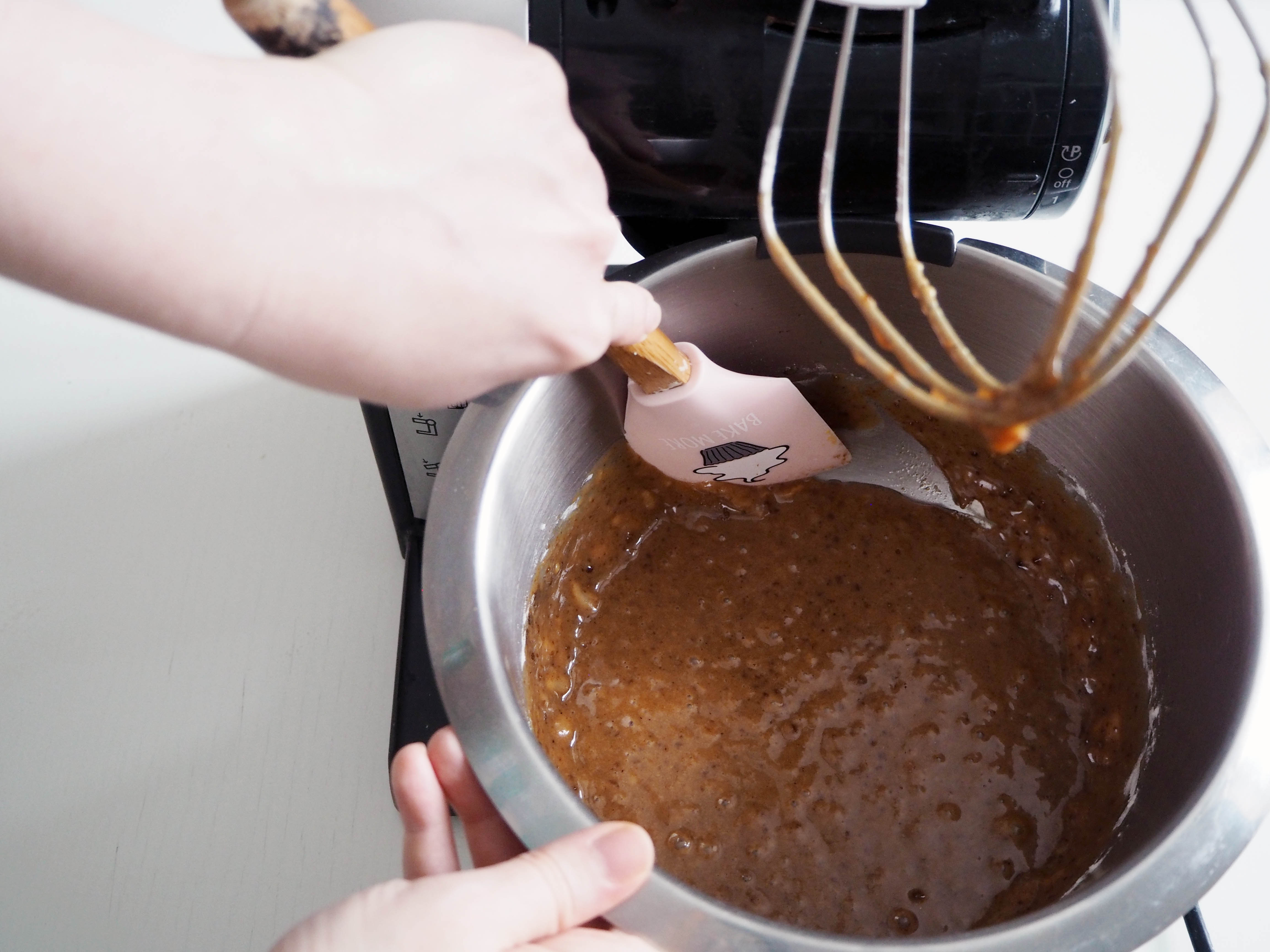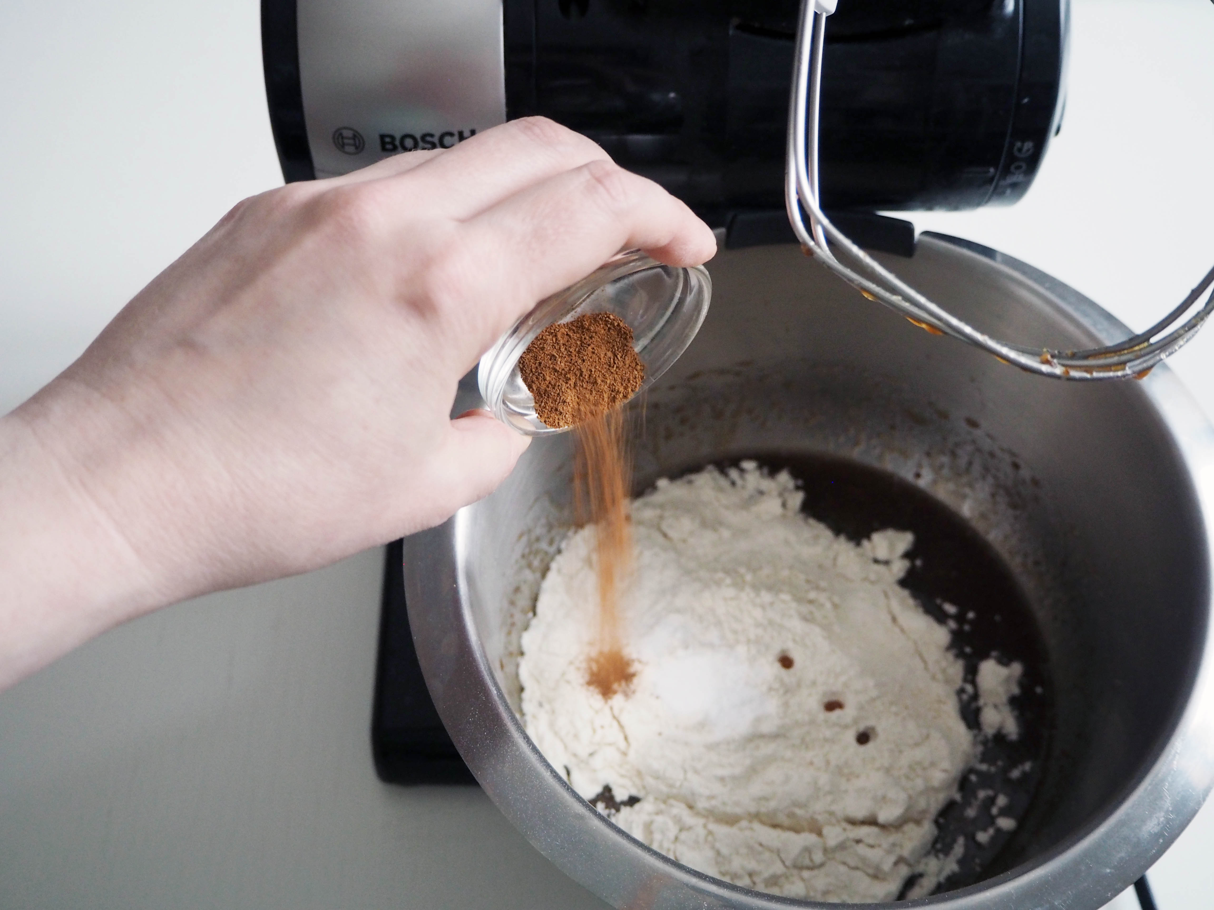 4. Add flour, baking soda, cinnamon, ginger, cloves and nutmeg and continue beating.