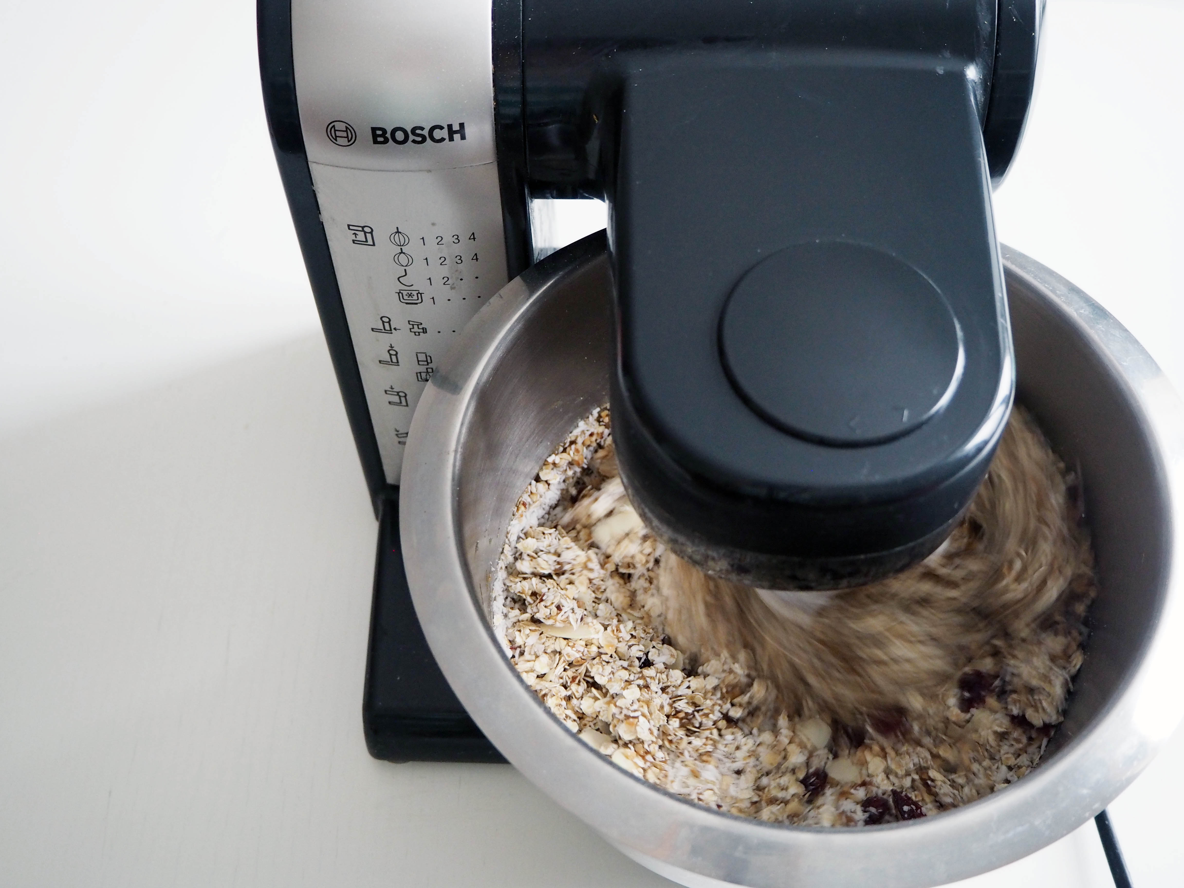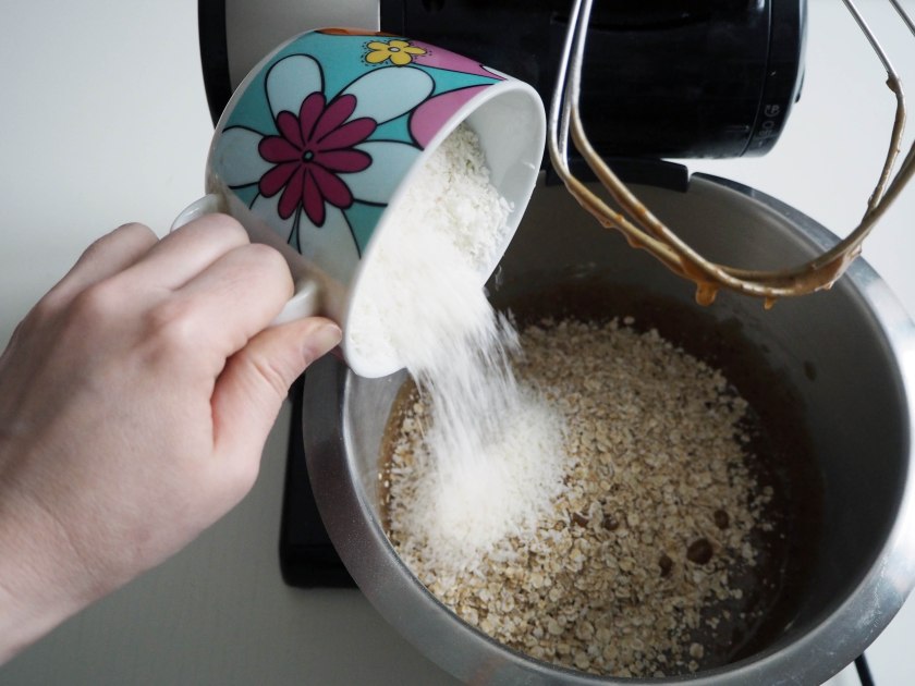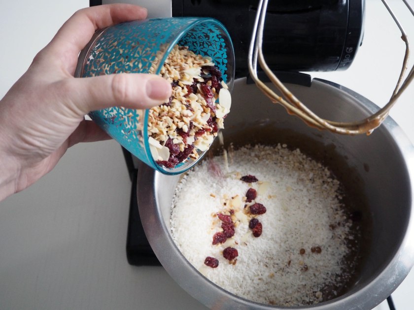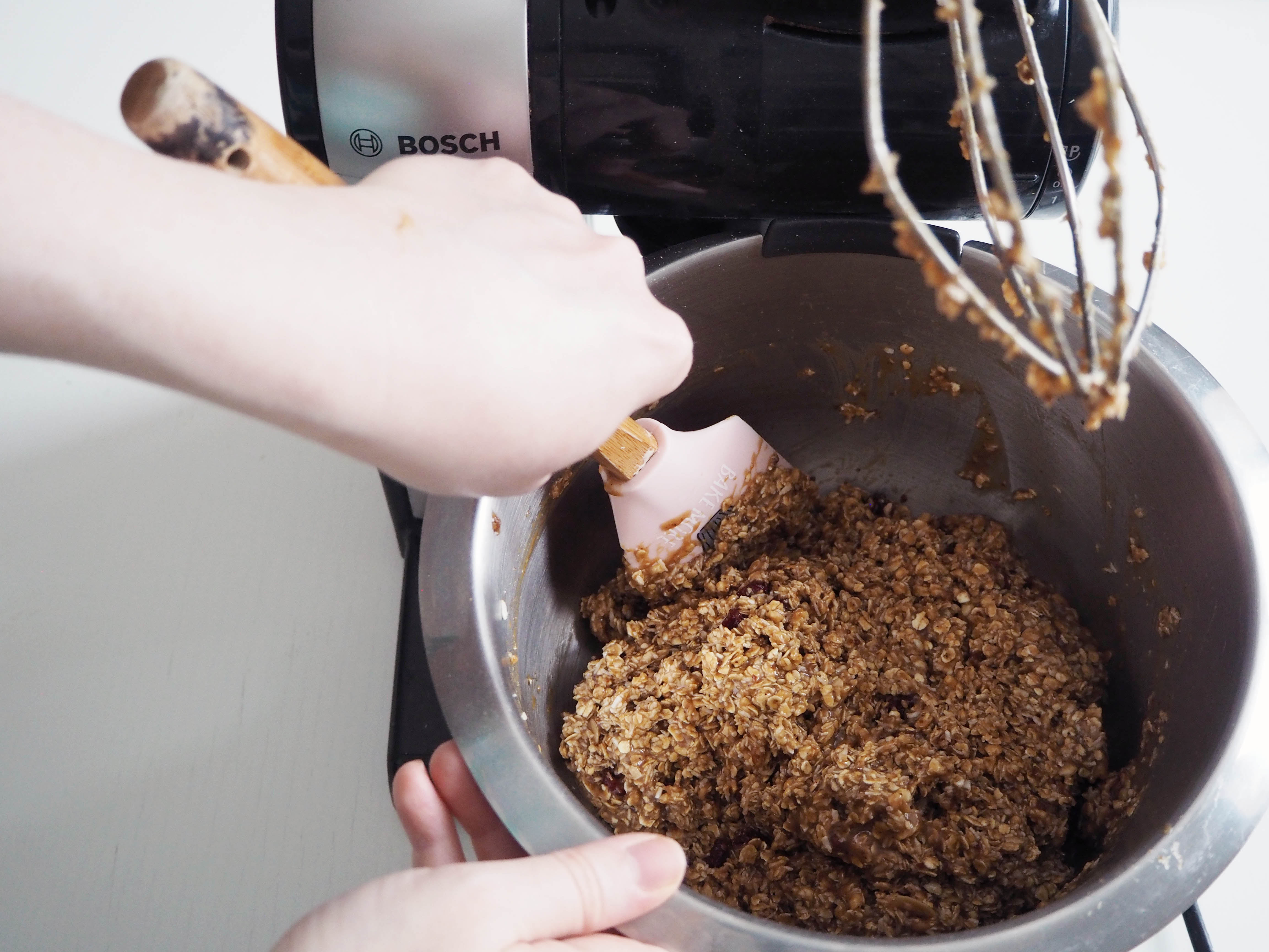 6. Add rolled oats, desiccated coconut and cranberry-nut mixture and beat again until all ingredients are incorporated.
