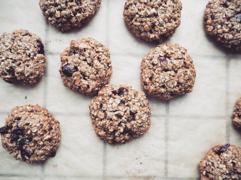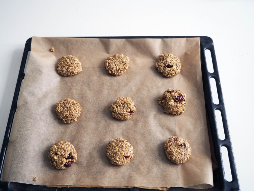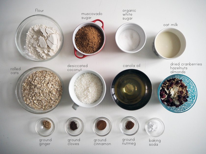 So these cookies have rolled oats, desiccated coconut, dried cranberries, chopped hazelnuts, sliced almonds and a few spices, like cinnamon and nutmeg. They are vegan with oat milk and canola oil as liquid ingredients.