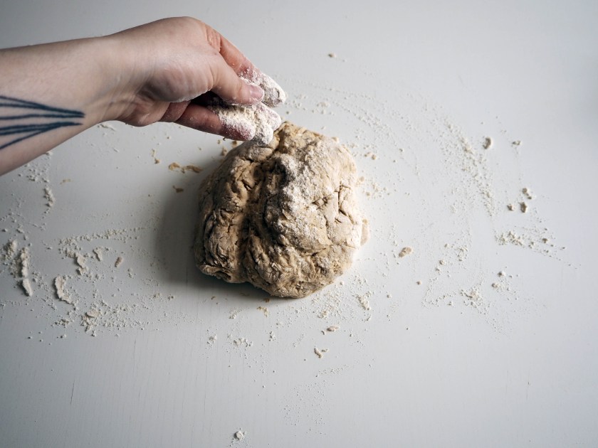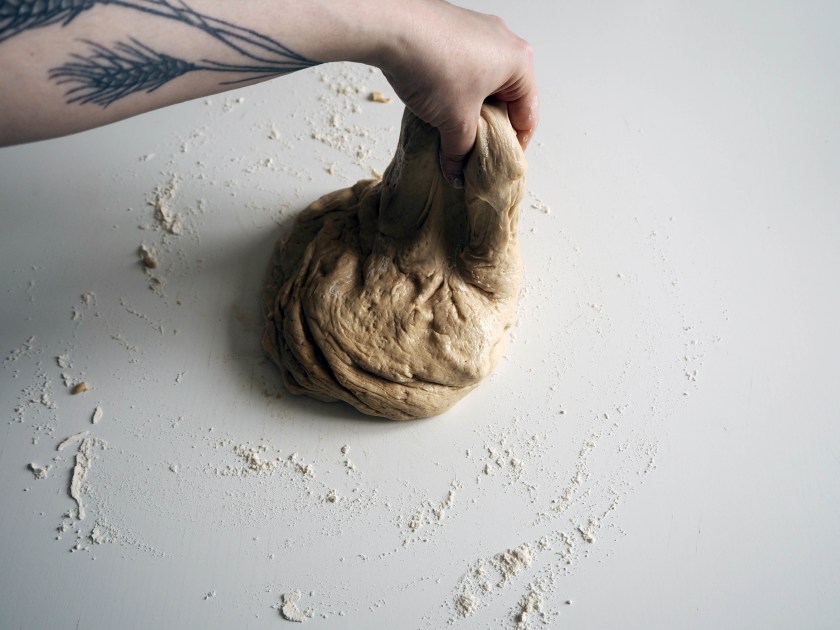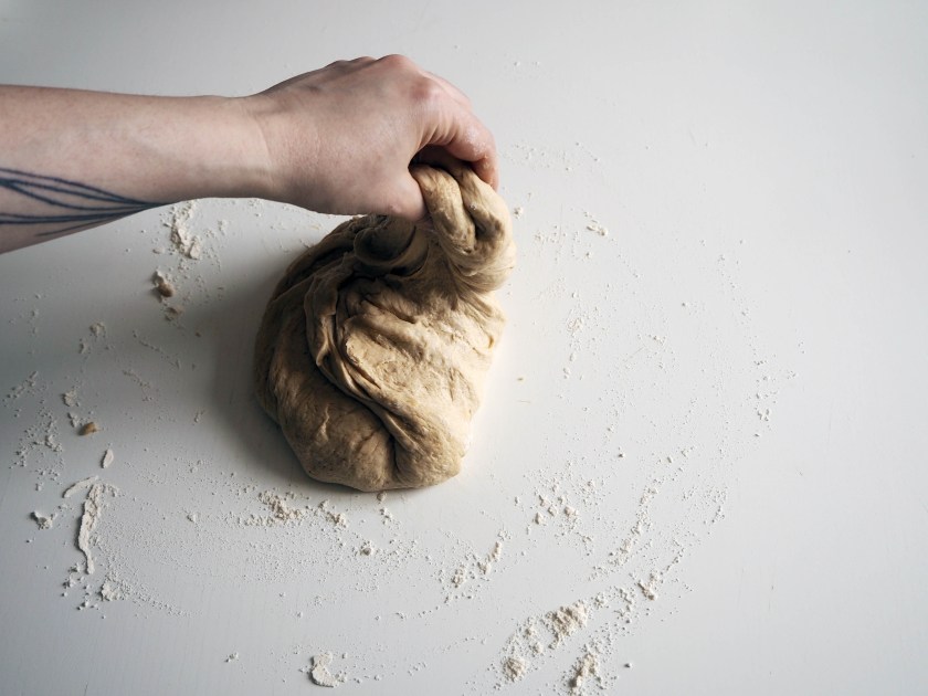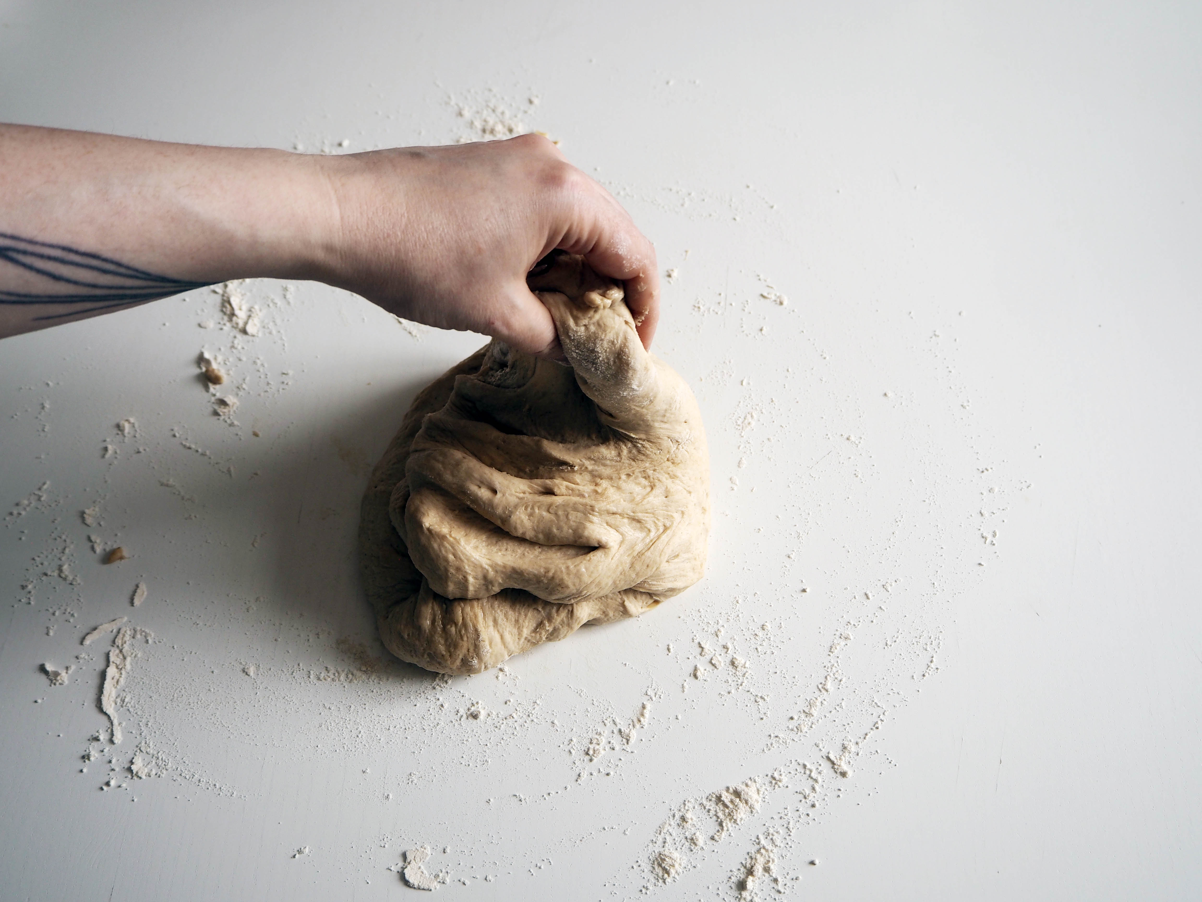 4. Gently dust your working surface with bread flour and put the dough on it. Dust the top of the dough with a little more bread flour and start kneading. Knead the dough for at least 5 minutes, until you get a soft, elastic, smooth dough.