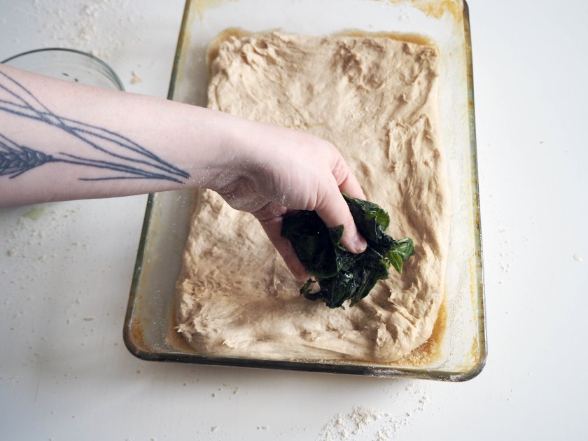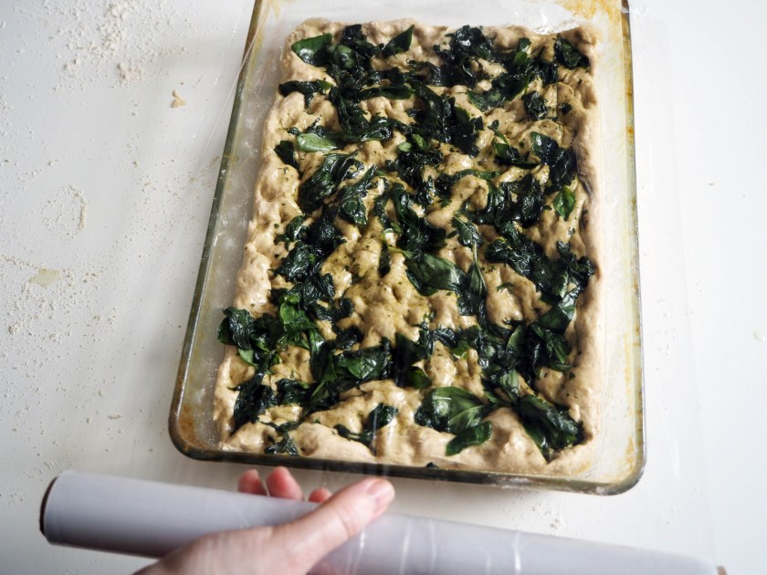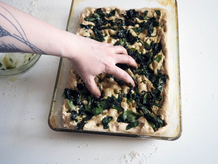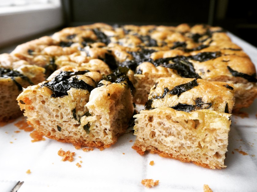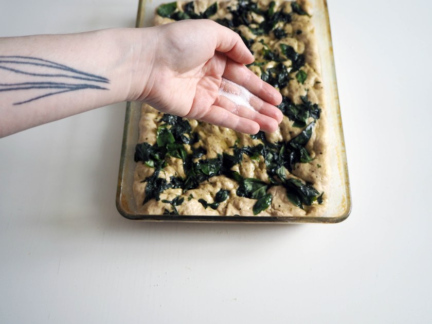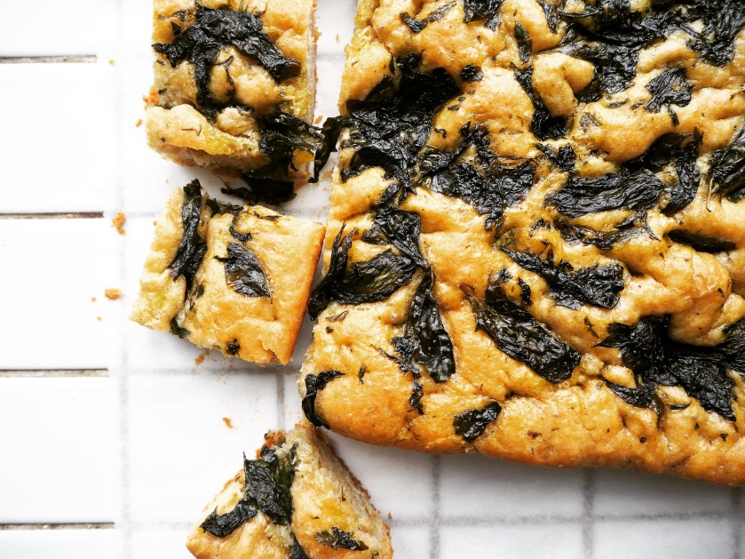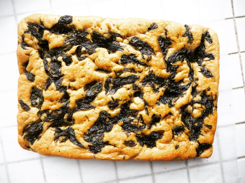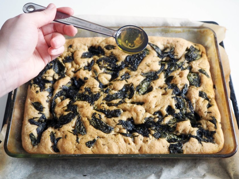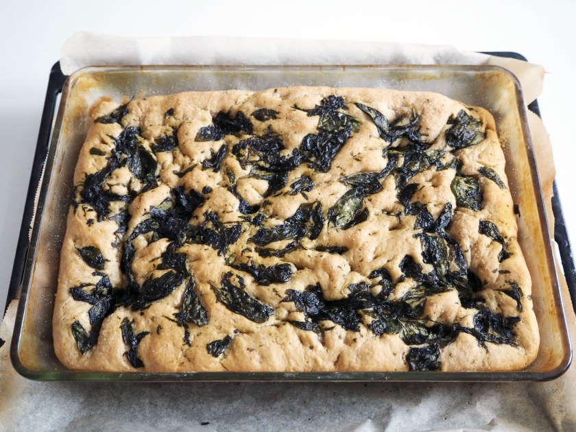 The smell of basil has to be one of the best things in the world. It brings a fresh, soft taste to anything it is added to. It even goes well in a sweet cake as I used in one of my recipes a few weeks ago (blogpost here). This focaccia bread is full of fresh basil and olive oil – there’s a lot of both, but it’s not overwhelming.