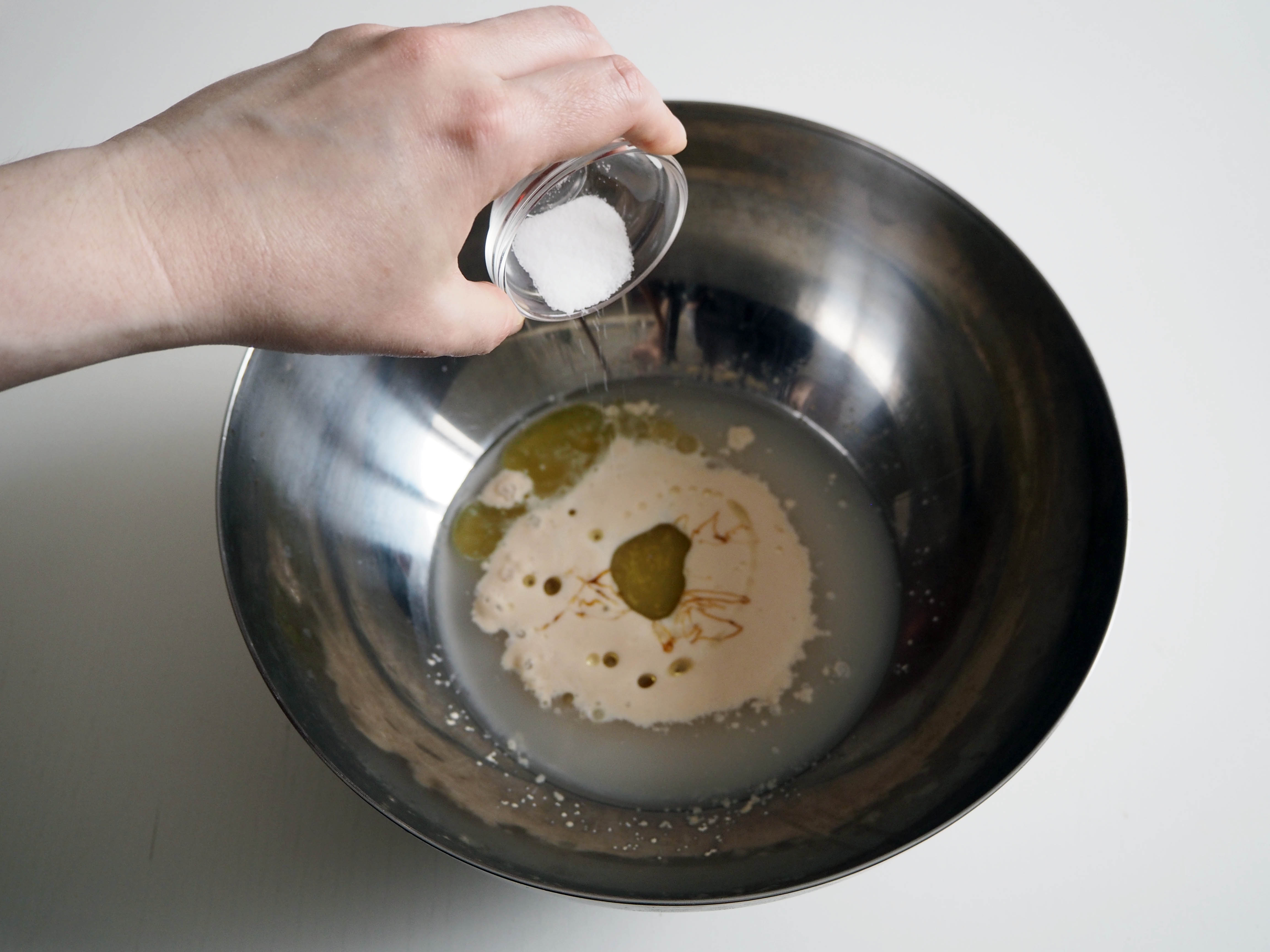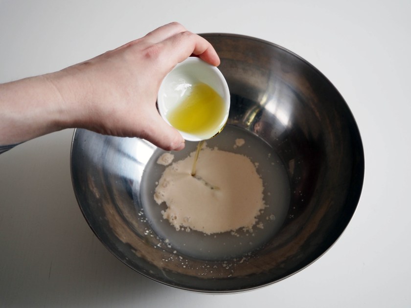 2. After 10 minutes, there should be a little foam on top of the water, which shows that yeast is active. At this point, put olive oil, syrup and salt and mix well.