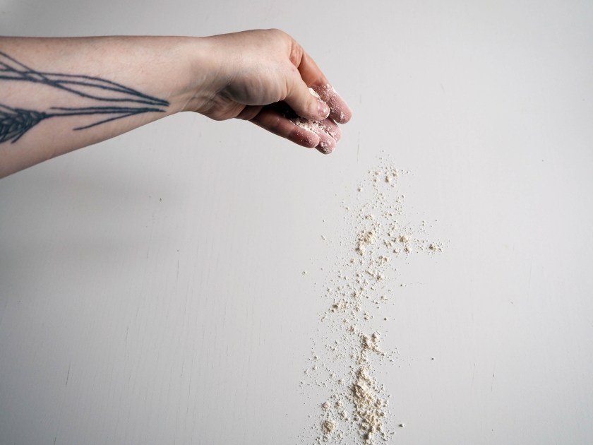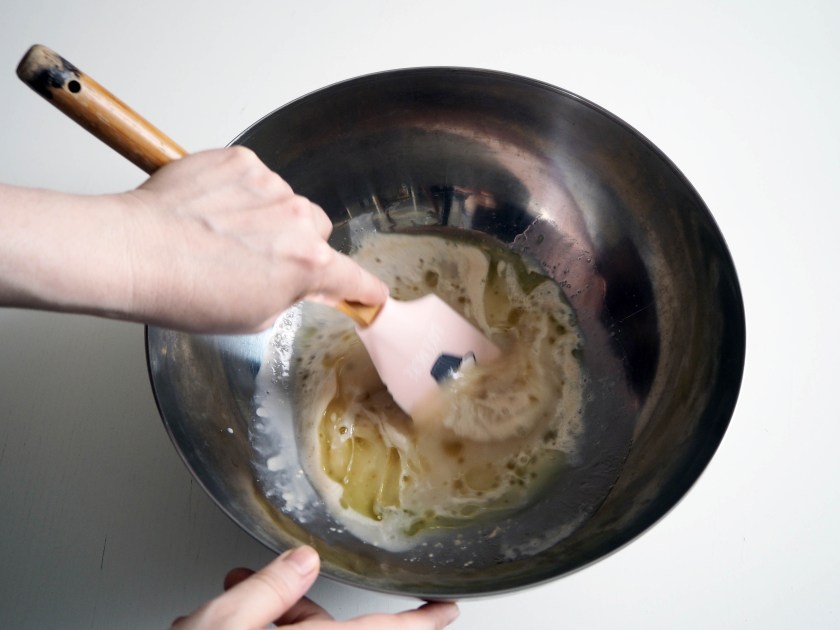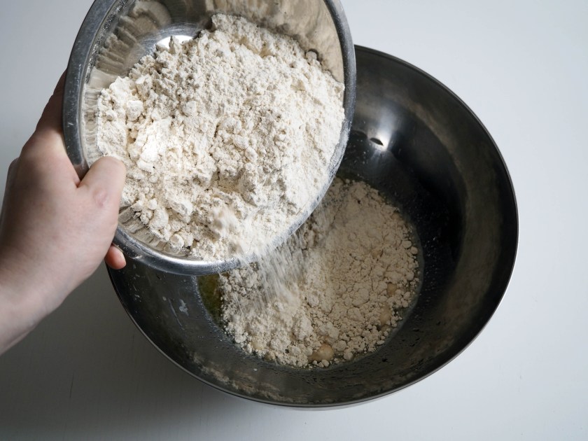 3. Gradually add bread flour and mix / fold until it forms – loose – dough.