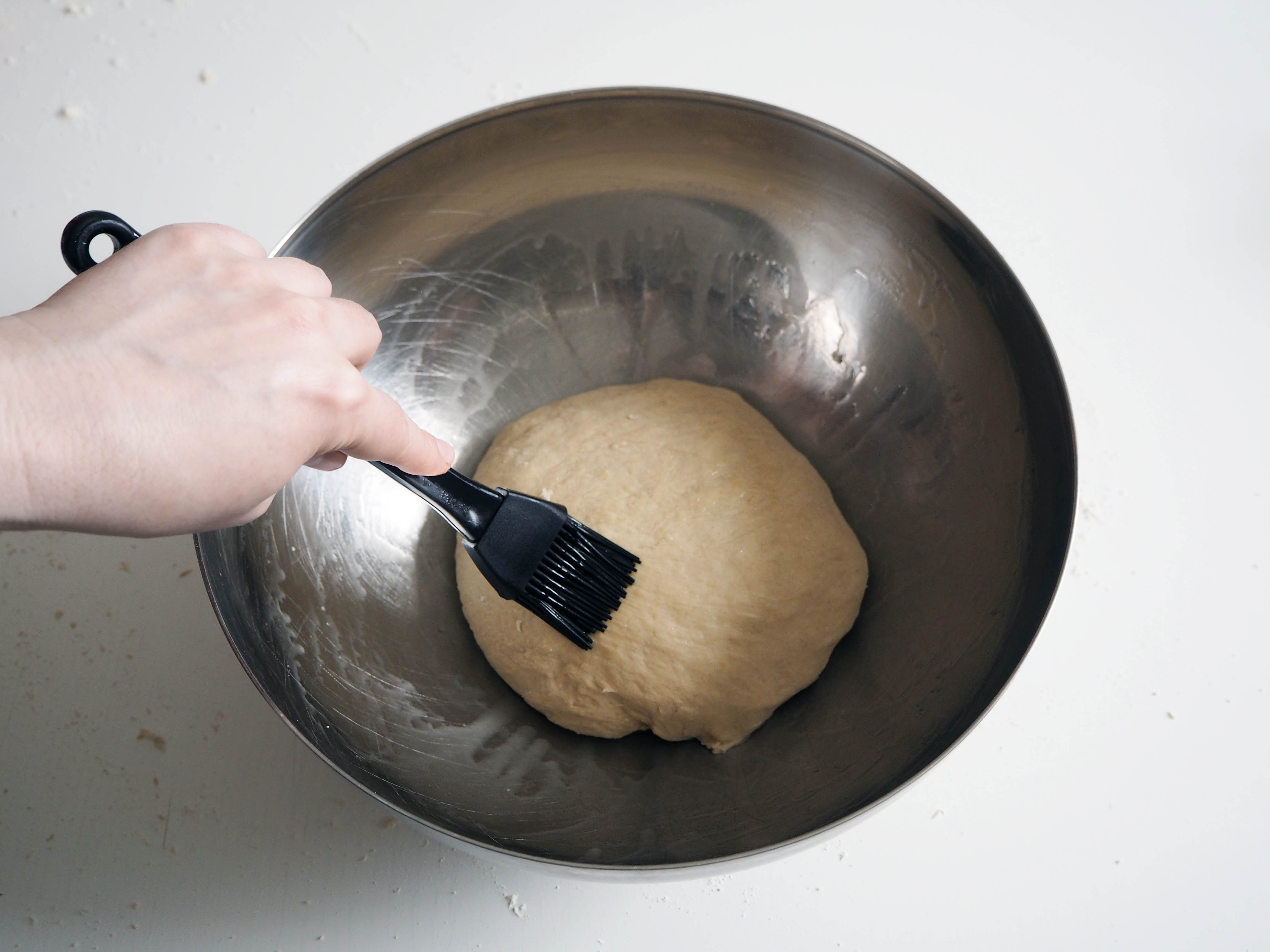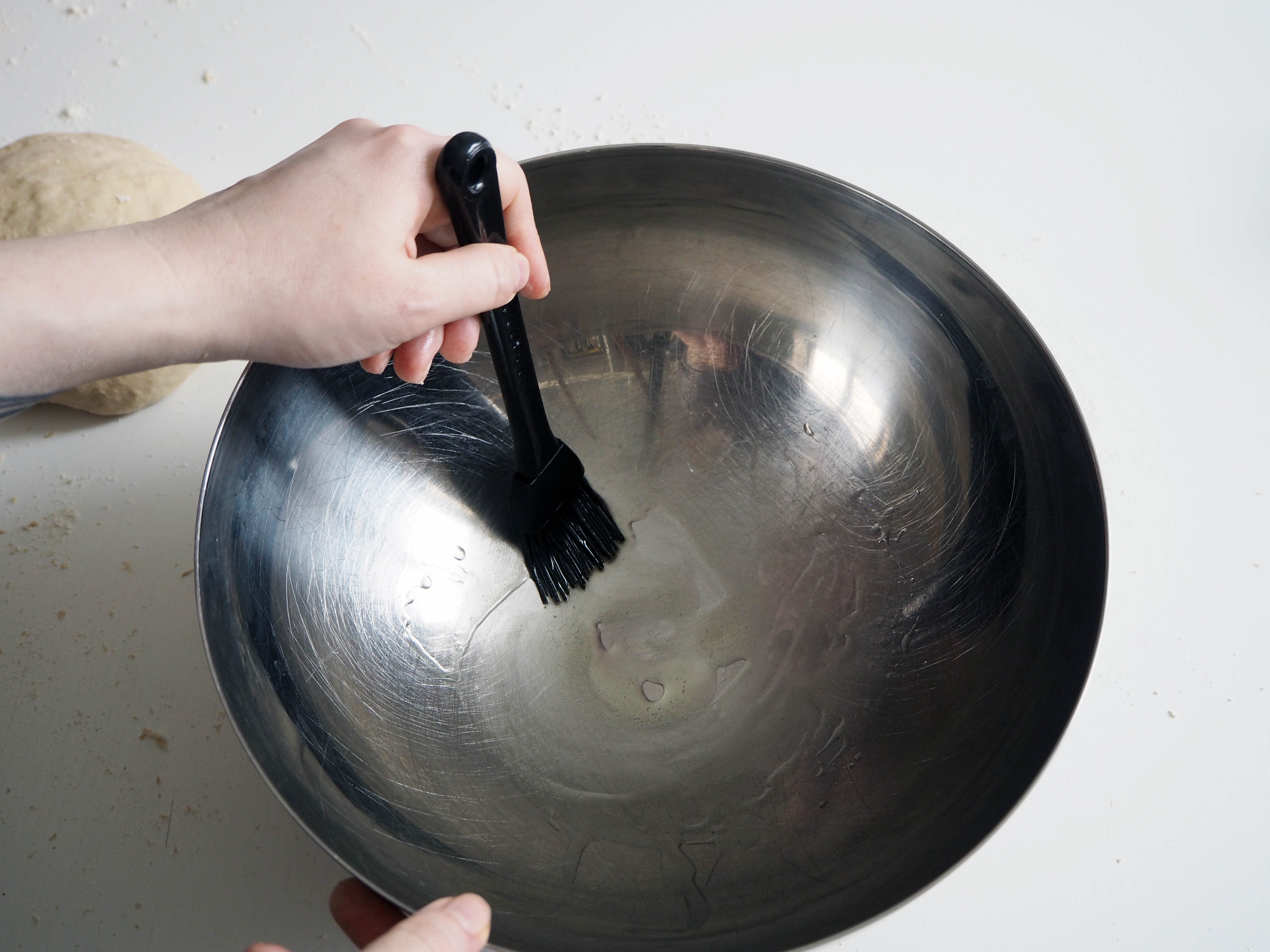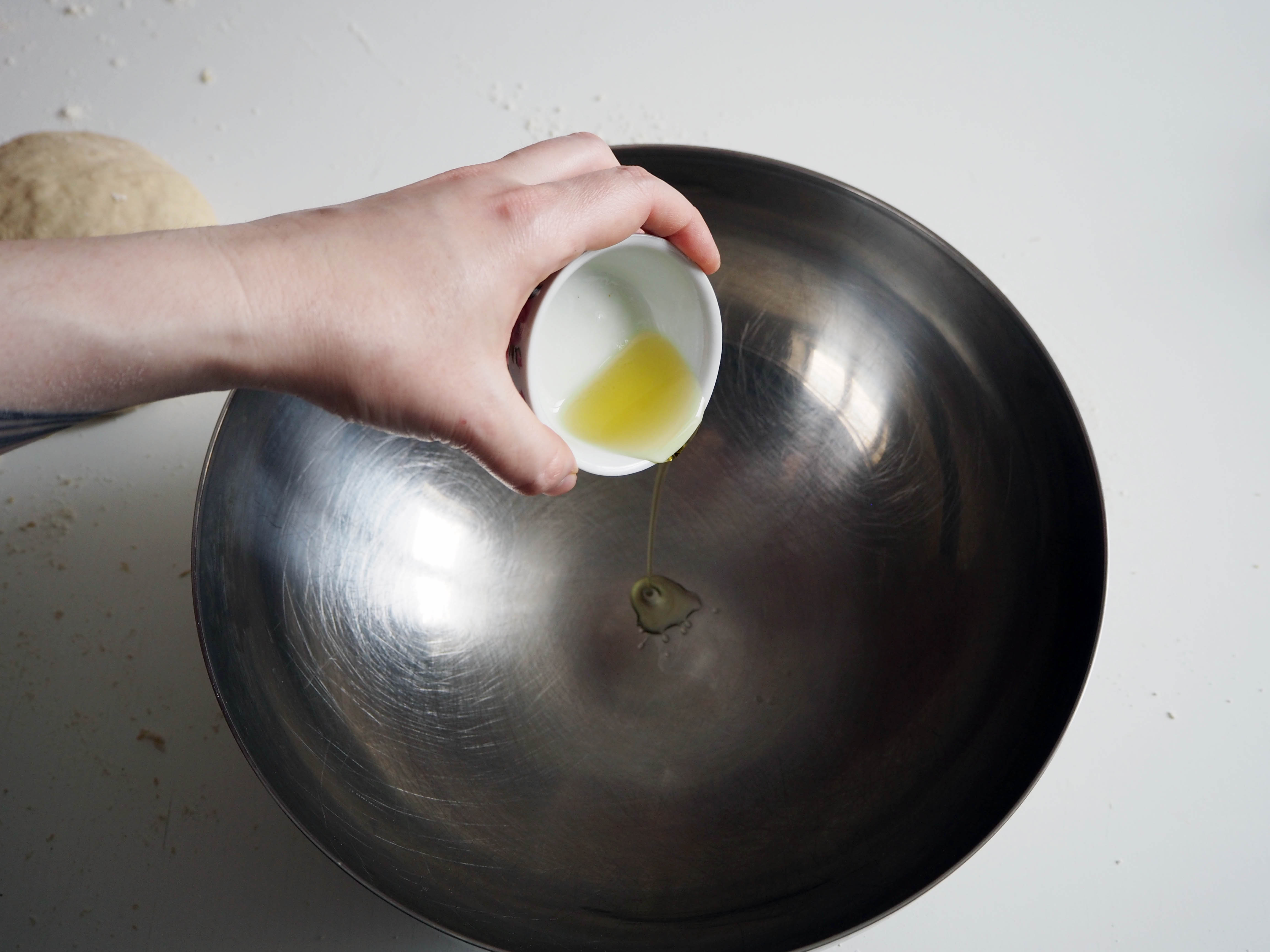 5. Get a clean bowl and brush the inside with olive oil. Put bread dough in it, brush the surface of the dough lightly with olive oil as well. Cover the bowl with stretch film and put the bowl in a warm spot in your kitchen. Leave the dough to double in size, for about 1 hour (it may take longer or shorter depending on how warm your kitchen is).
