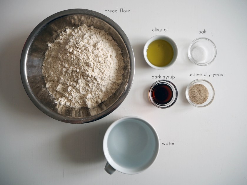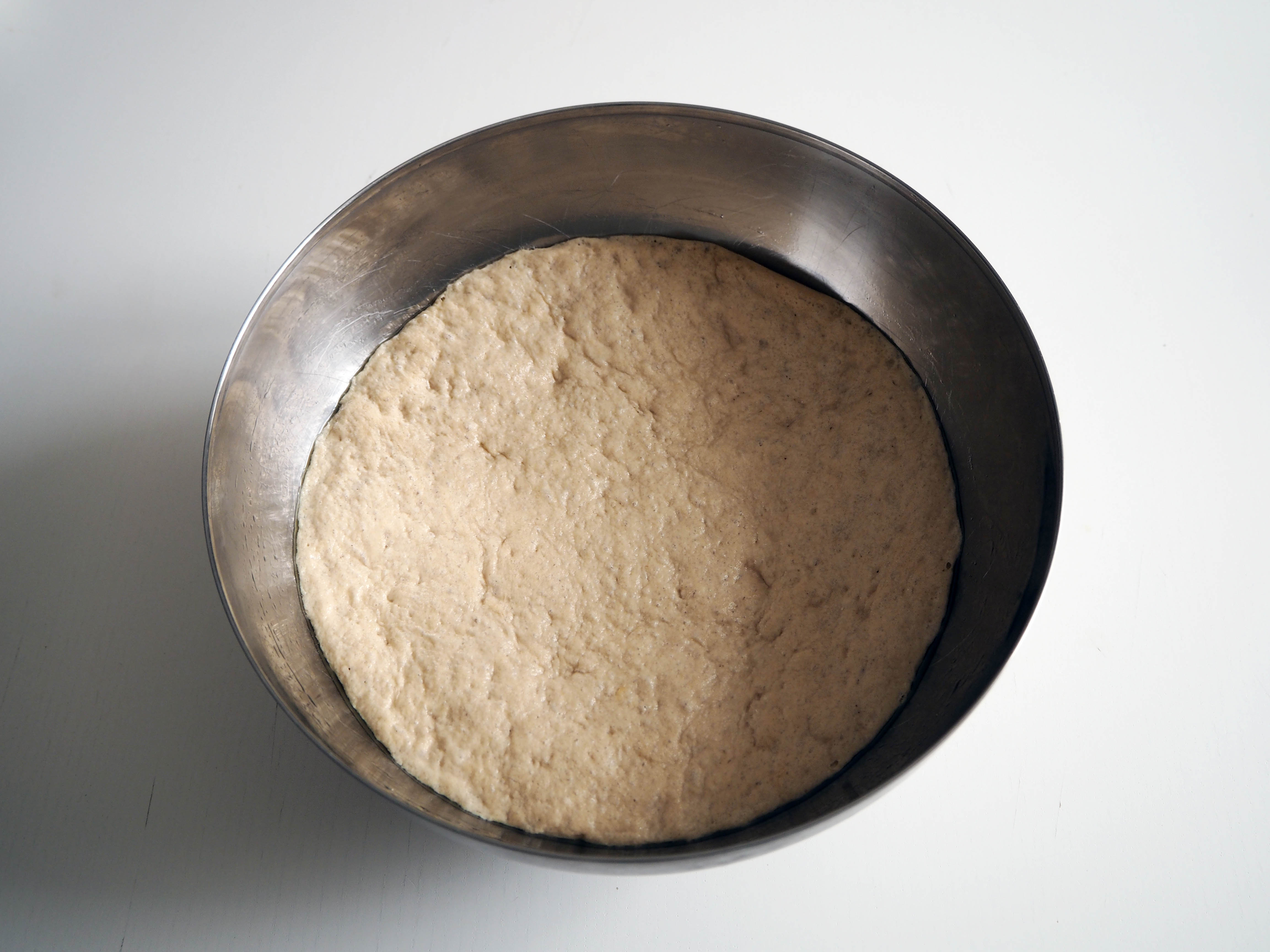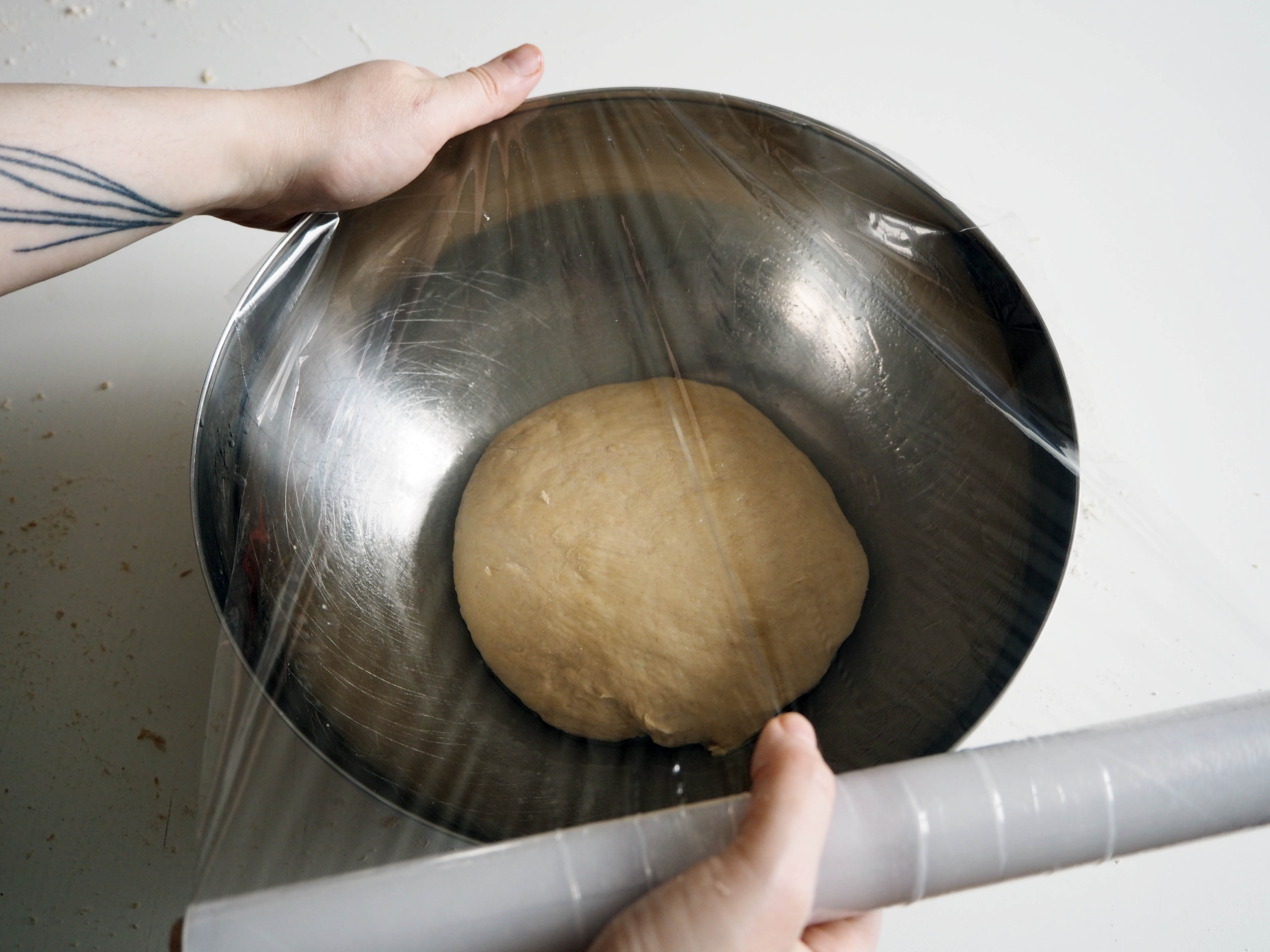 5. Get a clean bowl and brush the inside with olive oil. Put bread dough in it, brush the surface of the dough lightly with olive oil as well. Cover the bowl with stretch film and put the bowl in a warm spot in your kitchen. Leave the dough to double in size, for about 1 hour (it may take longer or shorter depending on how warm your kitchen is).