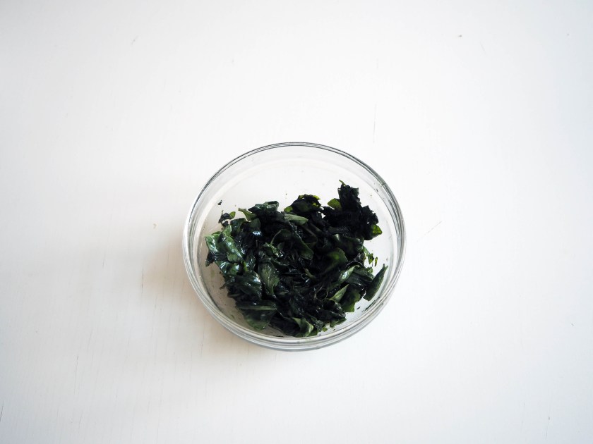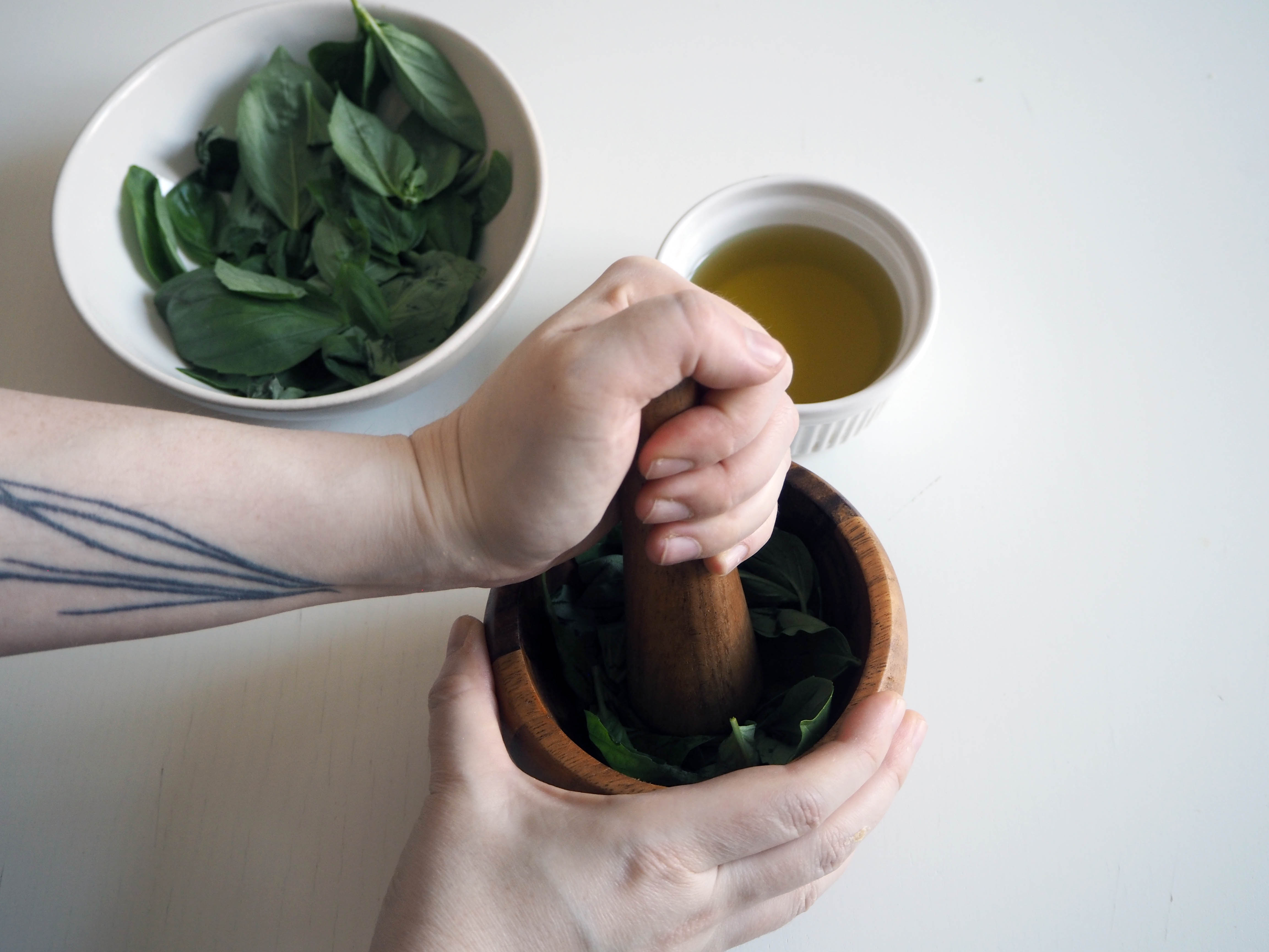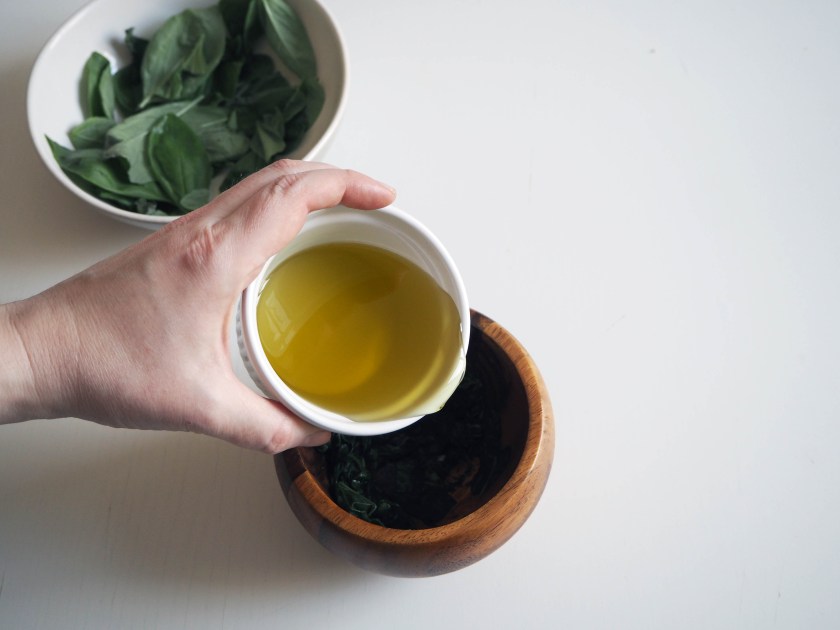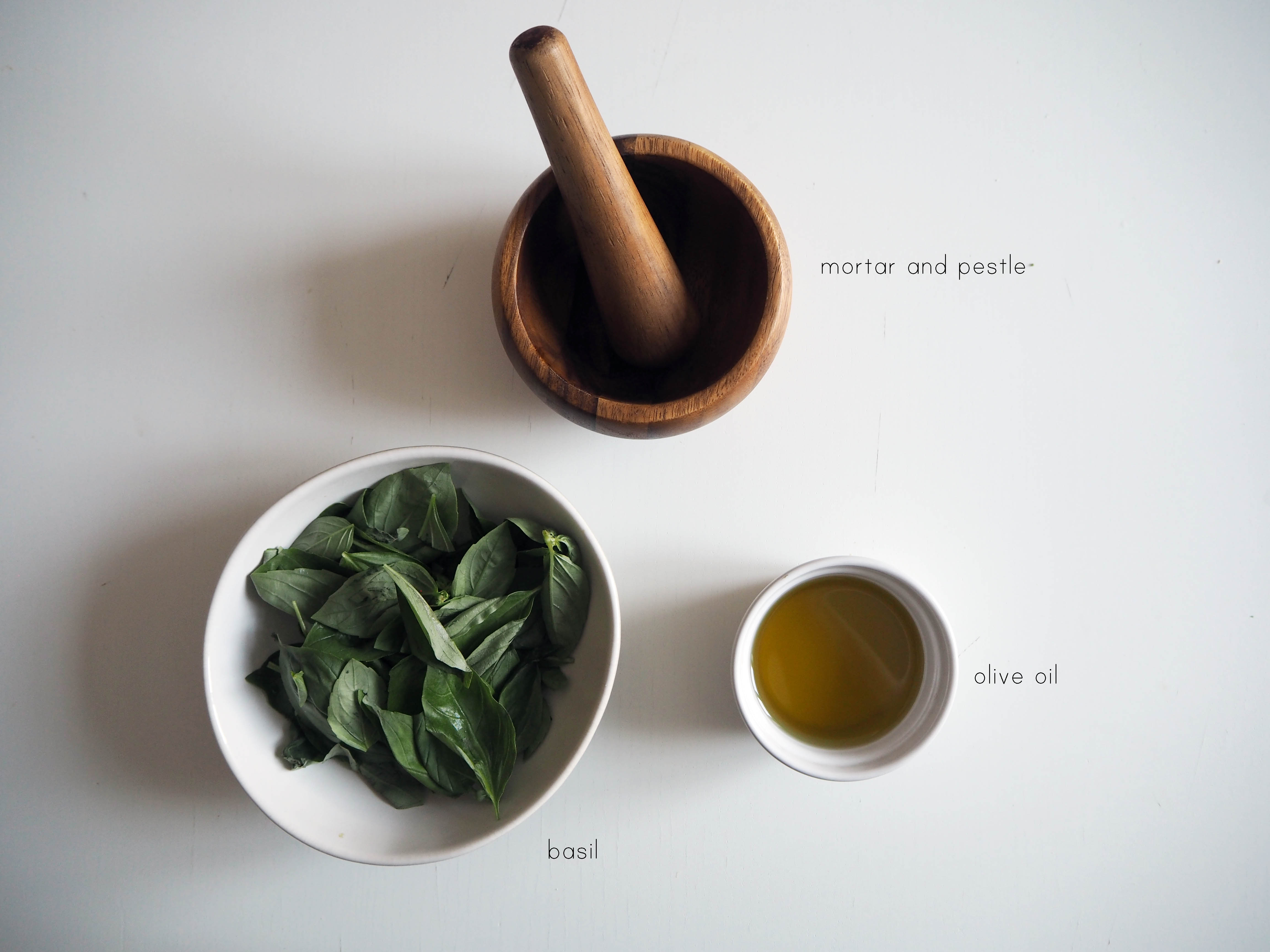 6. While dough is rising, prepare the topping. Using mortar and pestle, beat fresh basil leaves until they are fragrant and in smaller pieces. Add olive oil (1 tbsp at a time, since 4 tbsp might be too much to put in one go) and continue beating. Put aside.