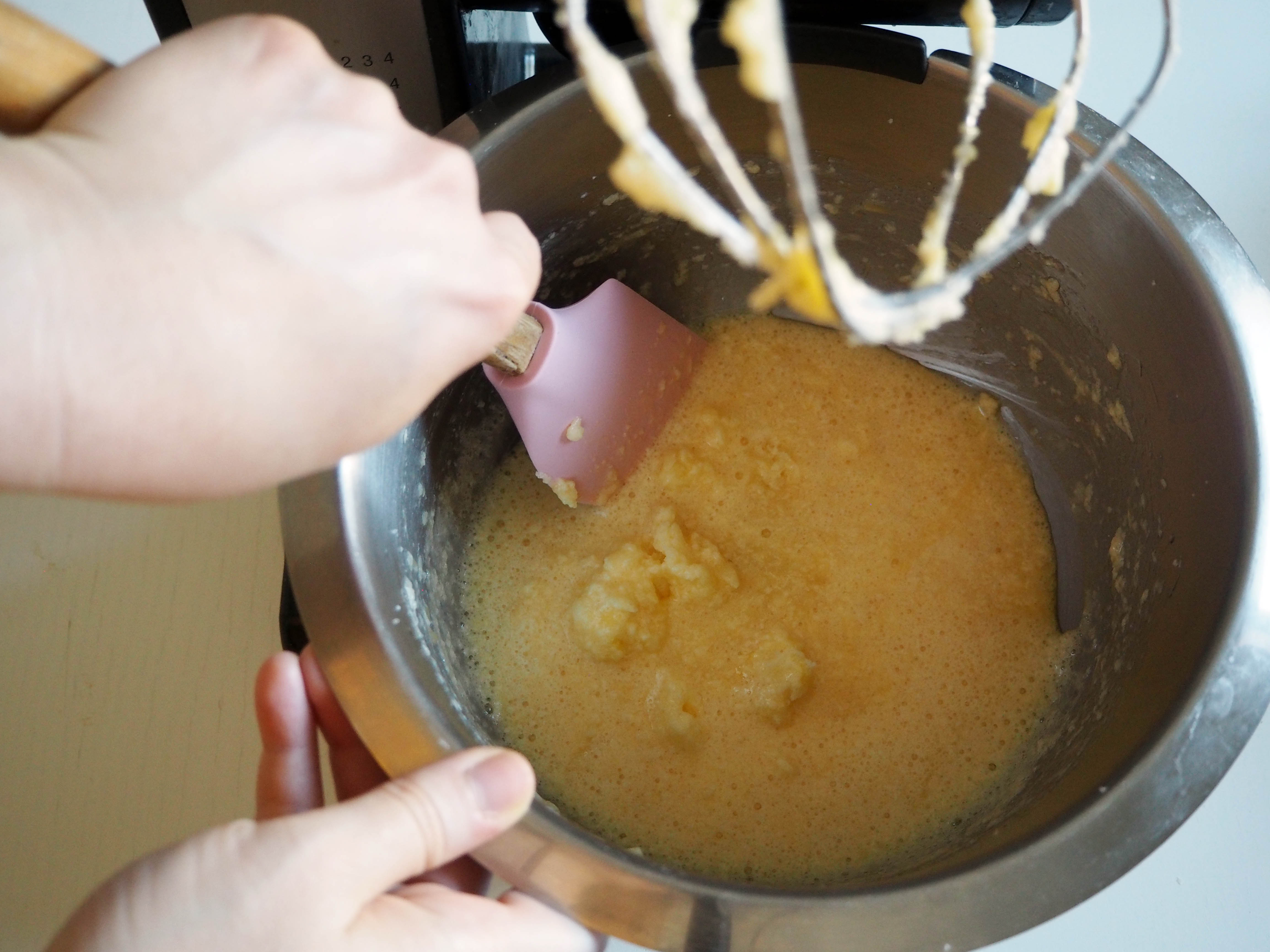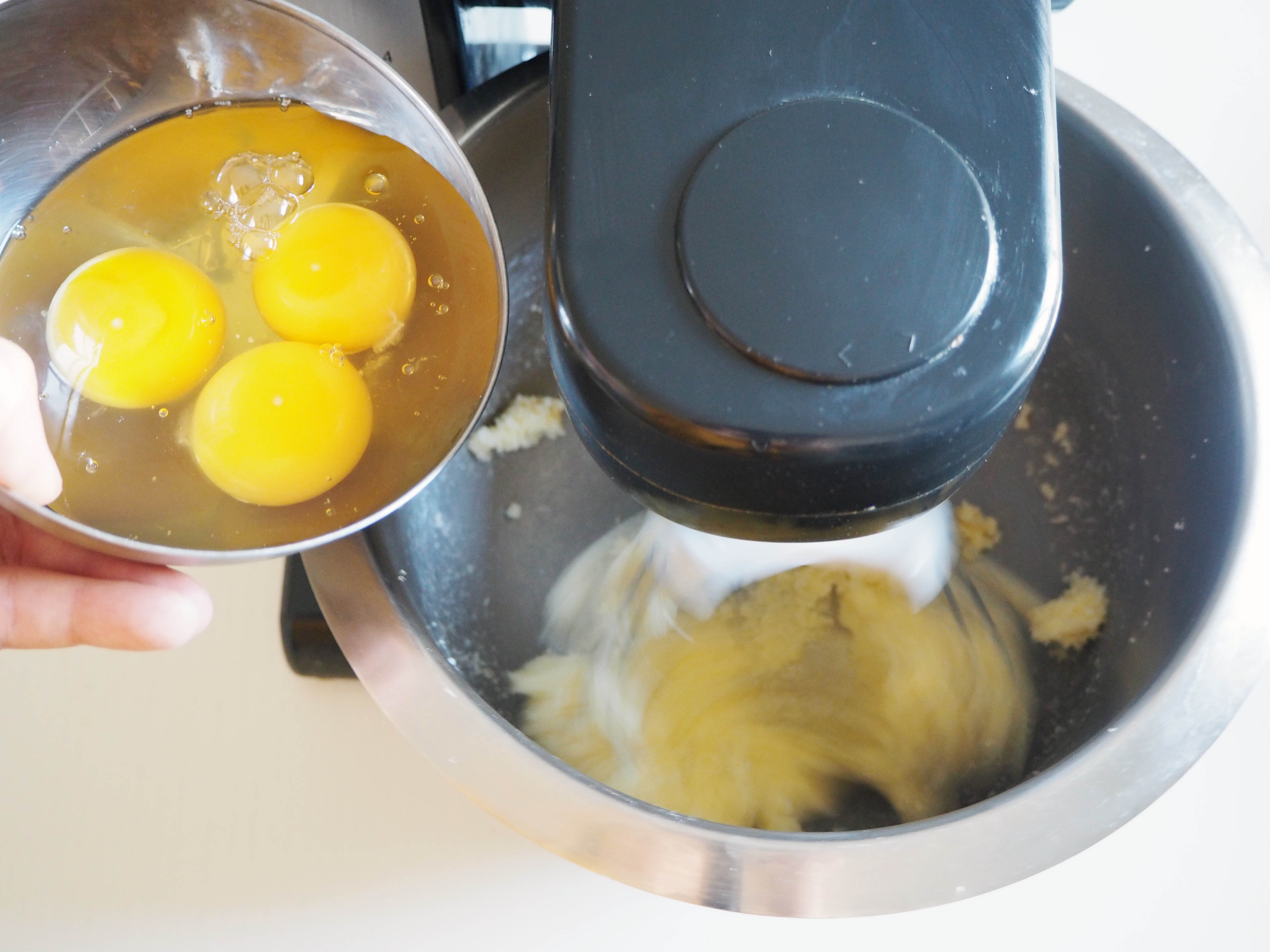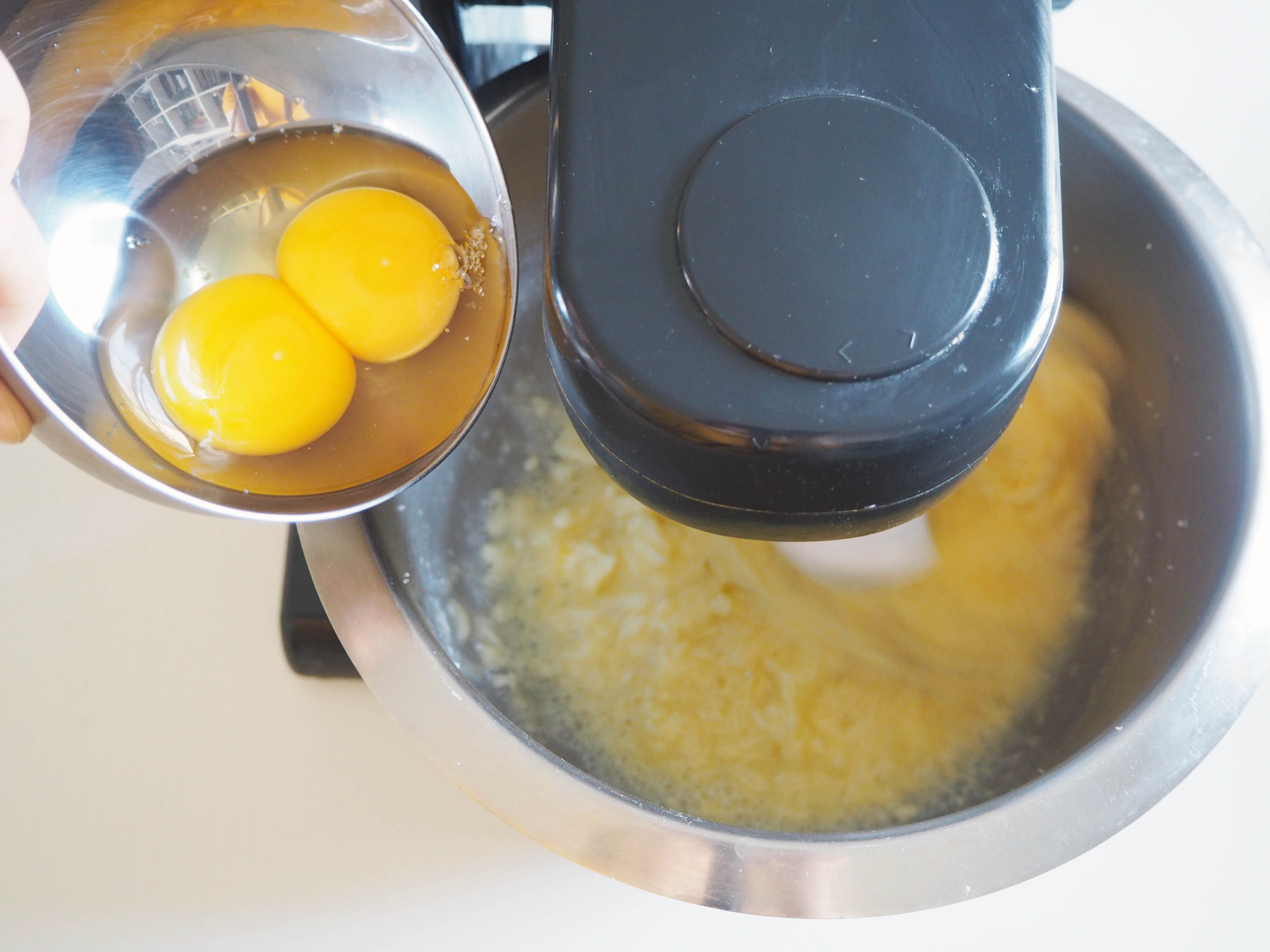3. Add eggs, one by one, and beat until you get a smooth, creamy mixture. Scrape the sides using a spatula, if needed.