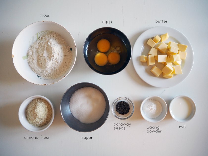This cake is a very basic and easy one actually. The ingredients are not strange at all, flour, butter, sugar, baking powder, milk. The only interesting and sort of, different, ingredient is caraway seed. Yet, I like using caraway seeds in salty recipes so I also have it in abundance.