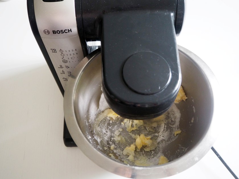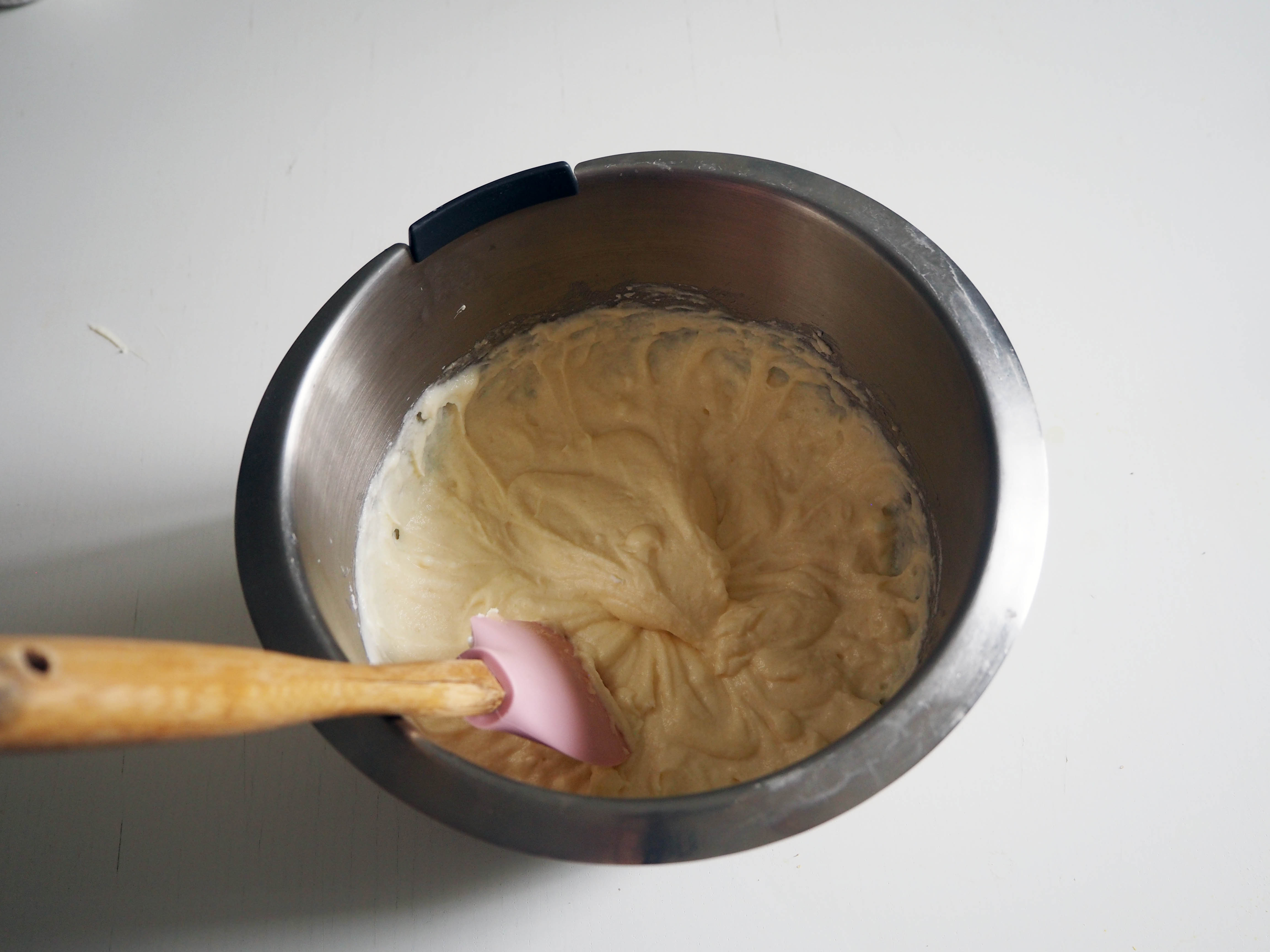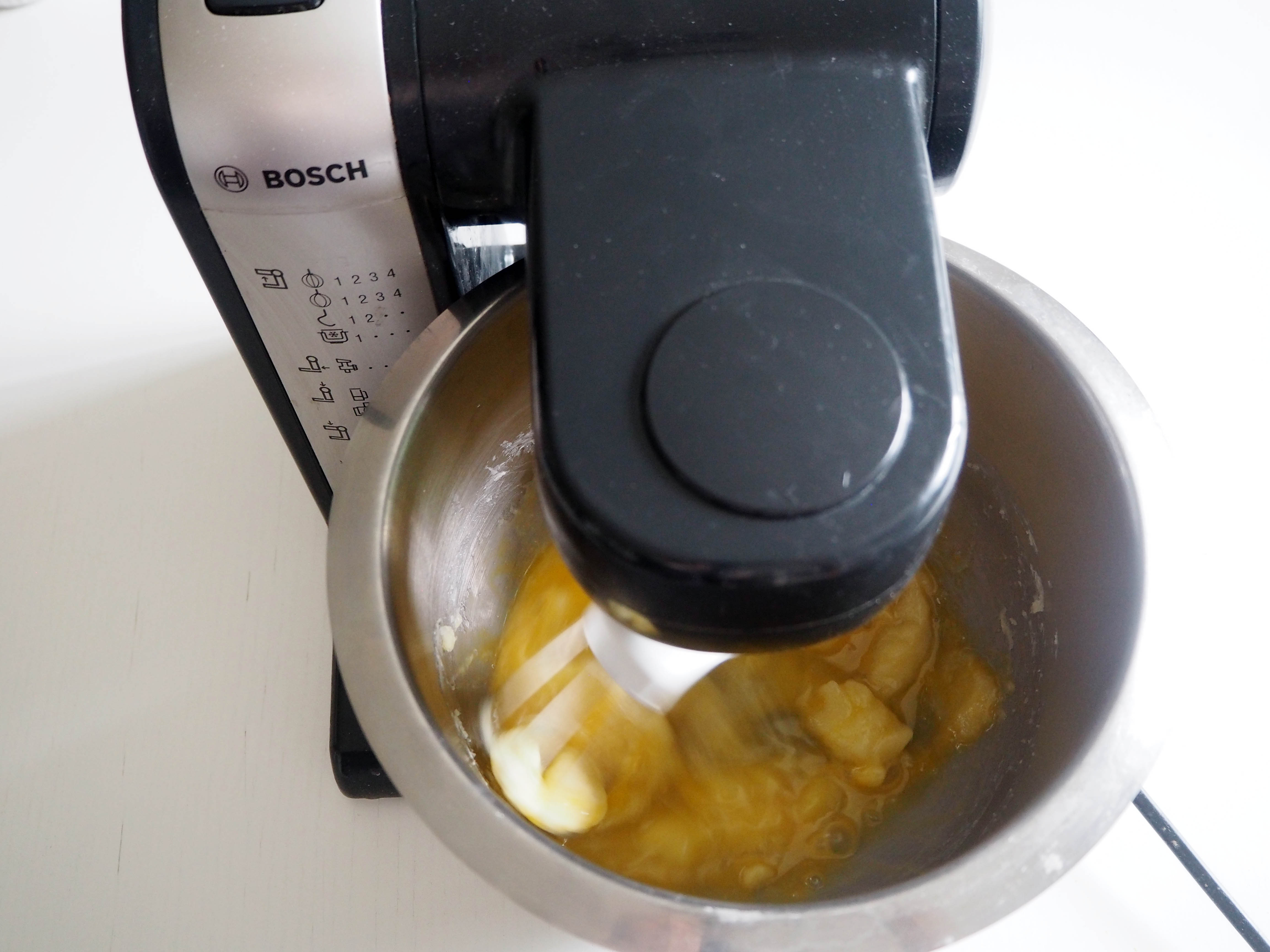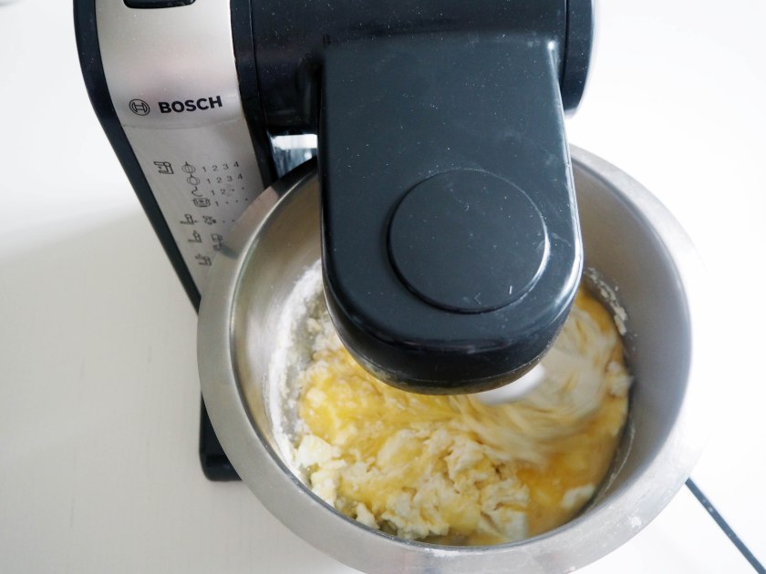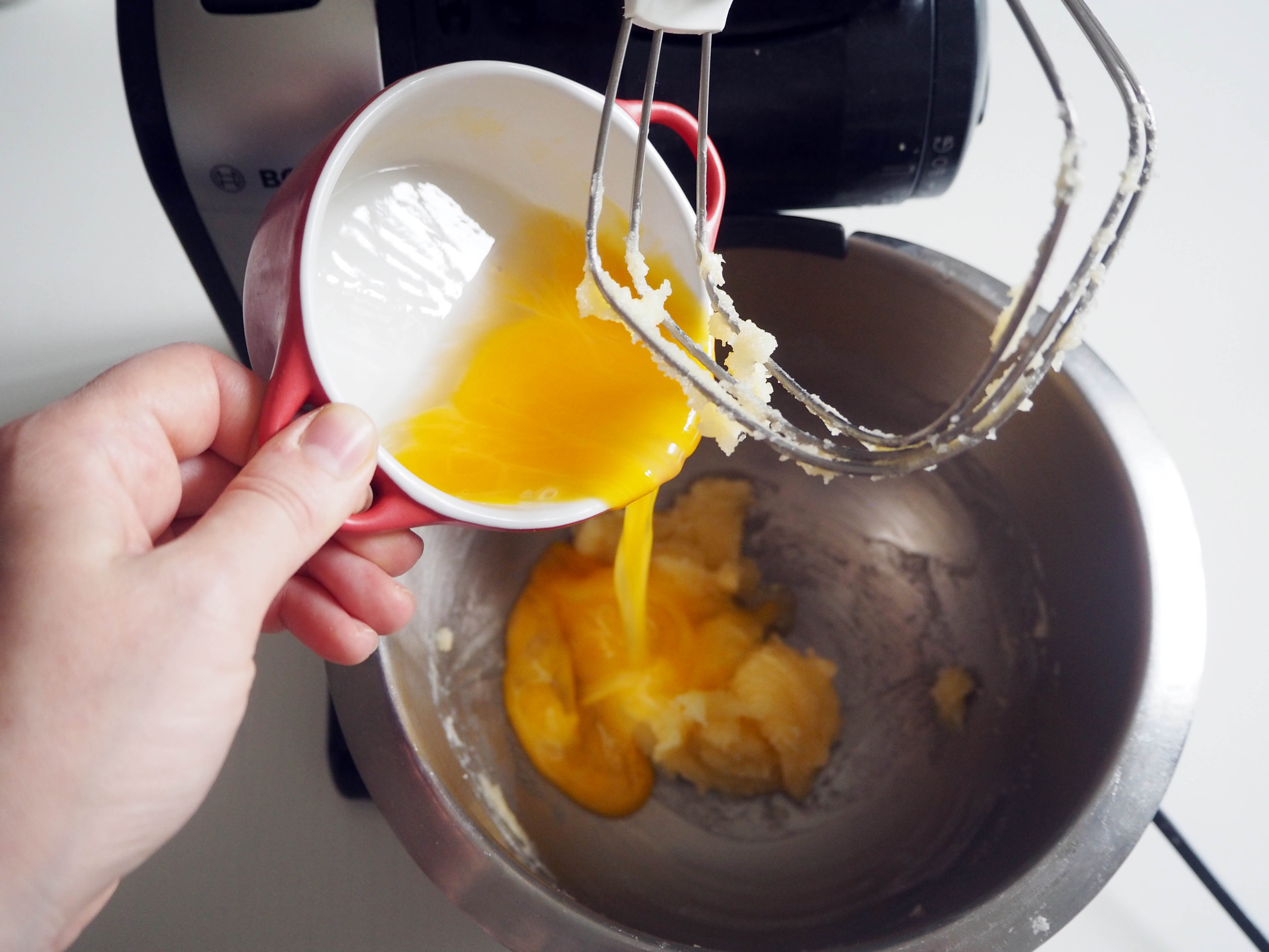 3. Add lightly beaten eggs and continue beating on medium speed until you have a smooth mixture. Scrape the sides with a spatula if you need.