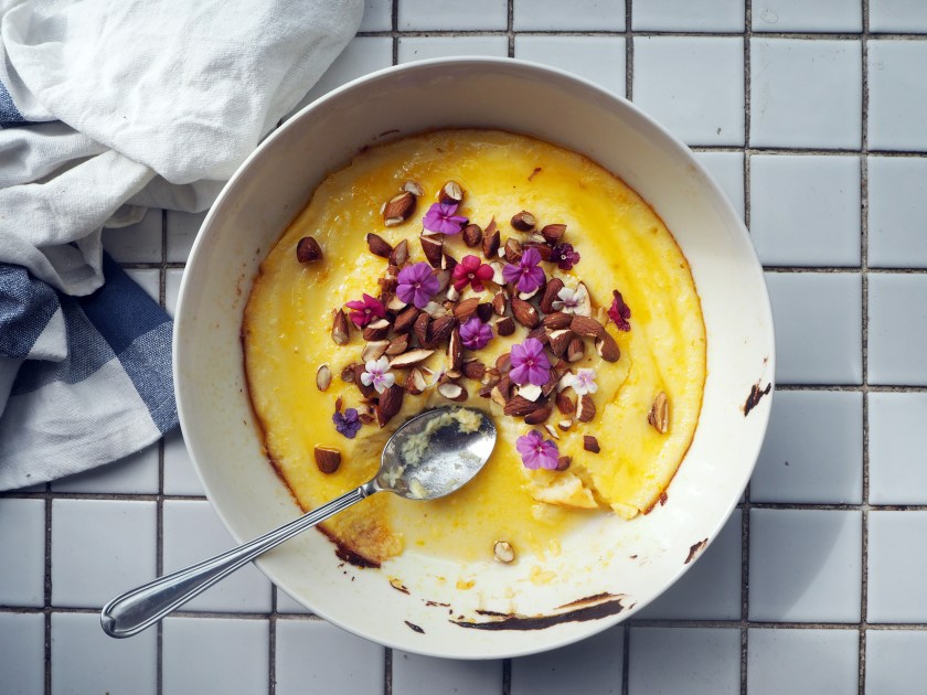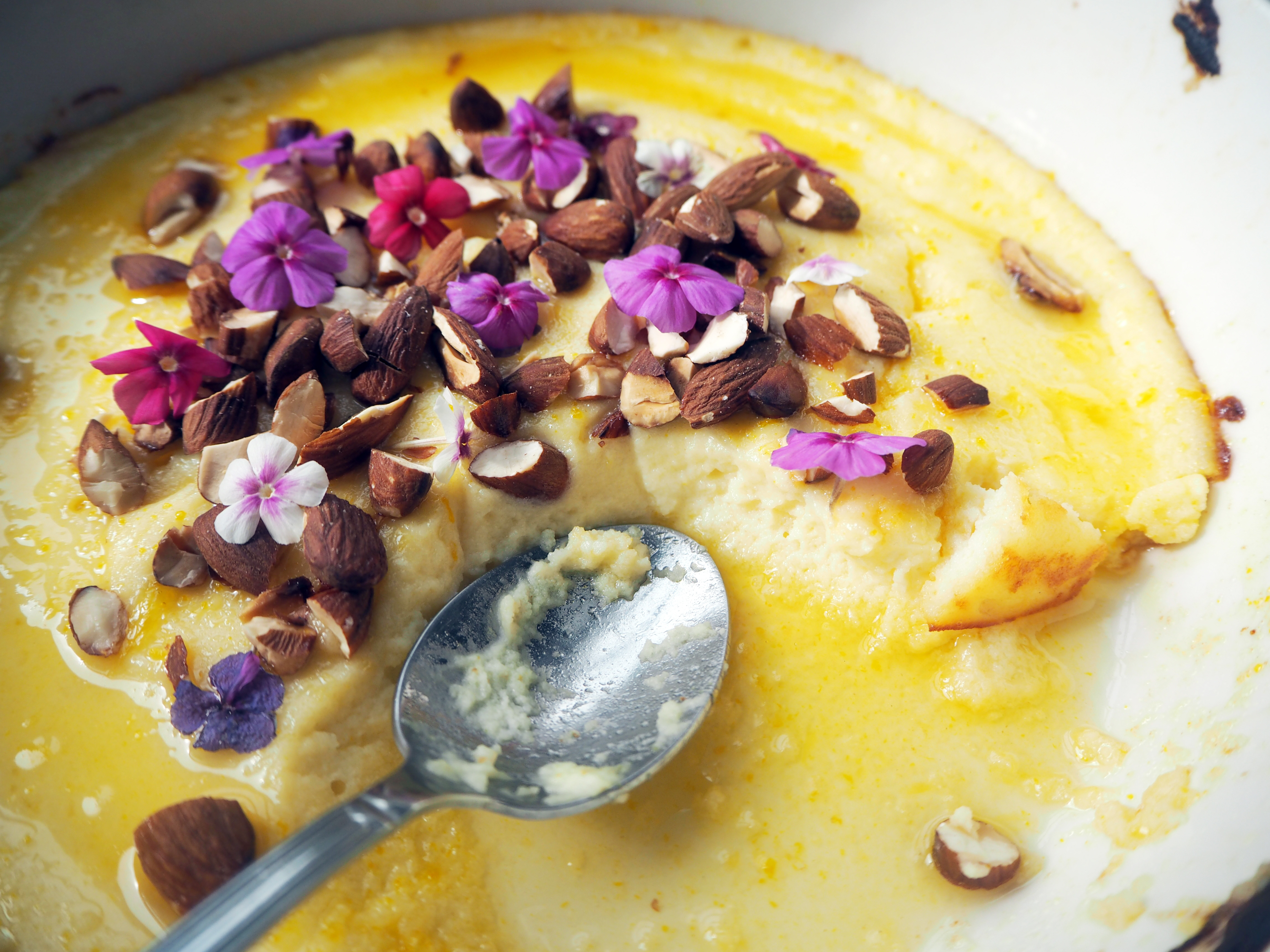 The process could not be simpler: just mix all the ingredients, put in the oven dish and bake for 20 minutes! In the meantime, make the easiest mini syrup and when the dessert is out of the oven, just pour the syrup on the hot dessert. Decorate in any way you like (toasted almonds are very tasty but you can replace it with other kinds of nuts, or even berries or summer fruits as well) and serve right away! Done!