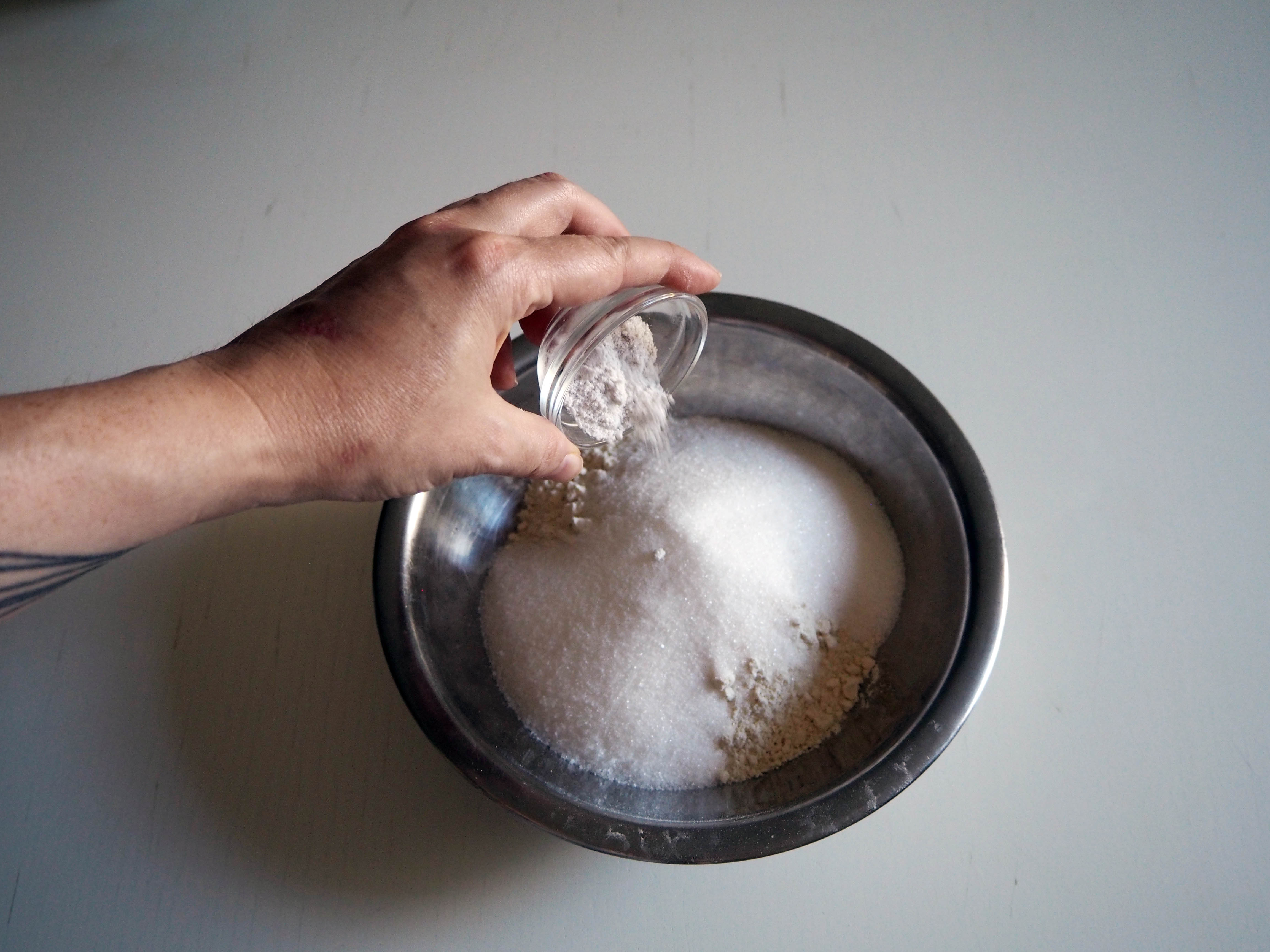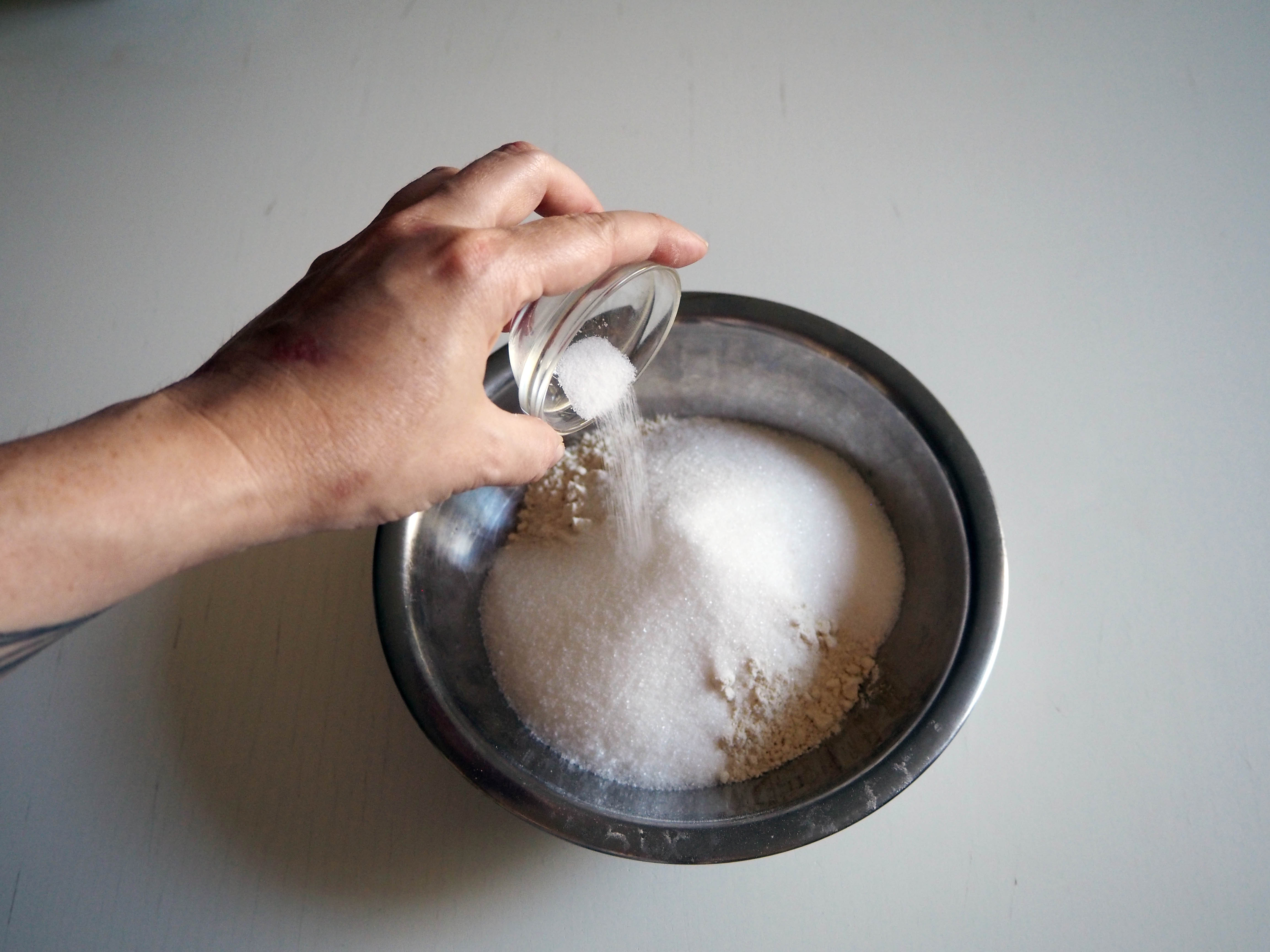 2. In a medium bowl, put flour, sugar, salt and vanilla sugar and whisk. If you are using vanilla extract instead of vanilla sugar, do not add it this time, but check step 4.