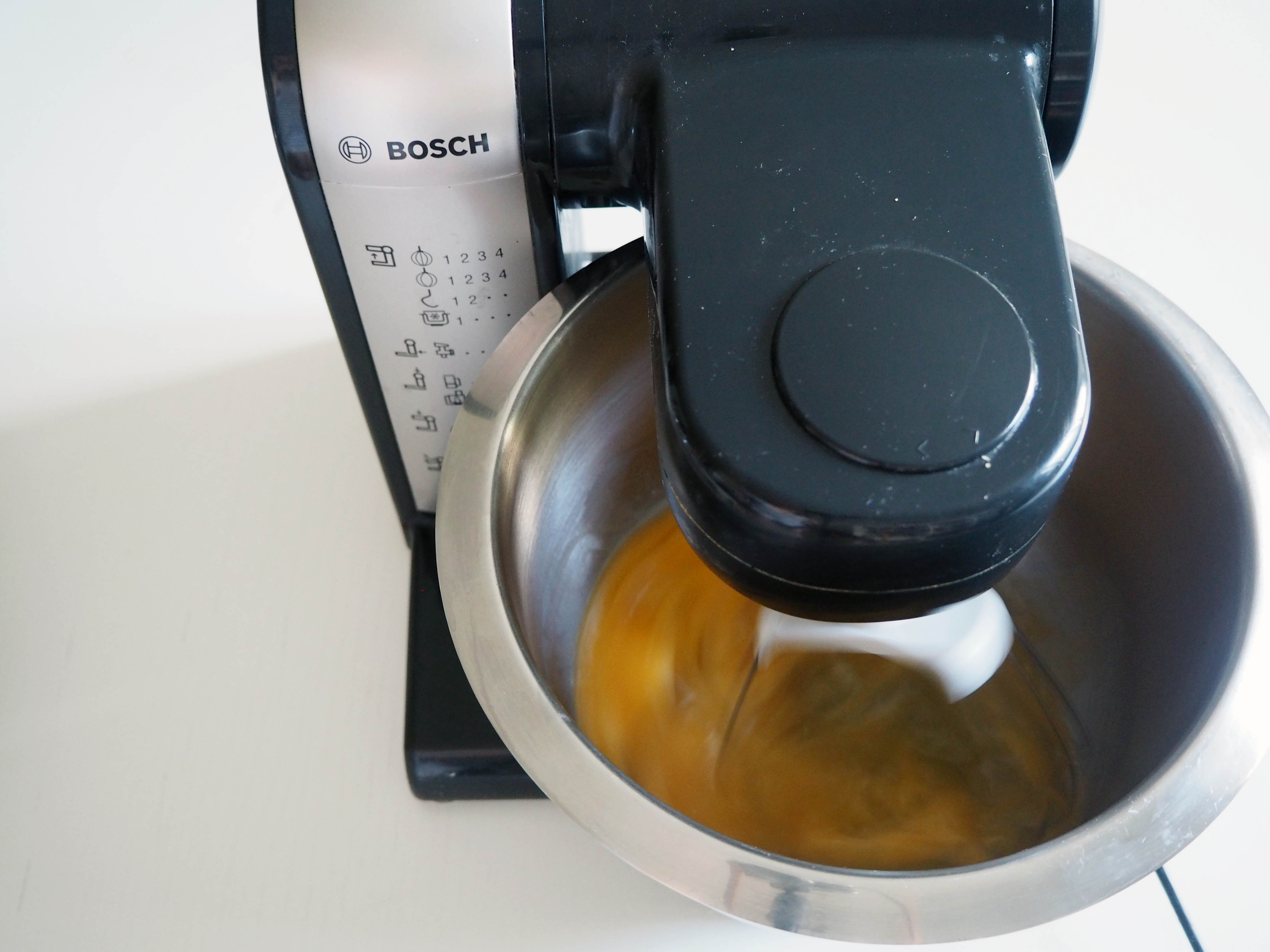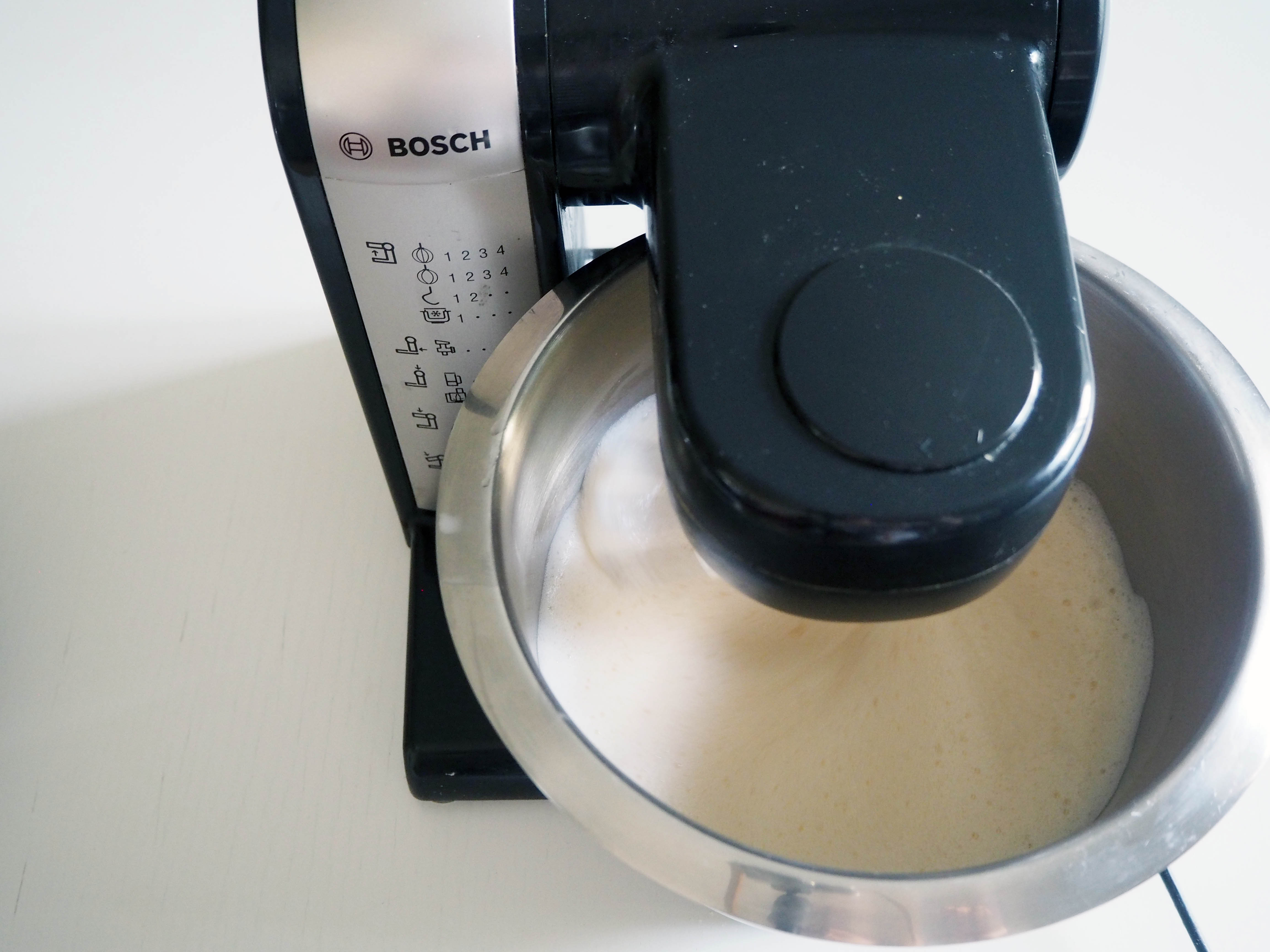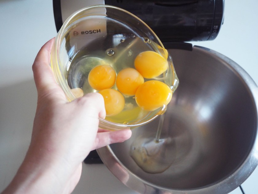 3. In the bowl of an electric mixer, put eggs and beat them for 4 minutes, first 2 in medium and next 2 in high speed, until you get light and fluffy eggs.