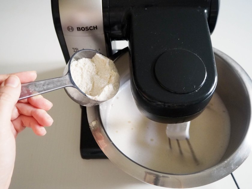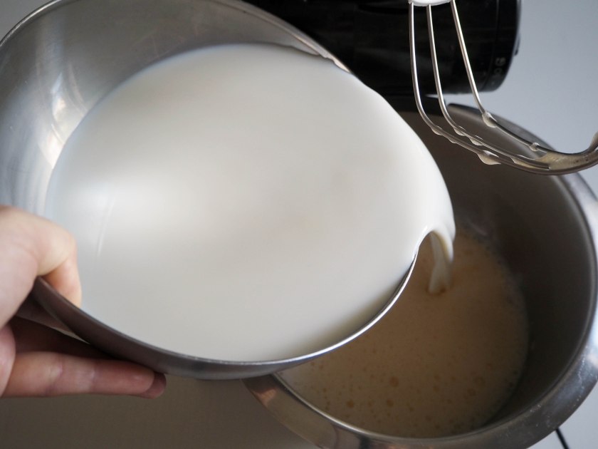 4. Add milk in 2 batches and beat in medium speed until they are well mixed, for about 1-1.5 minutes. If you are using vanilla extract, add it with milk.