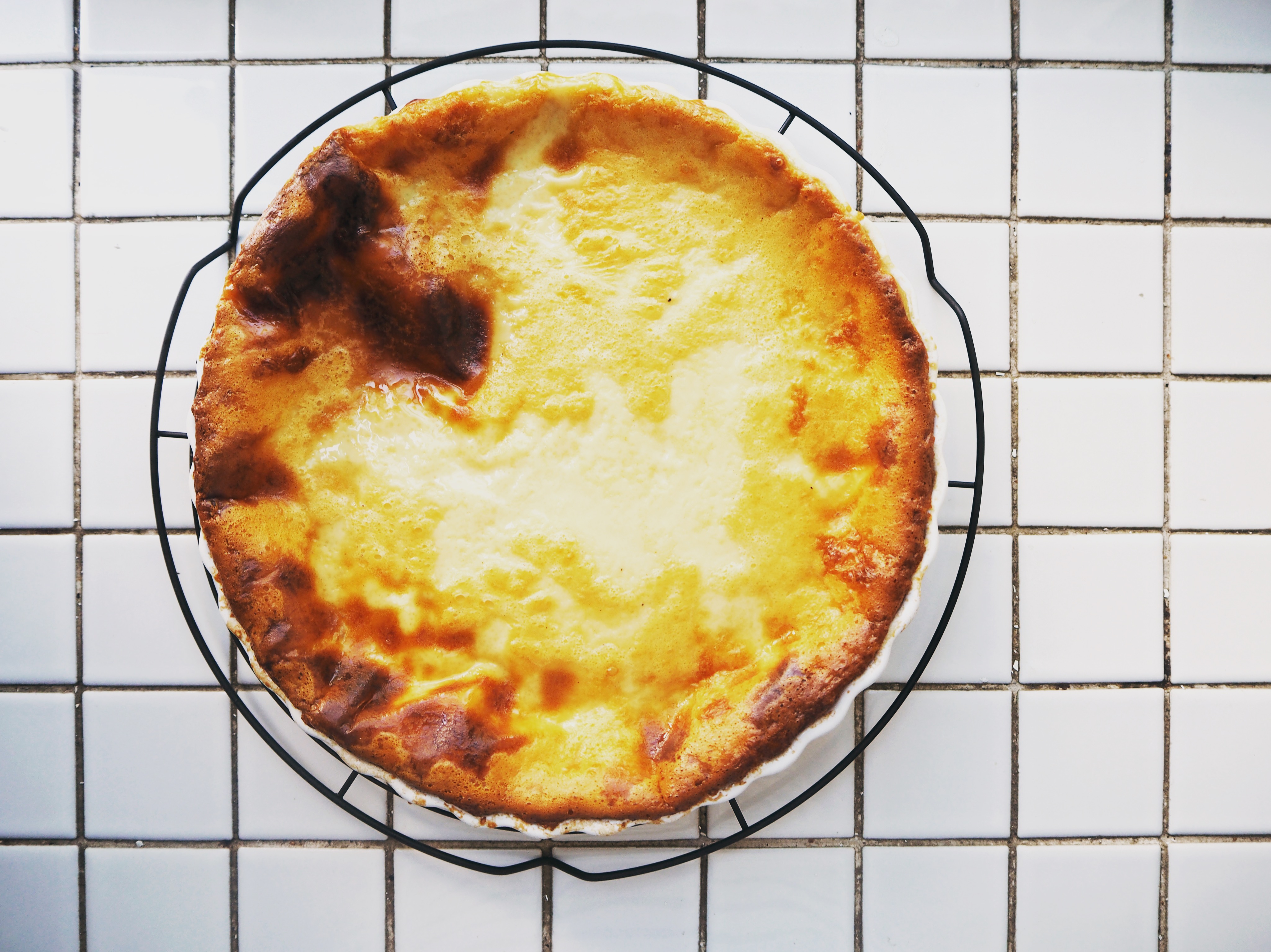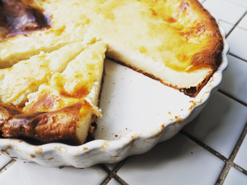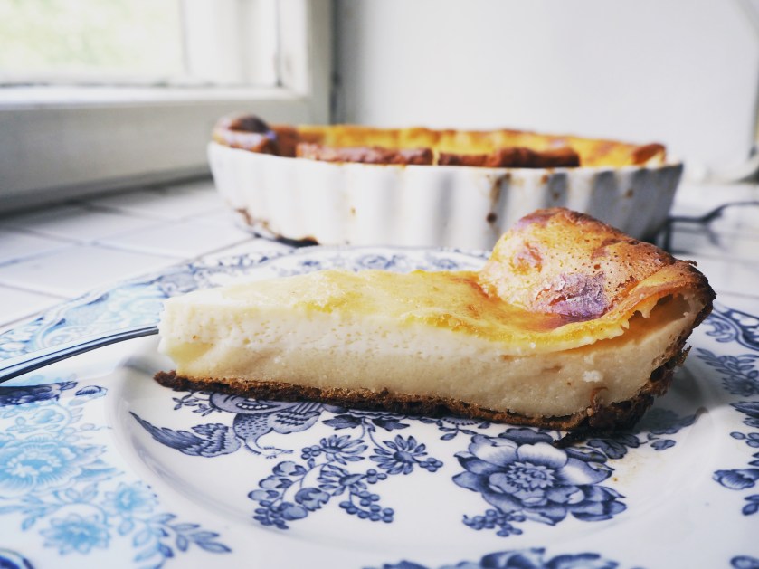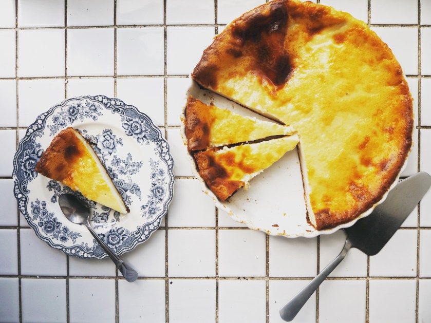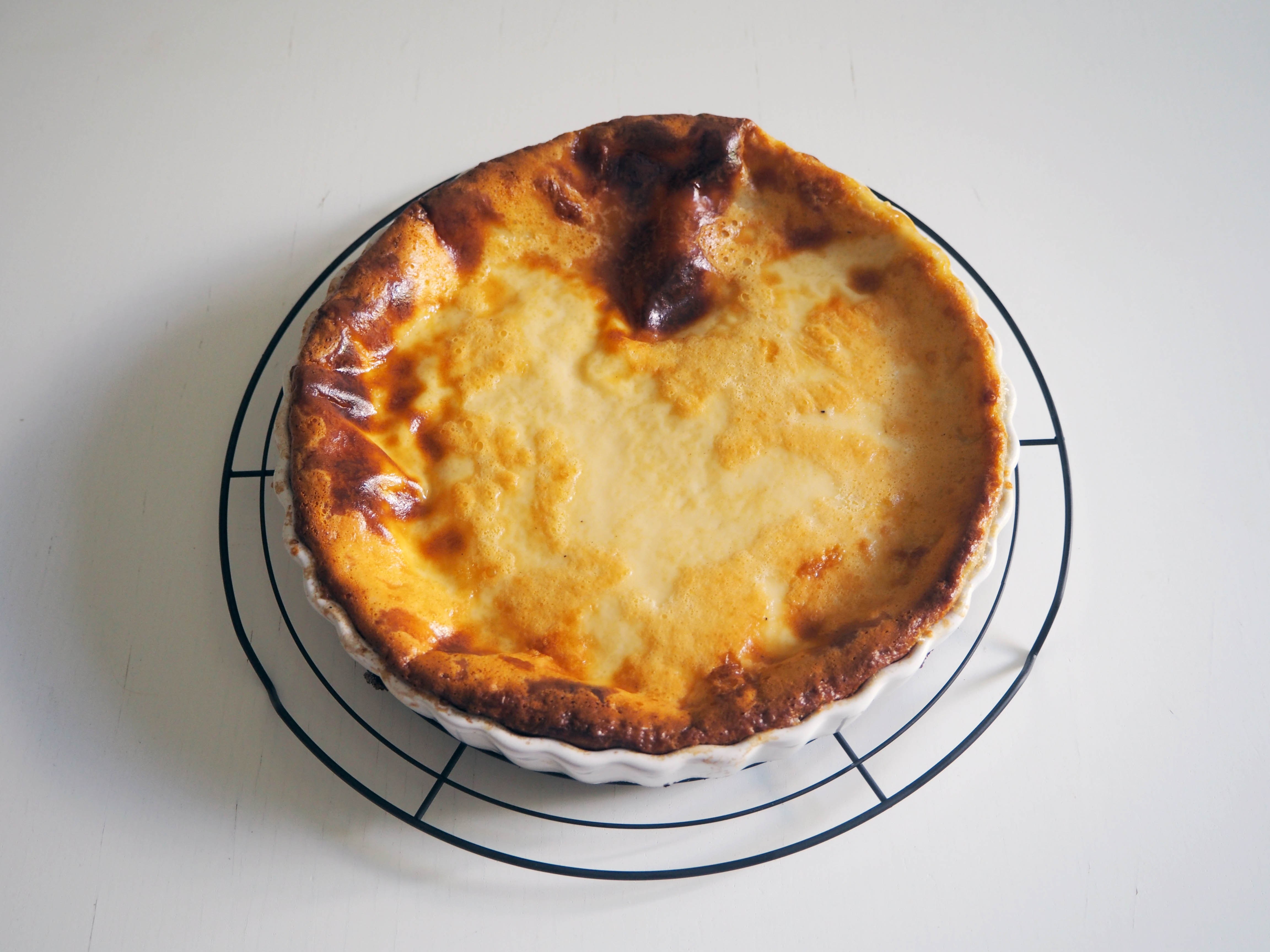 I made a few changes in the original recipe. I increased the amount of eggs, used a big pie plate and I also changed the instructions slightly, but not much. This is a very easy dessert to make, but you really need to plan ahead because it takes a long time to bake and it also needs quite some time to cool. I recommend making it in the morning and so you can enjoy it in the afternoon with some fresh tea!
