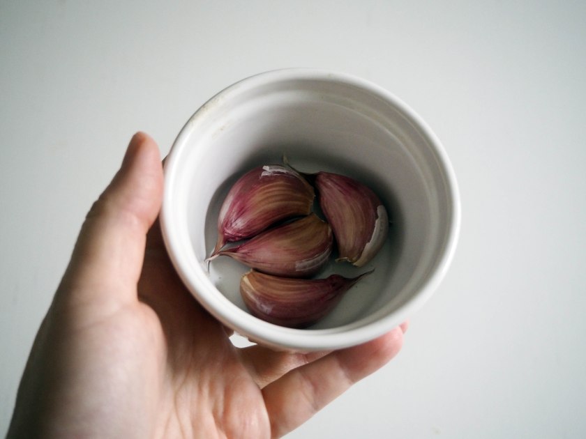 2. Put garlic cloves with skin on in a small ramekin or other oven dish and roast in the oven for 30 minutes, until they get soft enough to be squeezed out of their skin. When roasted enough, take out of the oven to let them cool while preparing other ingredients. Keep the oven on.