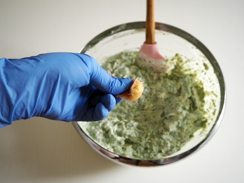 4. Squeeze garlic cloves out of their skin into the mixture and mix well. The reason why you see a blue hand in the photo is not because I suddenly became a smurf but because I didn’t want garlic smell in my hand!