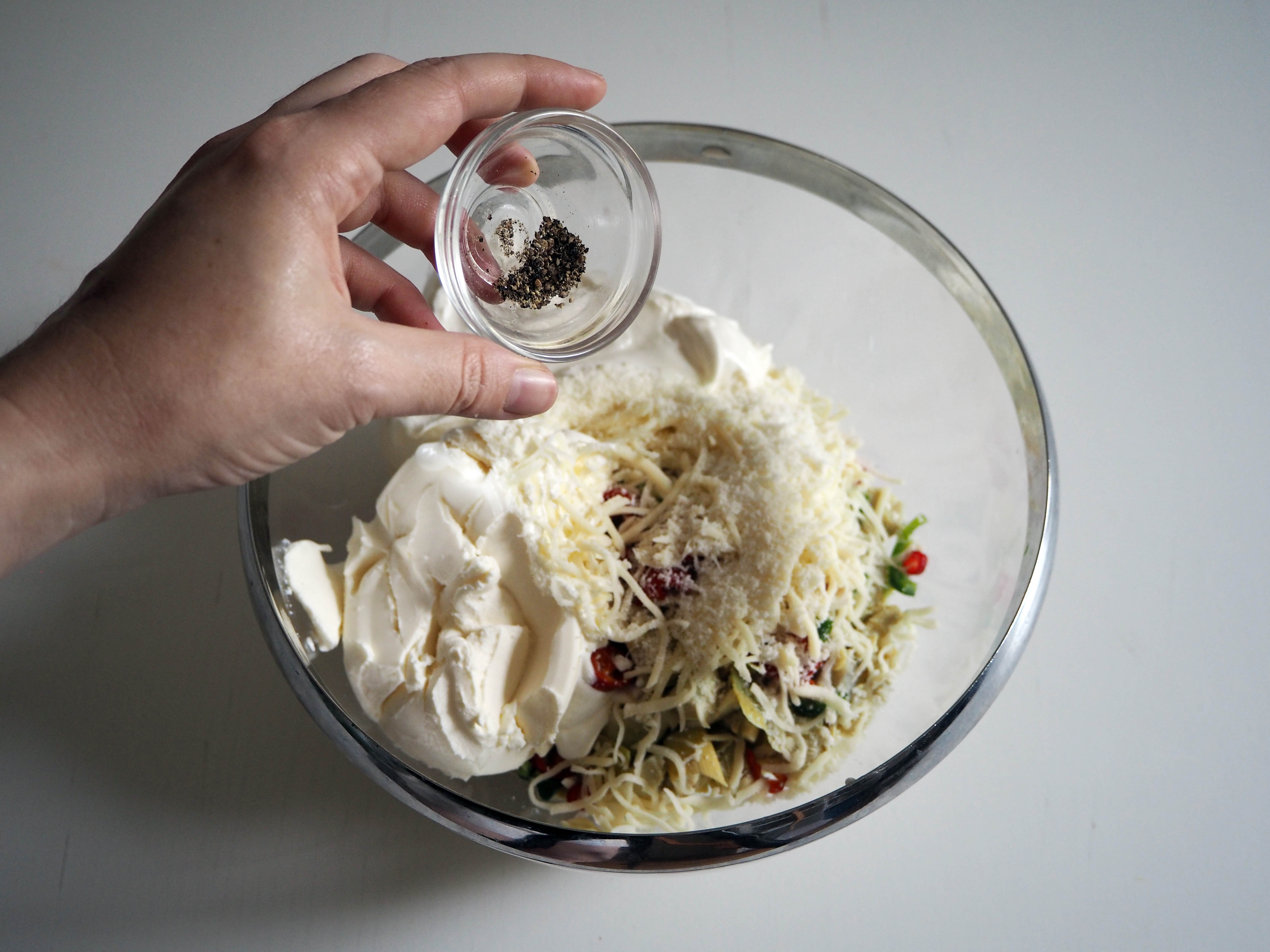 So instead of mayonnaise and some other heavy sauces in many recipes, I used a combination of three types of cheese and sour cream. Then I added a little bit of “hot” taste using 2 kinds of peppers and some ground black pepper. The result, with oozing cheeses, made this dip fit for a feast!