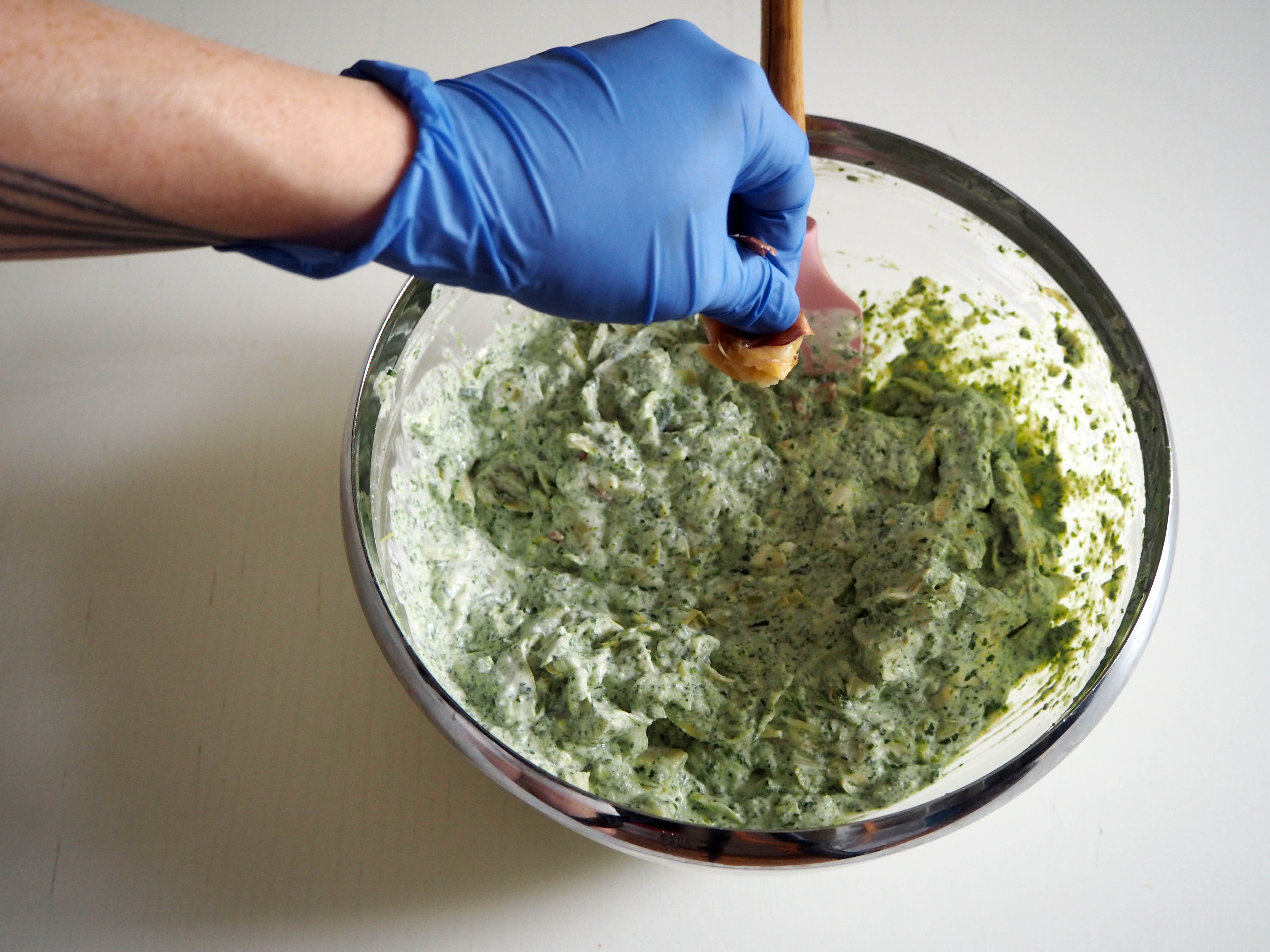 4. Squeeze garlic cloves out of their skin into the mixture and mix well. The reason why you see a blue hand in the photo is not because I suddenly became a smurf but because I didn’t want garlic smell in my hand!