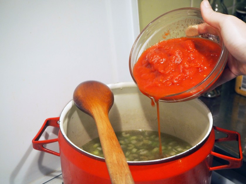 3. Add carrots, celery, water and tomatoes with juice. Try not to make a mess while pouring tomatoes and juice – I did as you see in the photos! Stir and let it cook for 5 minutes.