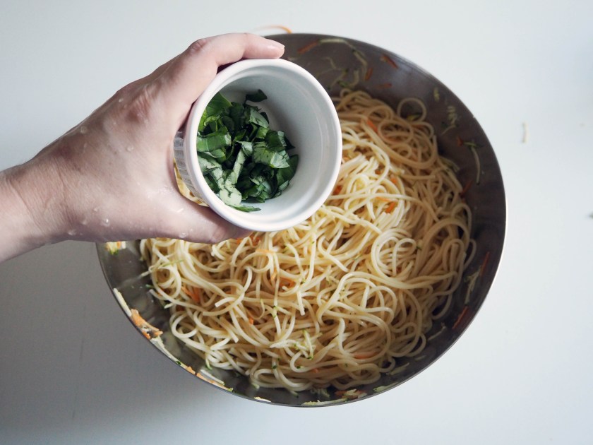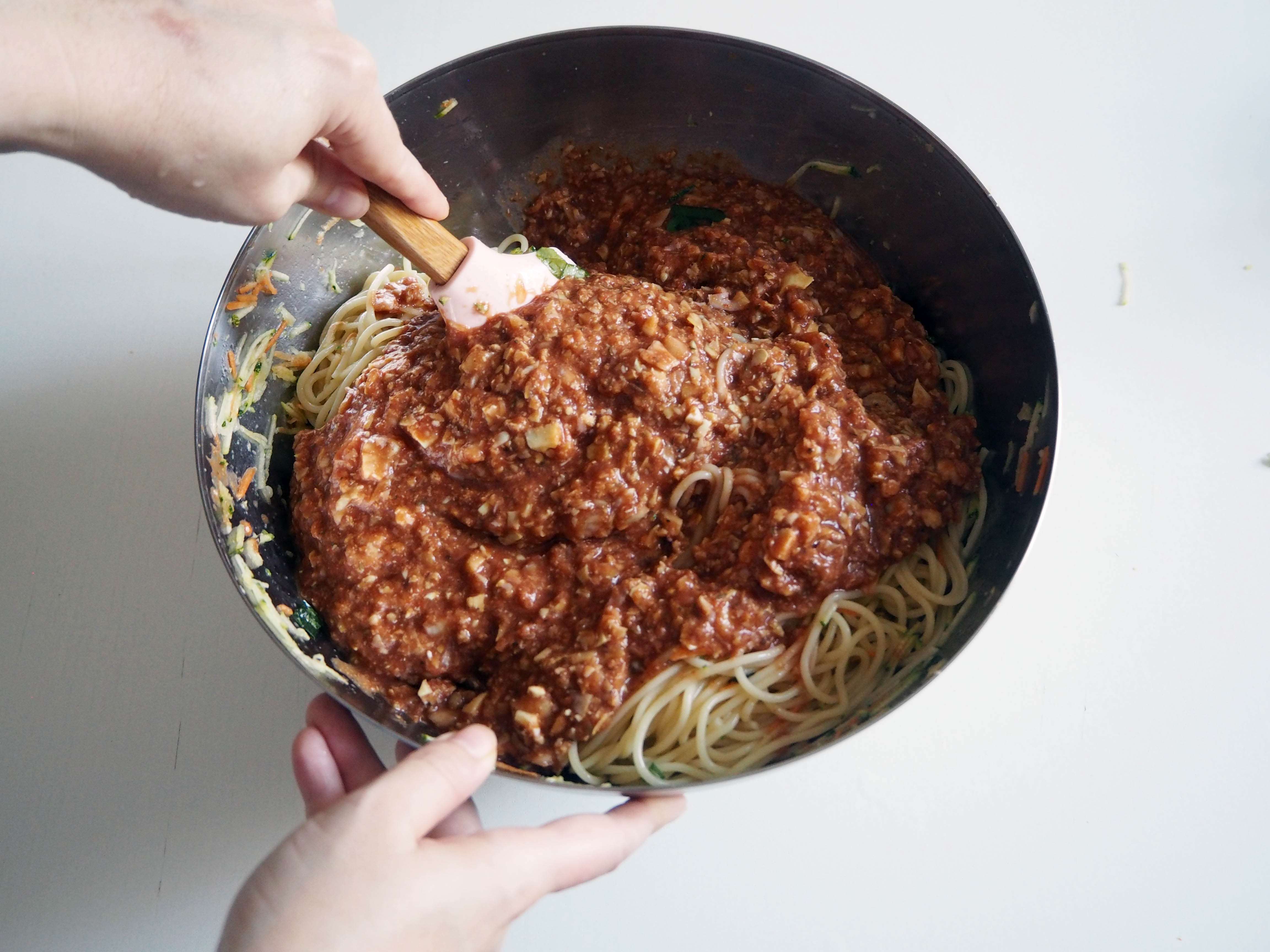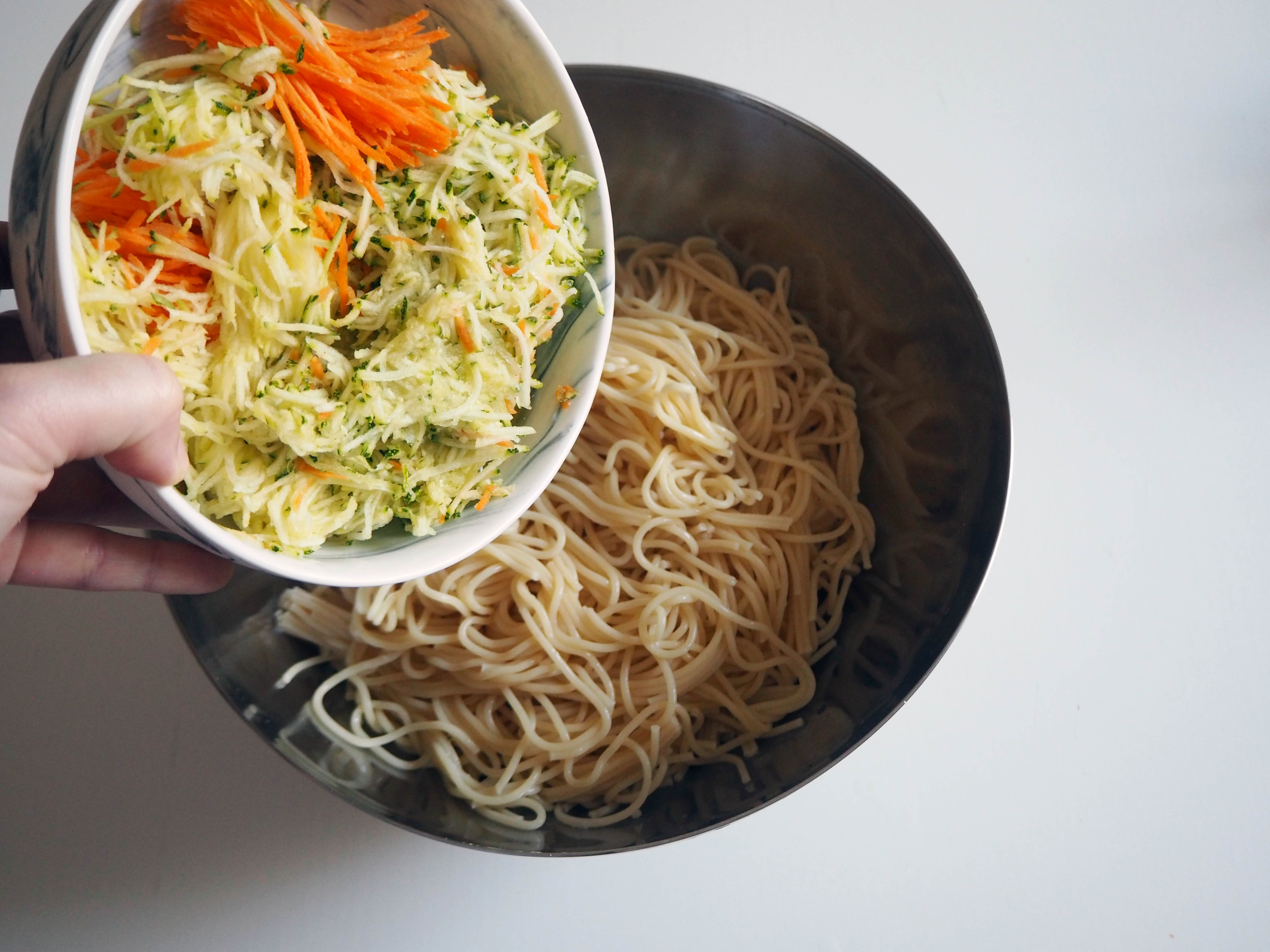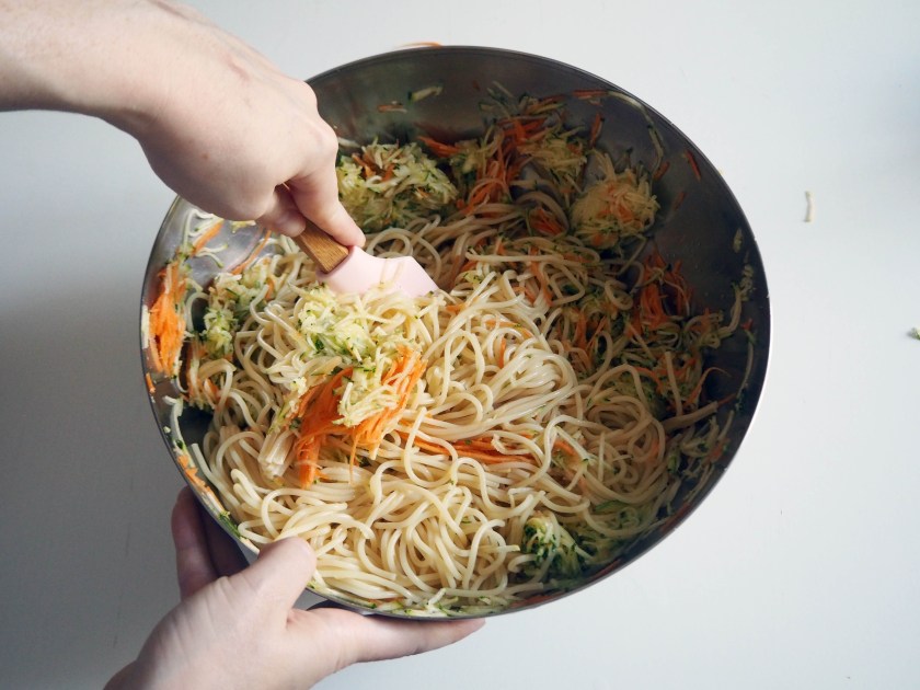 3. Put the cooked spaghetti in a big bowl. Add grated zucchini and carrot and mix well. Don’t be shy to get your hands in there if they refuse to get mixed otherwise!