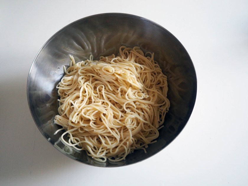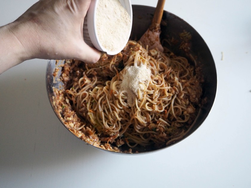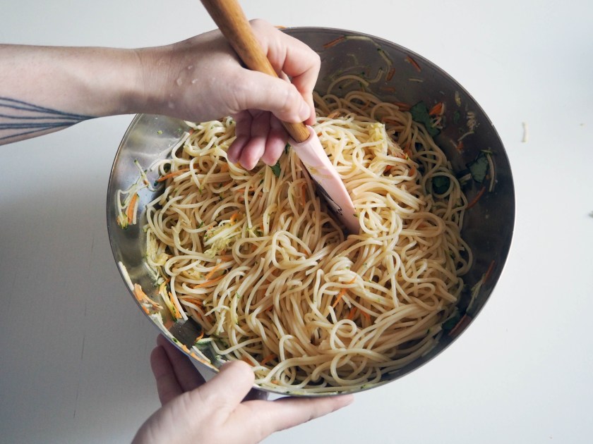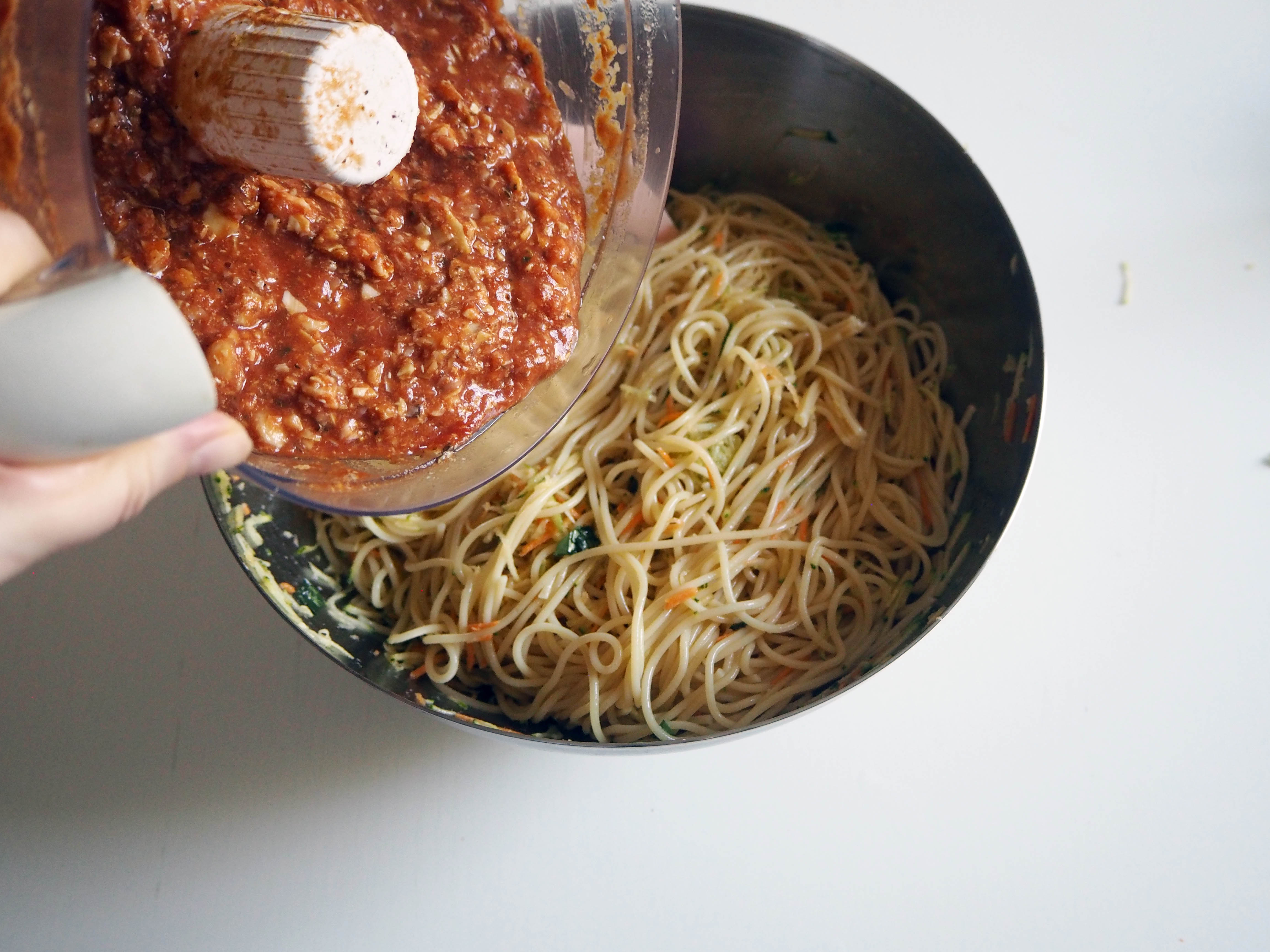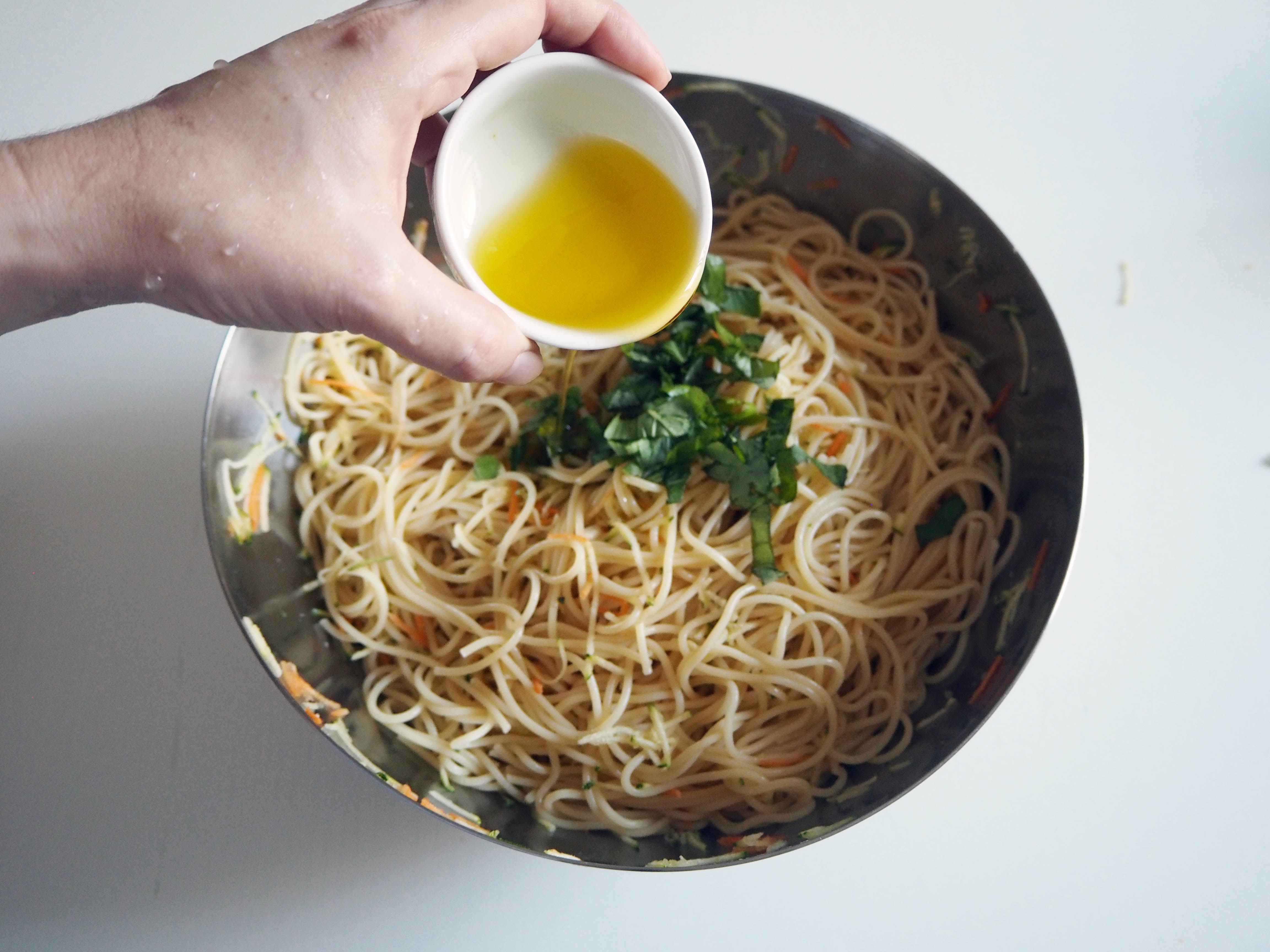 3. Put the cooked spaghetti in a big bowl. Add grated zucchini and carrot and mix well. Don’t be shy to get your hands in there if they refuse to get mixed otherwise!