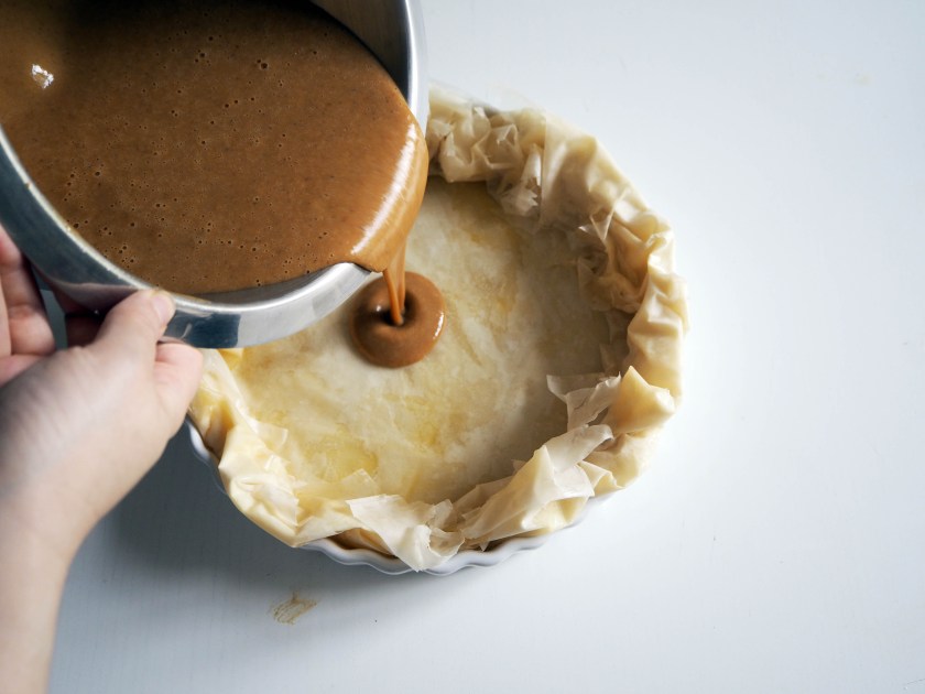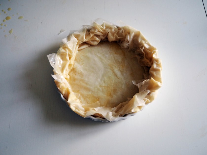 The recipe is not that hard, but I will mark it “medium” as difficulty level because it needs a bit of flexibility while stacking the phyllo layers on top of each other and then shaping them inside pie dish to turn them into the crust.