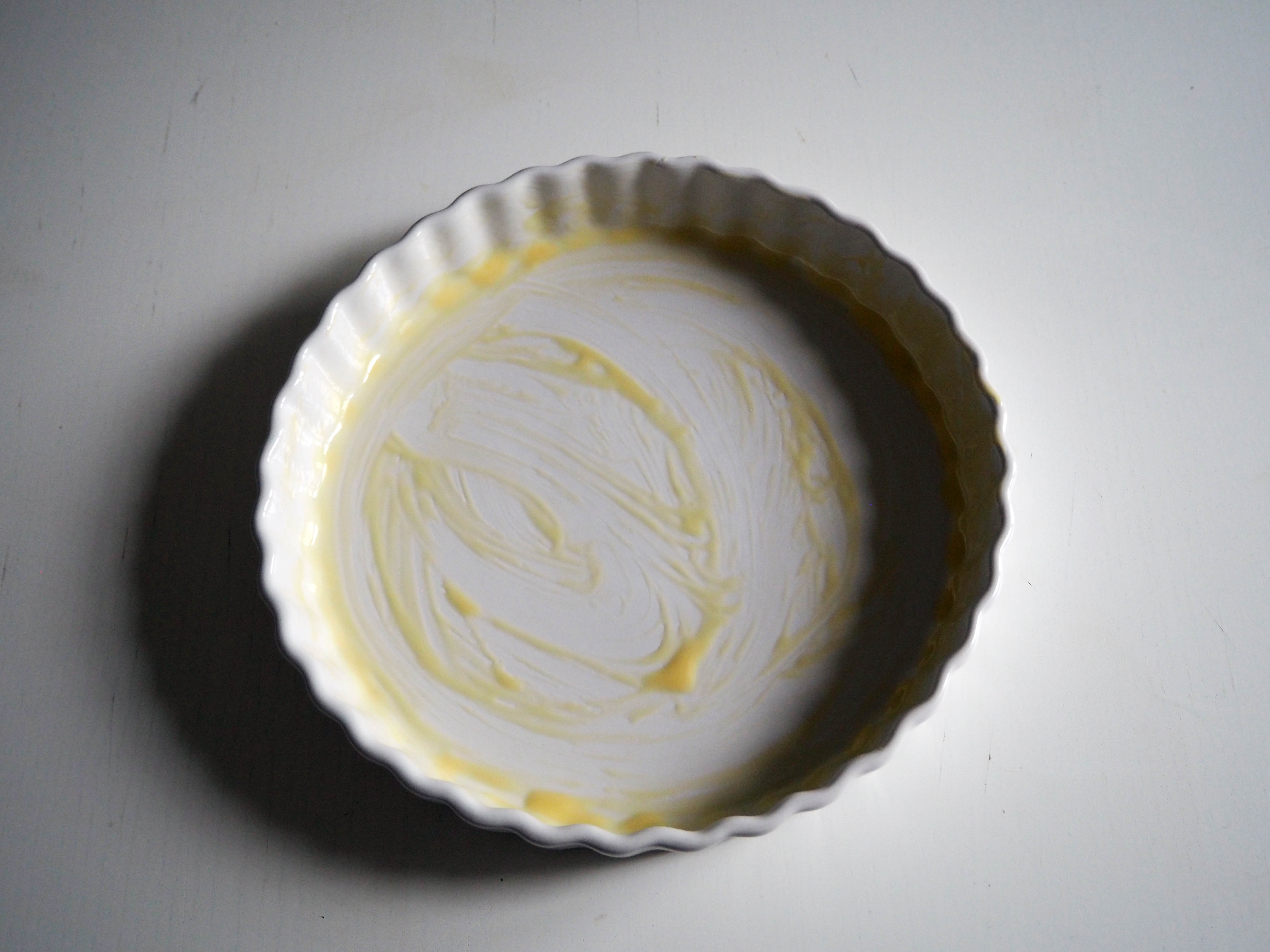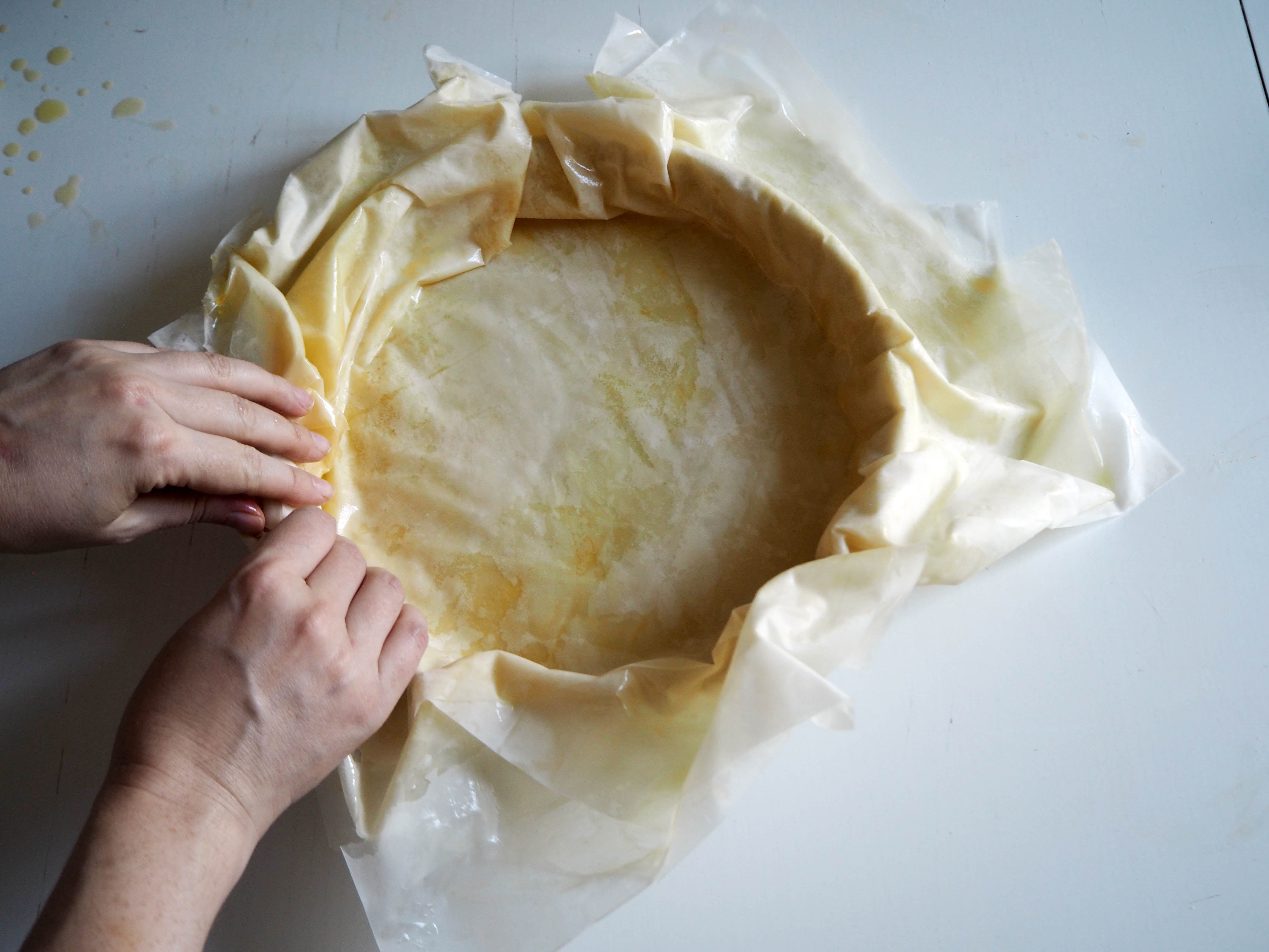 6. Put the “glued” phyllo sheets gently on the pie dish and by pushing them gently inside, let them take the shape of the dish. There will be an excess part still outside dish, by compressing these excess parts into the edge of the dish, create a rustic pie crust shape. Put the dish aside.