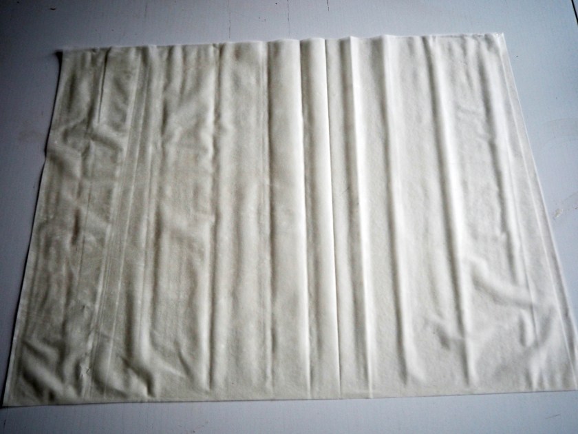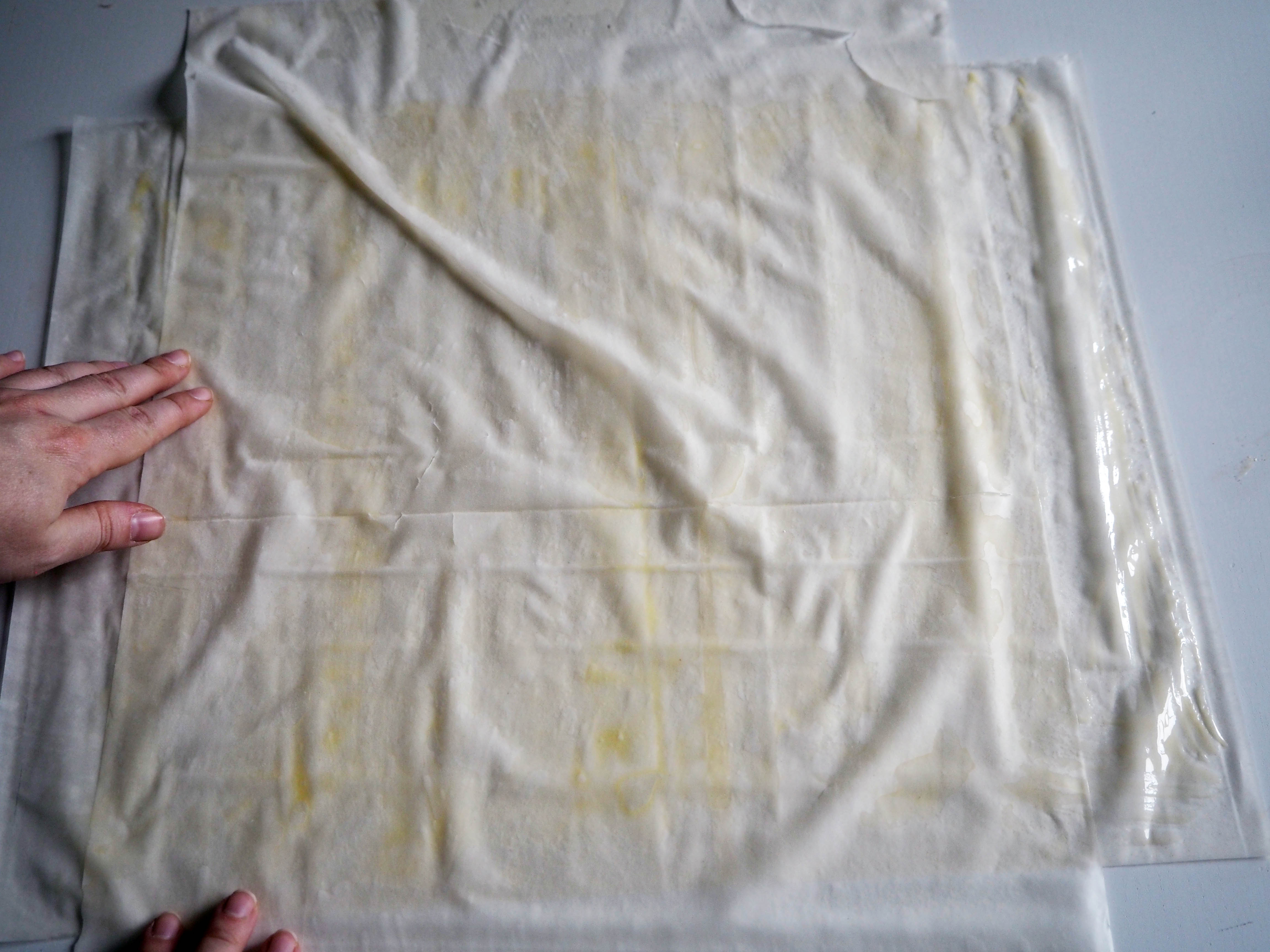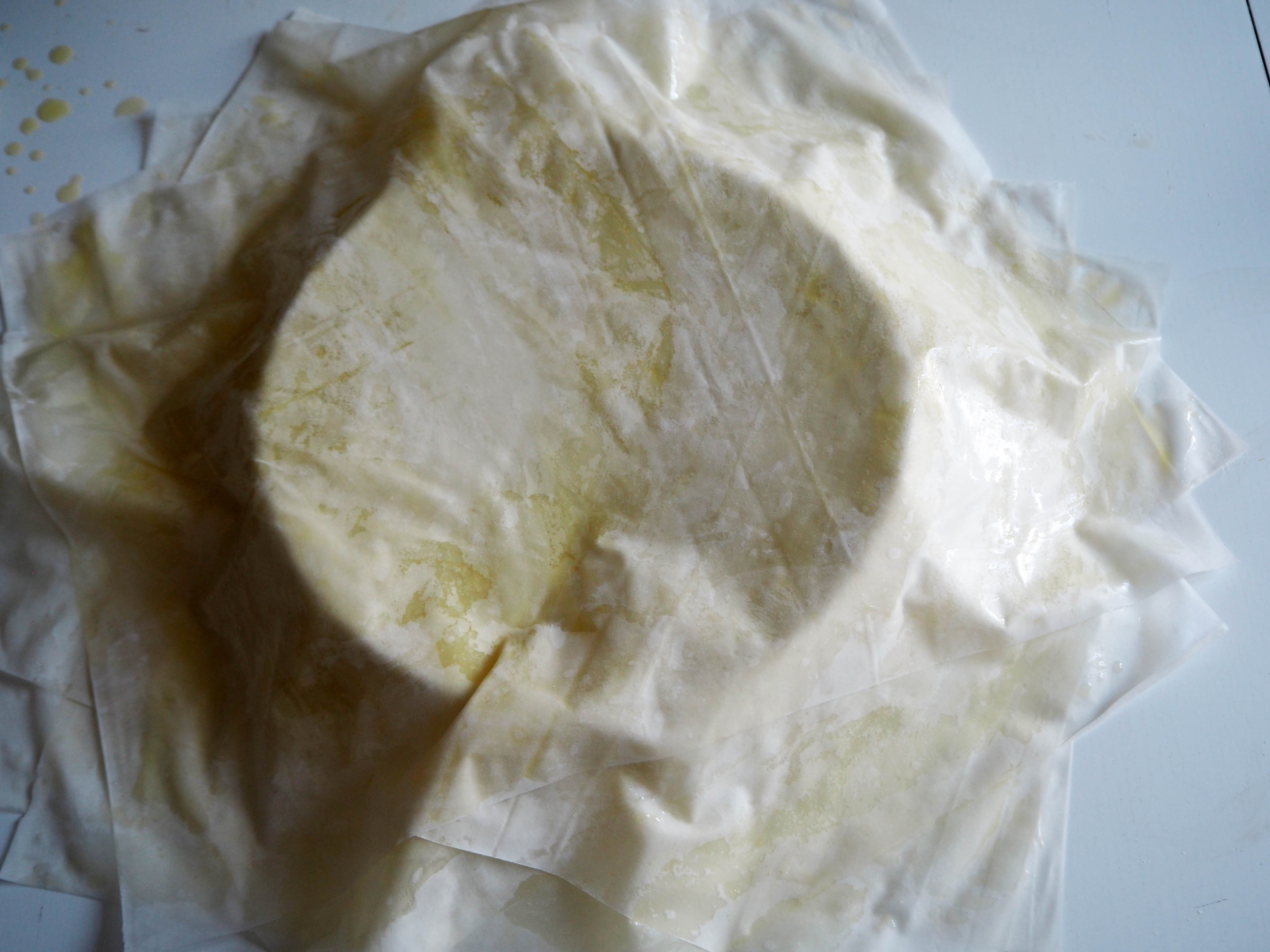 5. Put the final two sheets again diagonally but tilted a little to create a shape loosely resembling a circle shape altogether. Do not brush the final surface with butter.