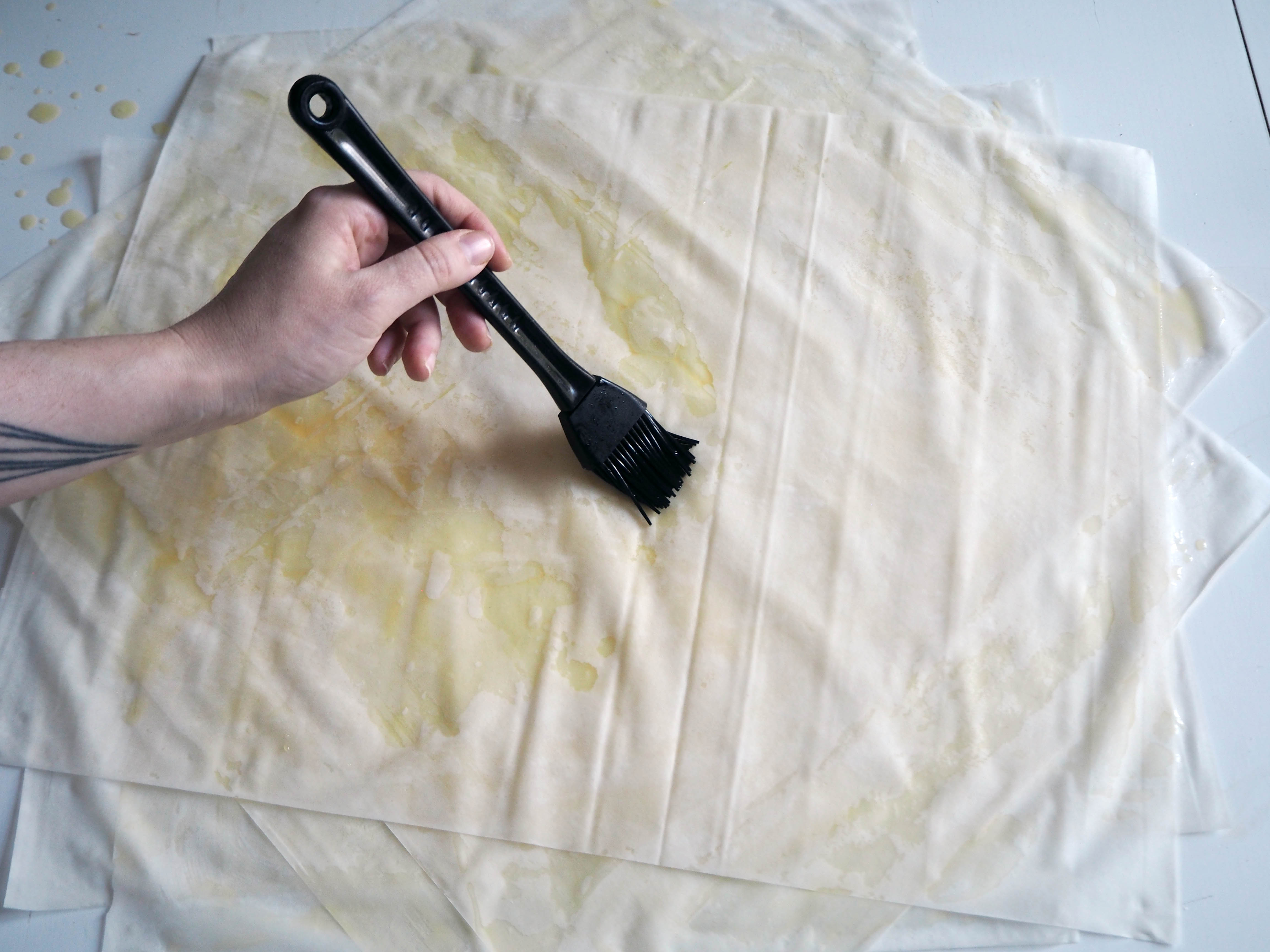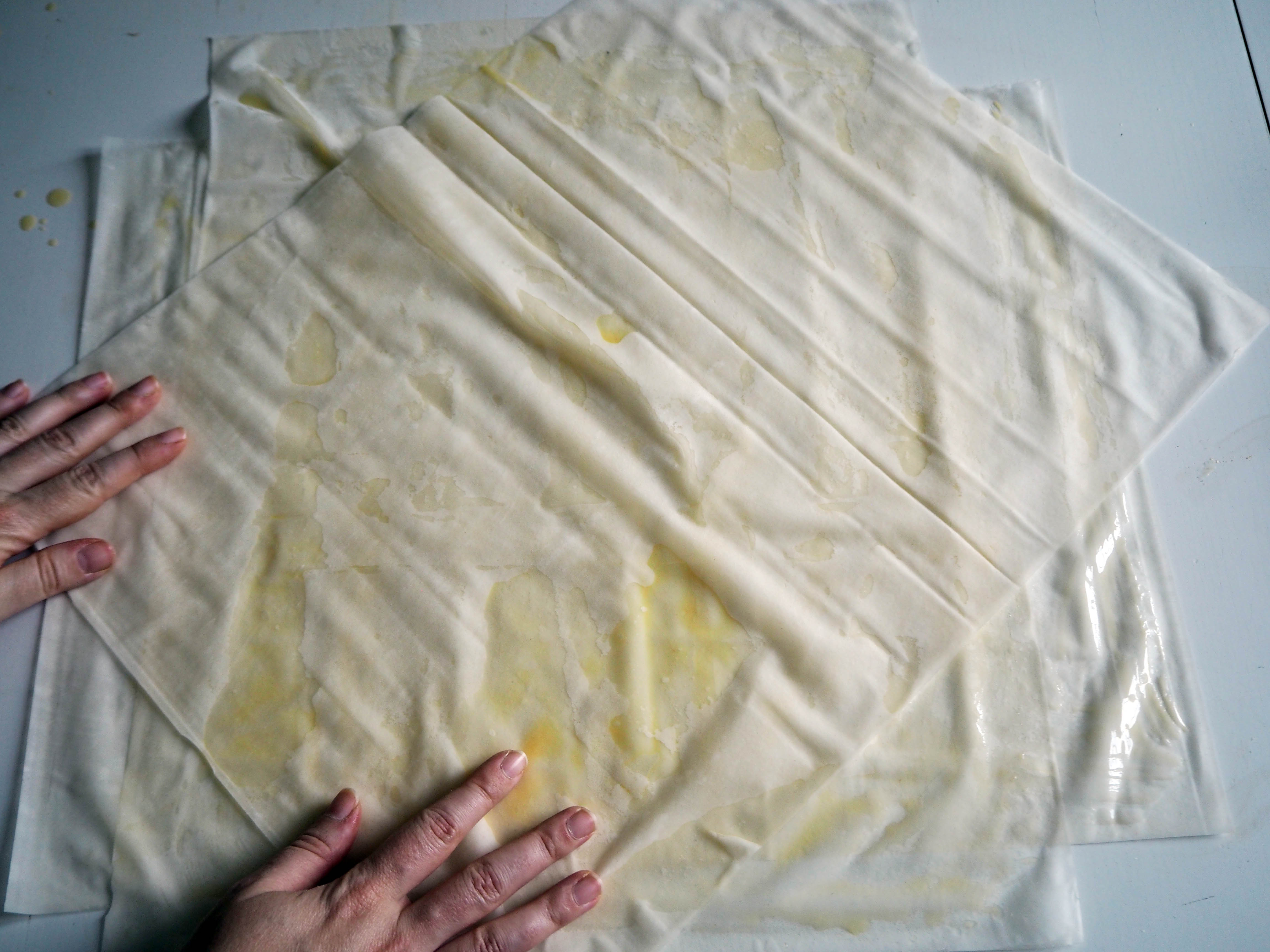 4. Put the next two sheets diagonally to the first ones and each time, brush the surface with butter after positioning.