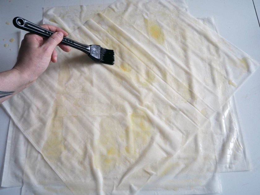 3. Take one phyllo sheet and brush the surface with melted butter. Put second phyllo sheet perpendicular to the first one and again brush it with butter.