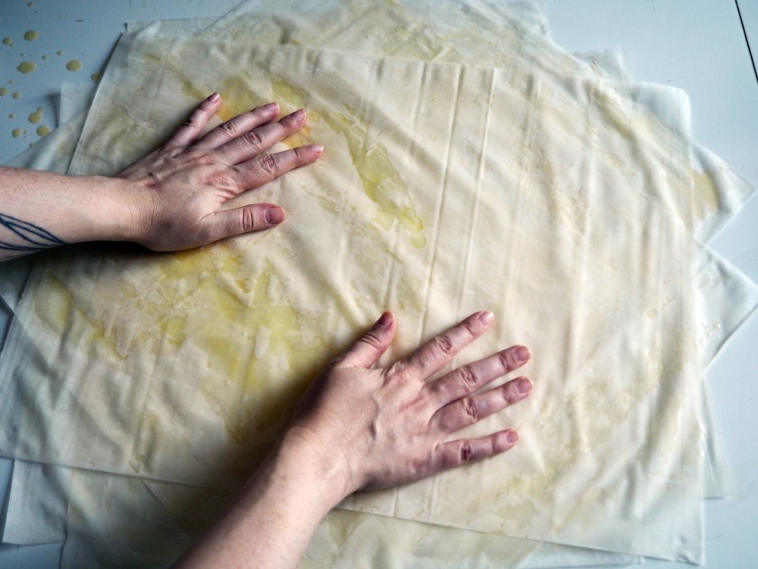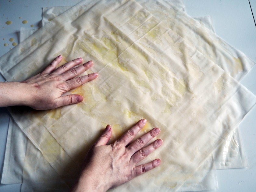As before in my many other phyllo related recipes, I used the phyllo marked as “baklava” sheets that I bought from Turkish markets in Itäkeskus (Alanya and Kimene Oriental Markets). They are easier and more pleasant to handle than frozen phyllo sold in regular Finnish markets. So if you have possibility to get a hold of these, then do it. Otherwise, the frozen phyllo from other markets perfectly work too, you just need to thaw them correctly. Enjoy the pie!