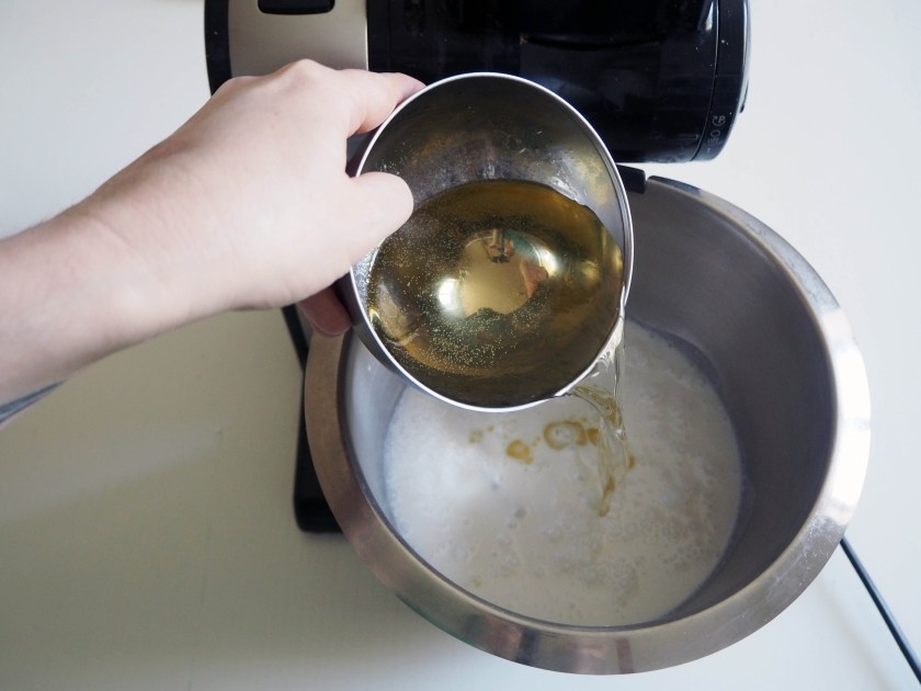 3. In the bowl an electric mixer, Put sugar, olive oil, coconut milk and wine and beat in medium speed until they are mixed well. By the way you can perfectly whisk all these by hand but I was lazy so I used my standing electric mixer.