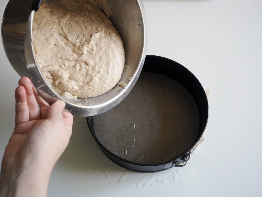 5. Pour the cake batter in prepared springform pan and smoothen the surface with a spatula. Bake in the oven, in medium rack, for about 45-50 minutes, or until a toothpick inserted in the middle comes out clean.