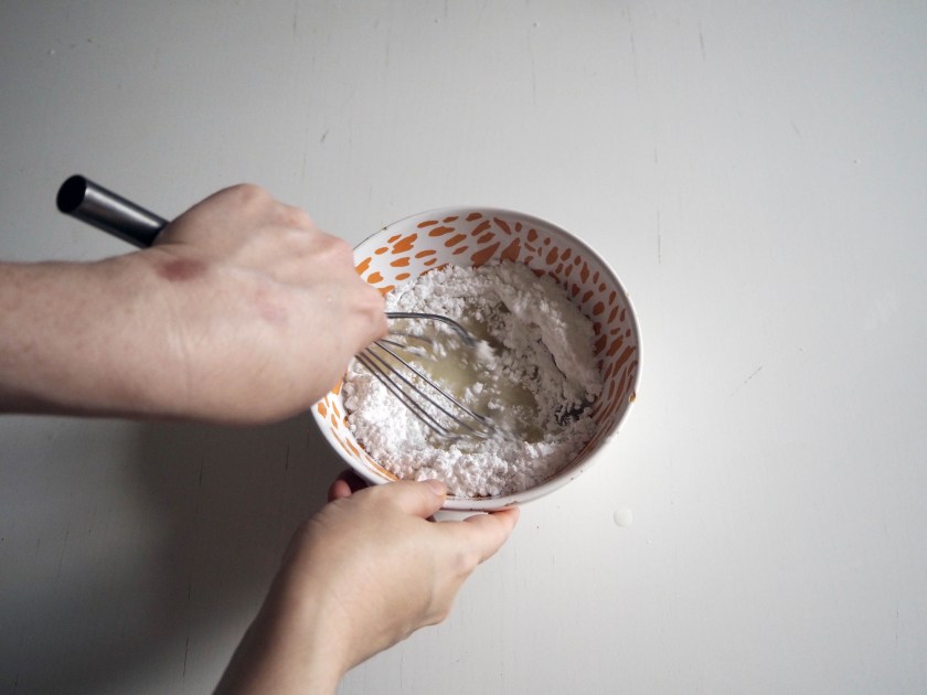 7. If you want to pour glaze over the cake, prepare it when the cake is cooled down completely. Mix dry ingredients and wet ingredients for the glaze separately first. Then combine all, whisking until no clumps are left.