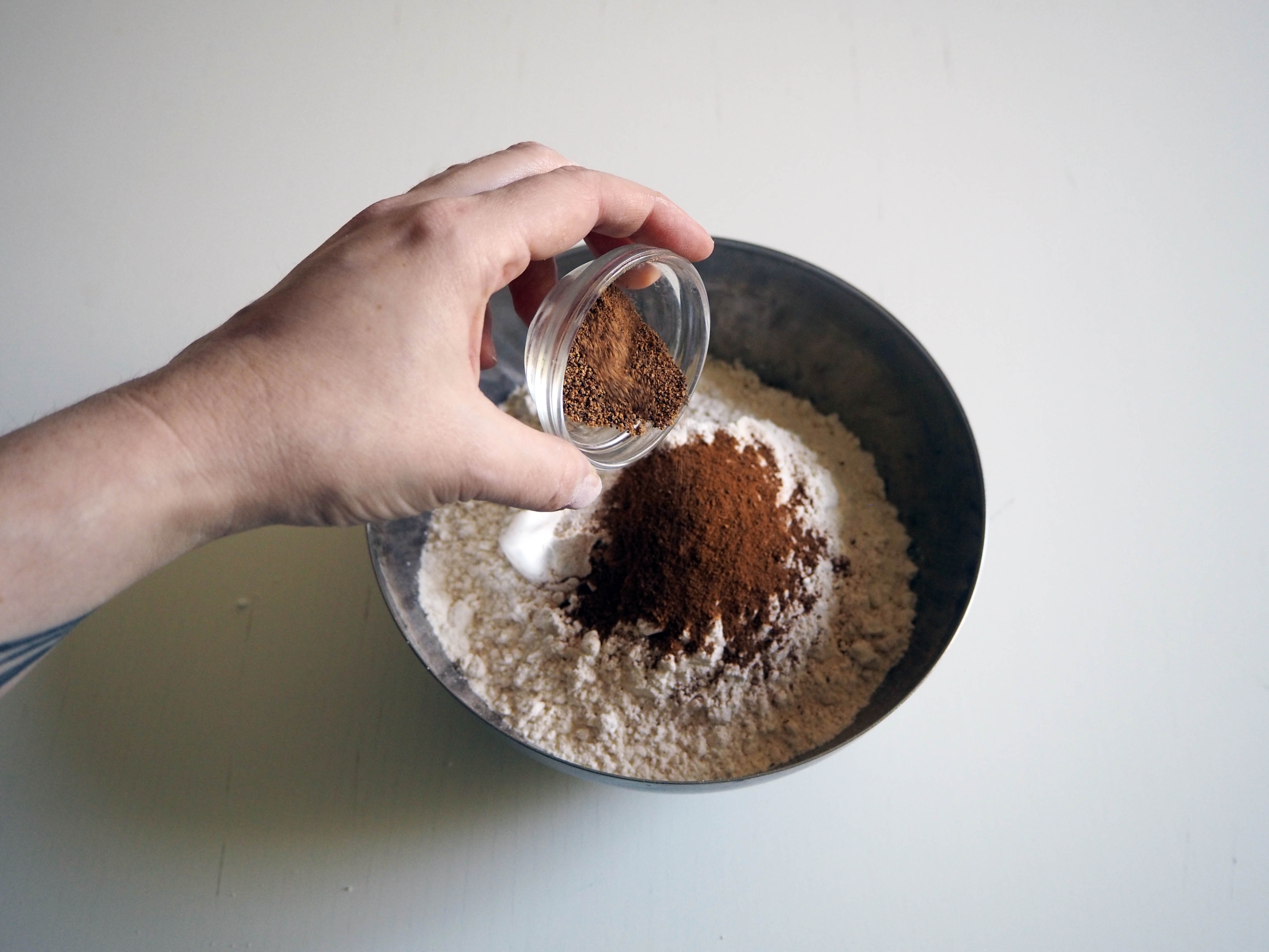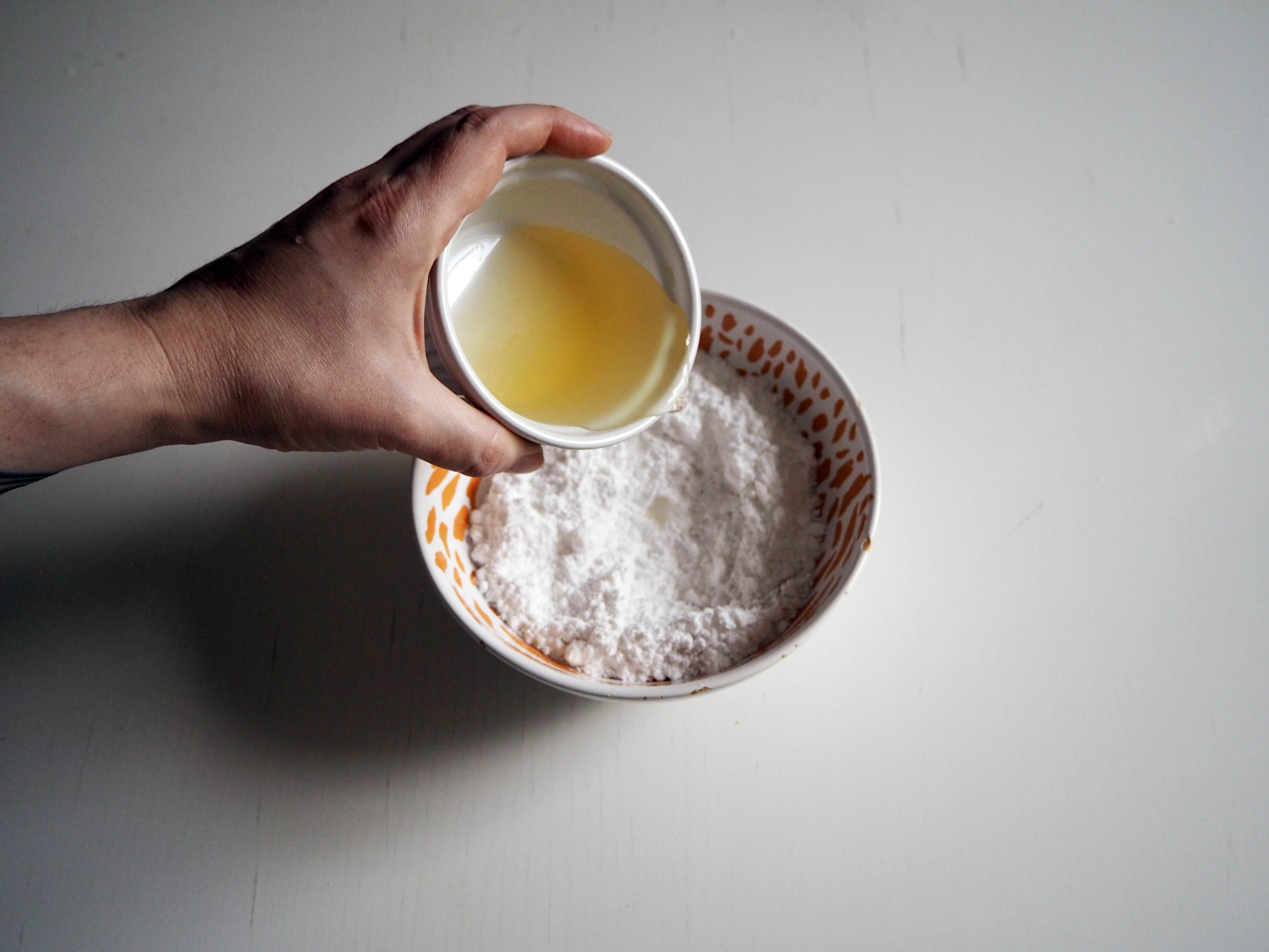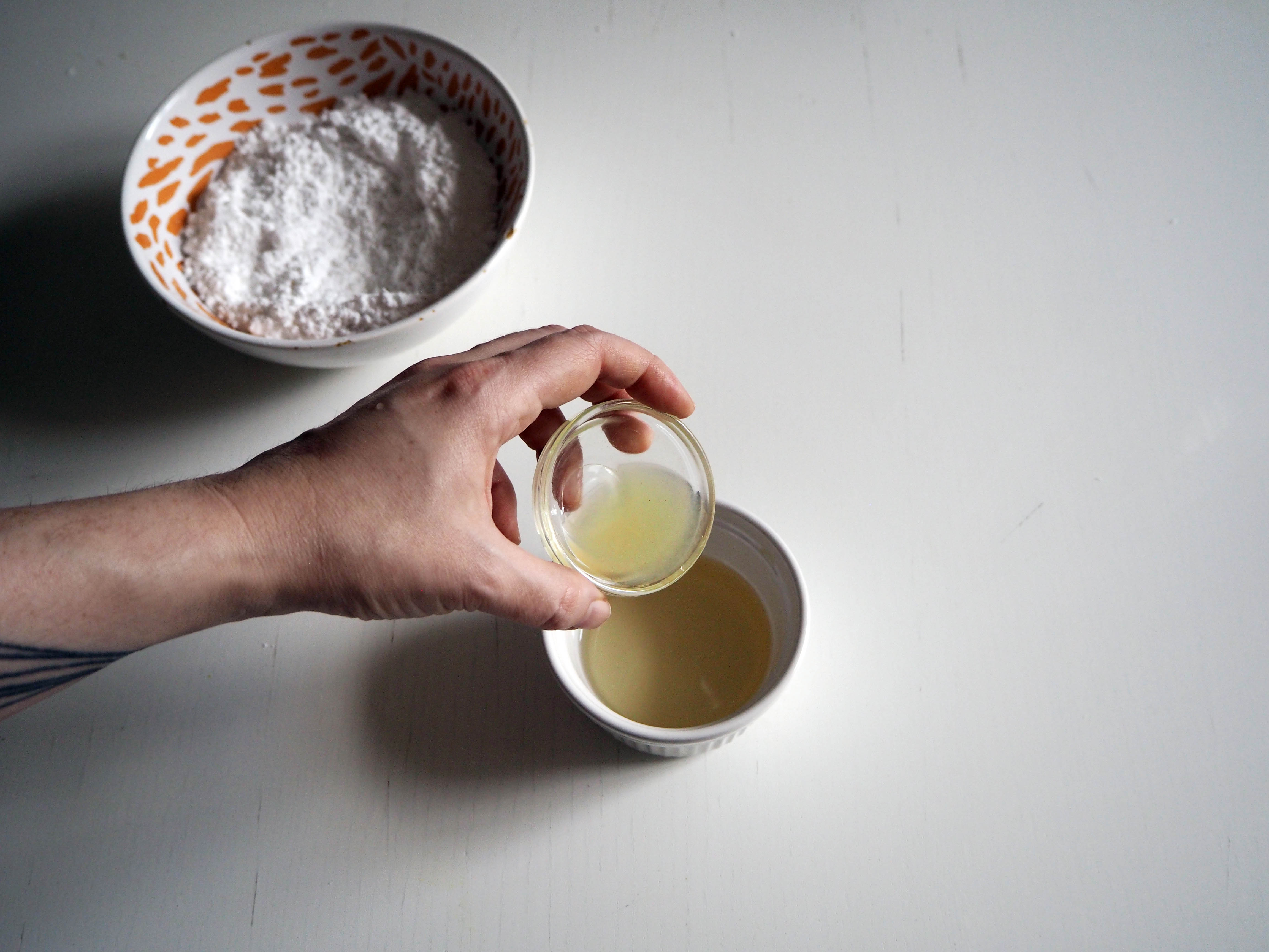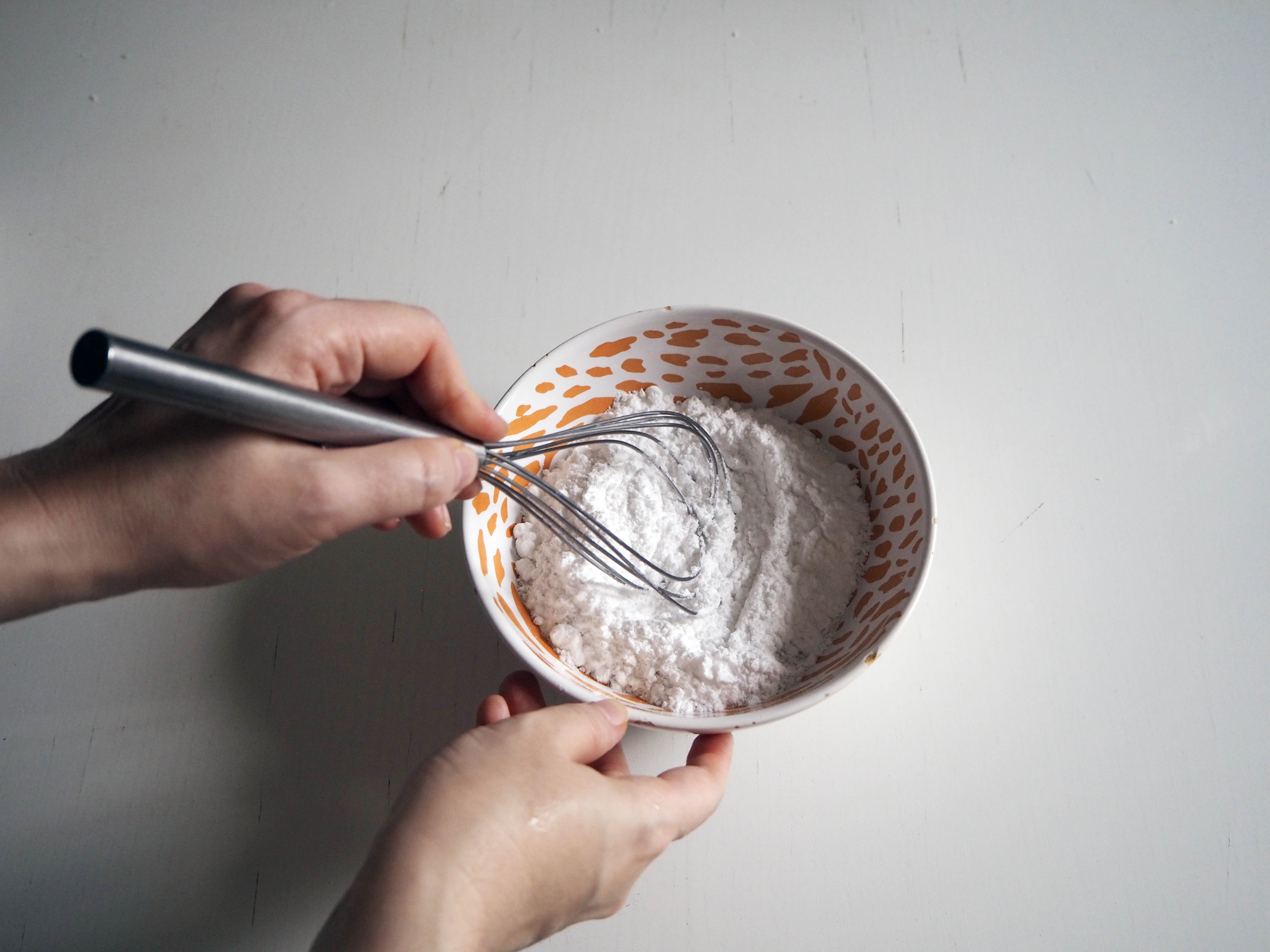 7. If you want to pour glaze over the cake, prepare it when the cake is cooled down completely. Mix dry ingredients and wet ingredients for the glaze separately first. Then combine all, whisking until no clumps are left.
