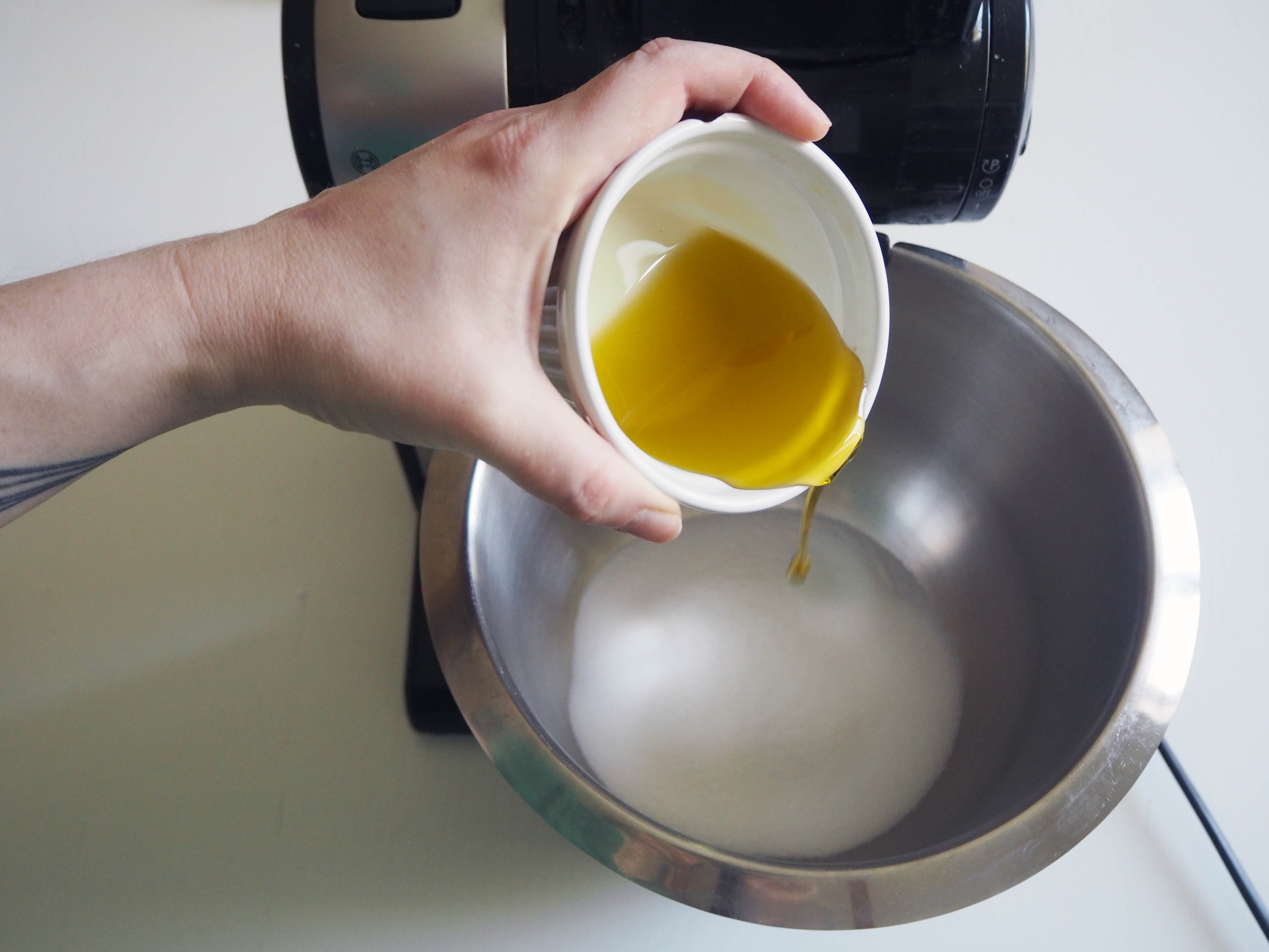 3. In the bowl an electric mixer, Put sugar, olive oil, coconut milk and wine and beat in medium speed until they are mixed well. By the way you can perfectly whisk all these by hand but I was lazy so I used my standing electric mixer.