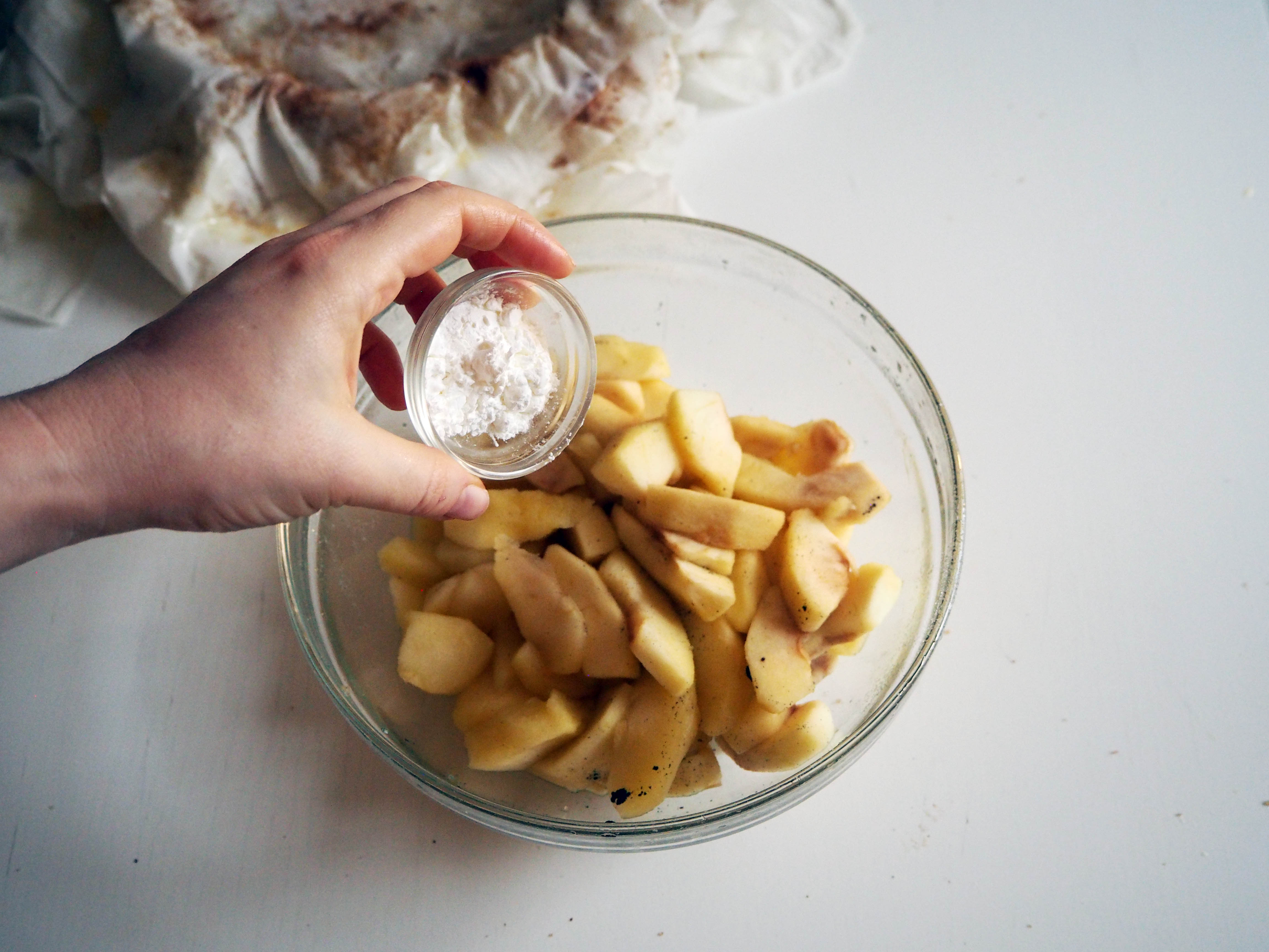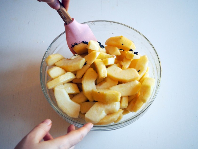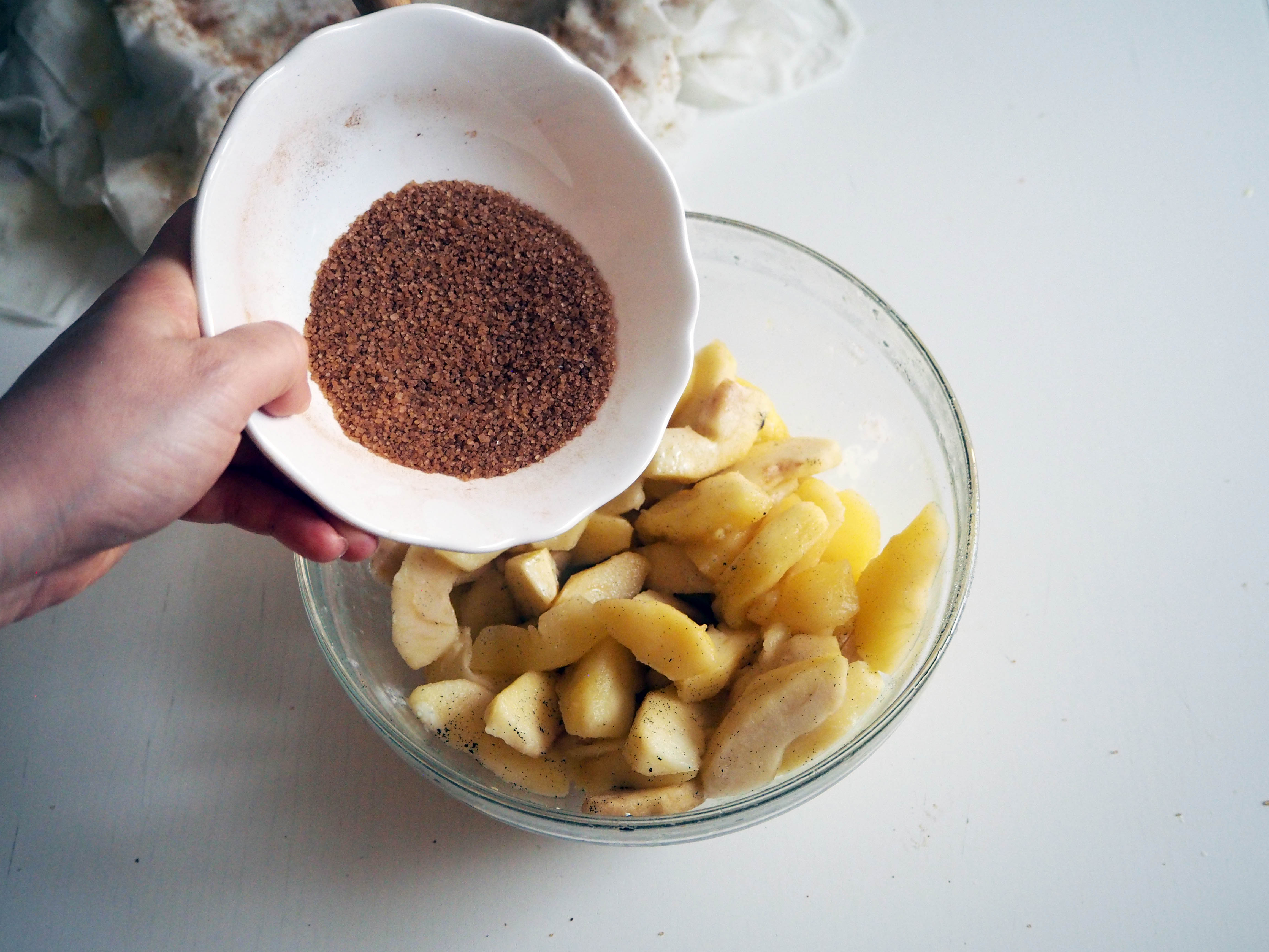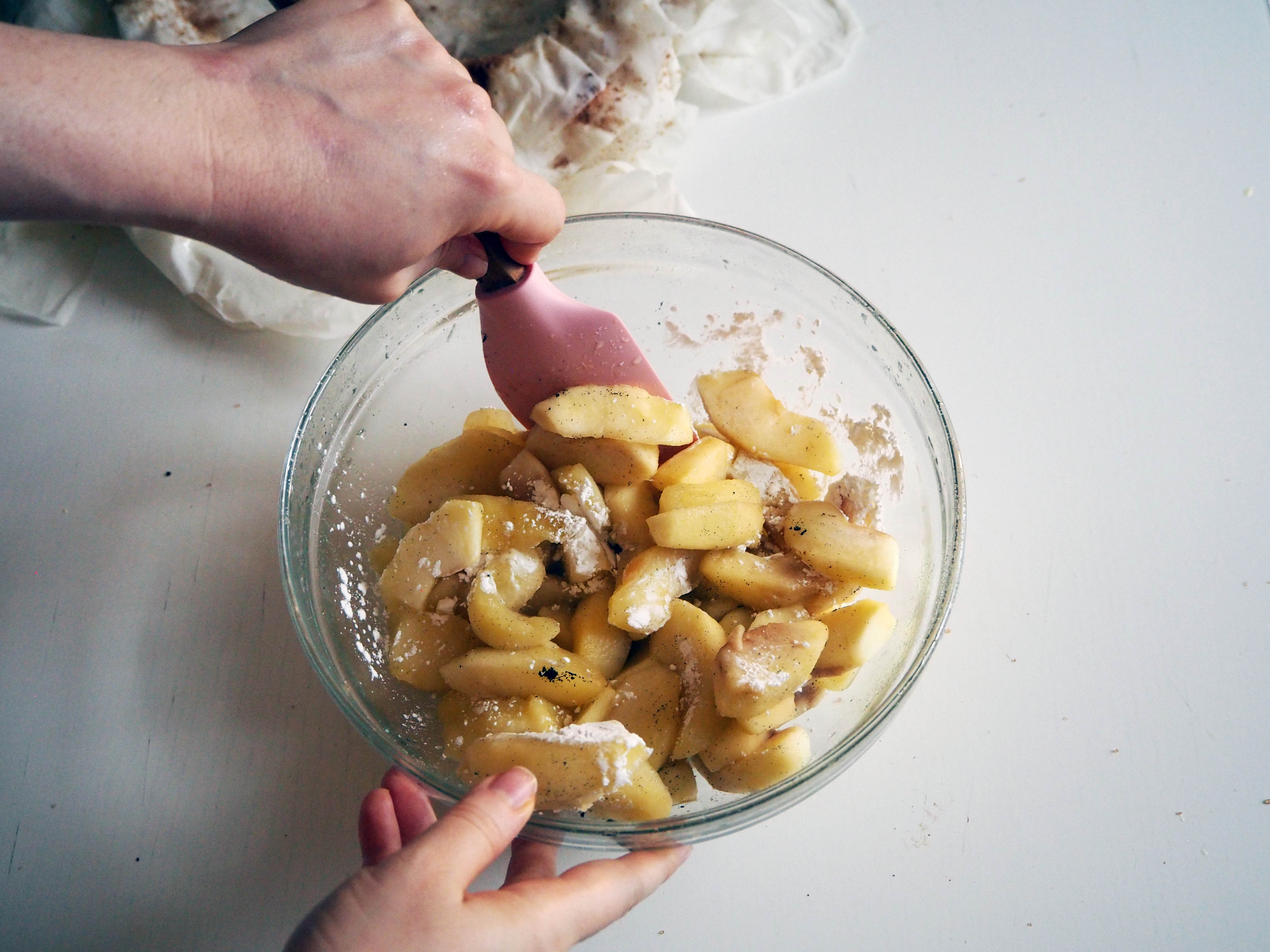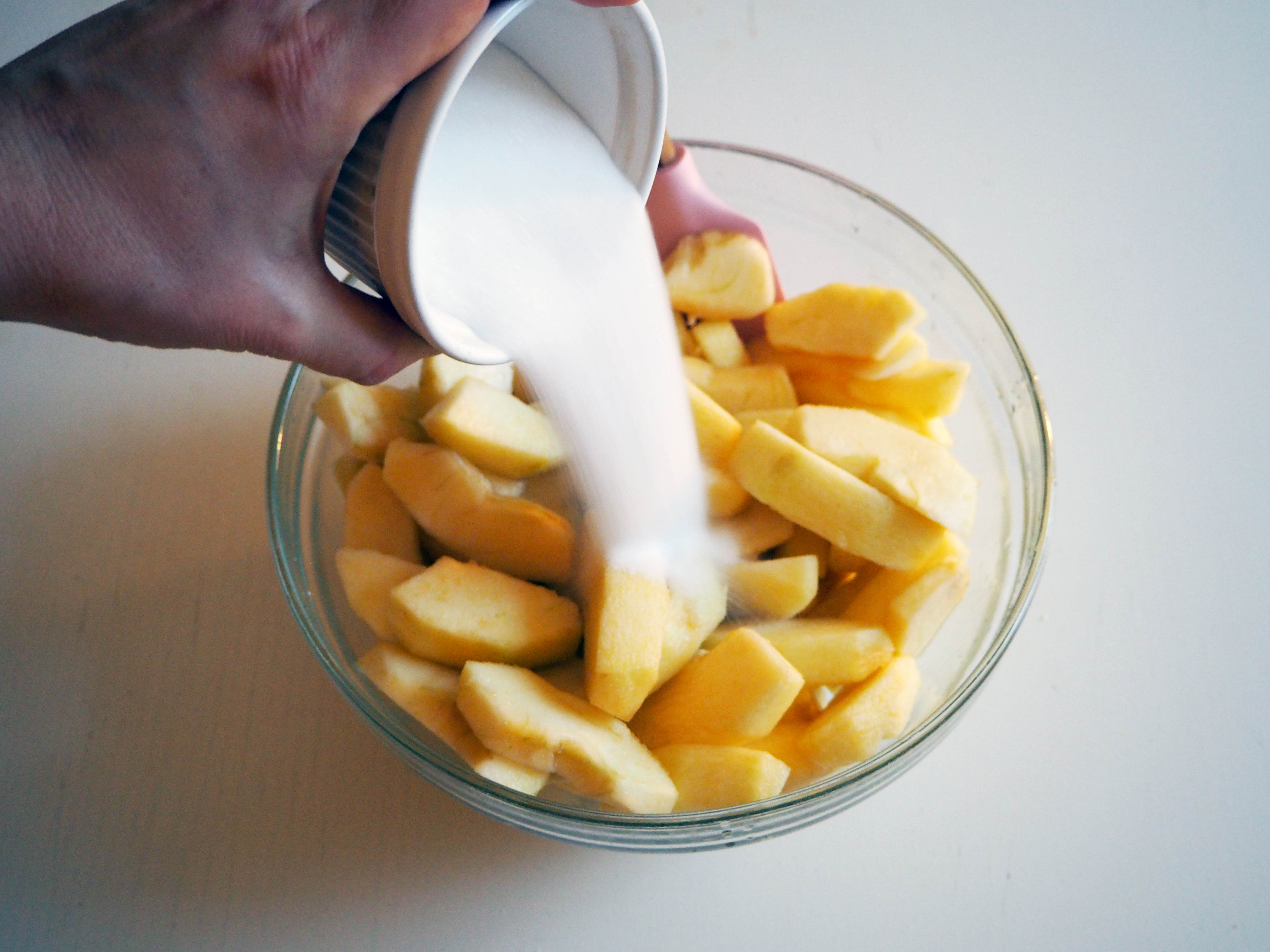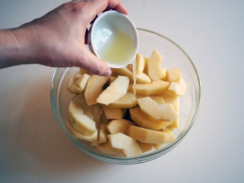 1. In a bowl, put apples, lemon juice and white sugar and mix.