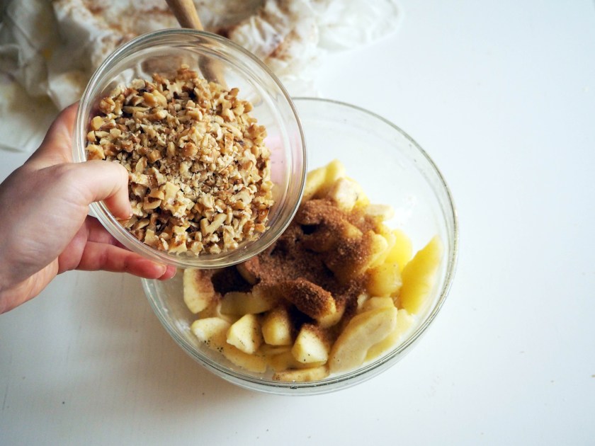 I think one of the things that I love most about this pie is its flakiness and crispiness. It just adds a lovely light touch to the otherwise dull and heavy apple pies (or pies in general). Apples bring in moisture and walnuts, which I preferred to coarsely chop and not process to very small pieces, add a delicious texture and crunchiness to the filling. If you are not a fan of walnuts, or if you want to try something different, pecans work well in this pie with apples as well.