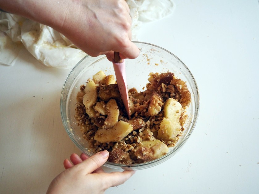 11. Pour apple filling into the pie dish with phyllo and smoothen the top using a spatula, as much as possible. You can of course be patient and take apple slices one by one and arrange them in a neat way inside the pie, but I am not that patient so I just dumped the whole thing. And you know what? It was equally tasty – and fast!