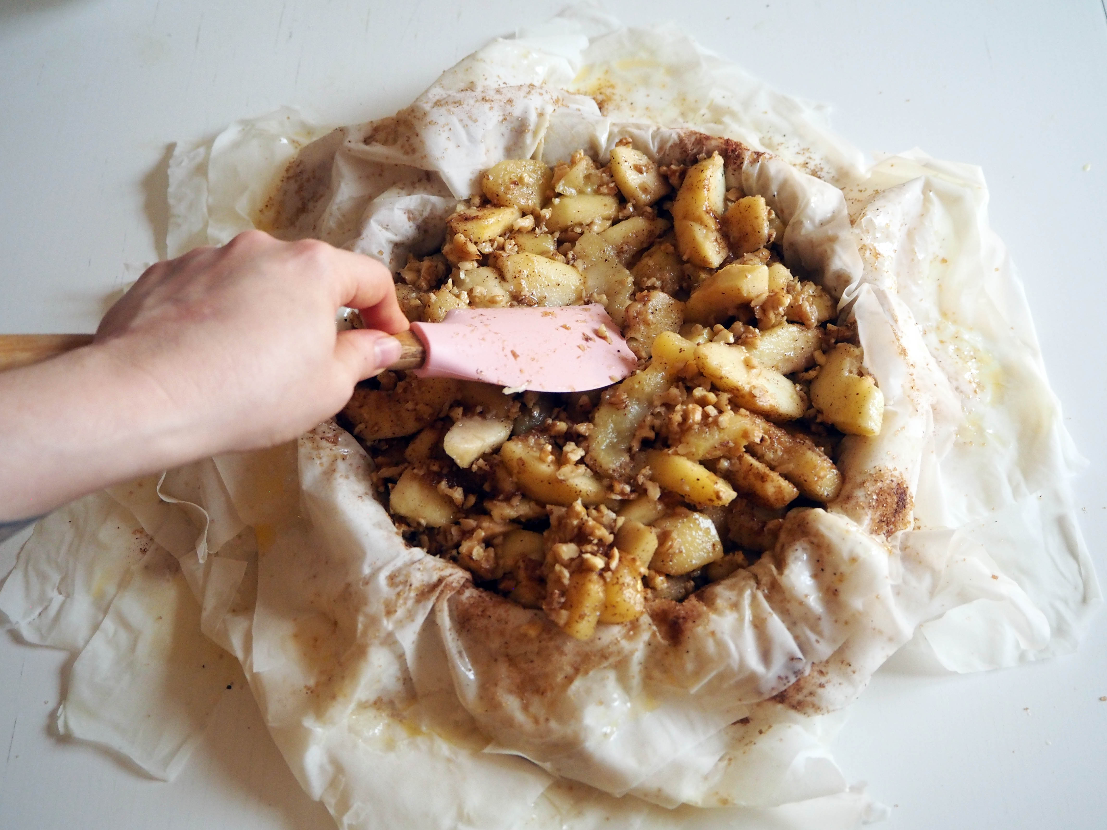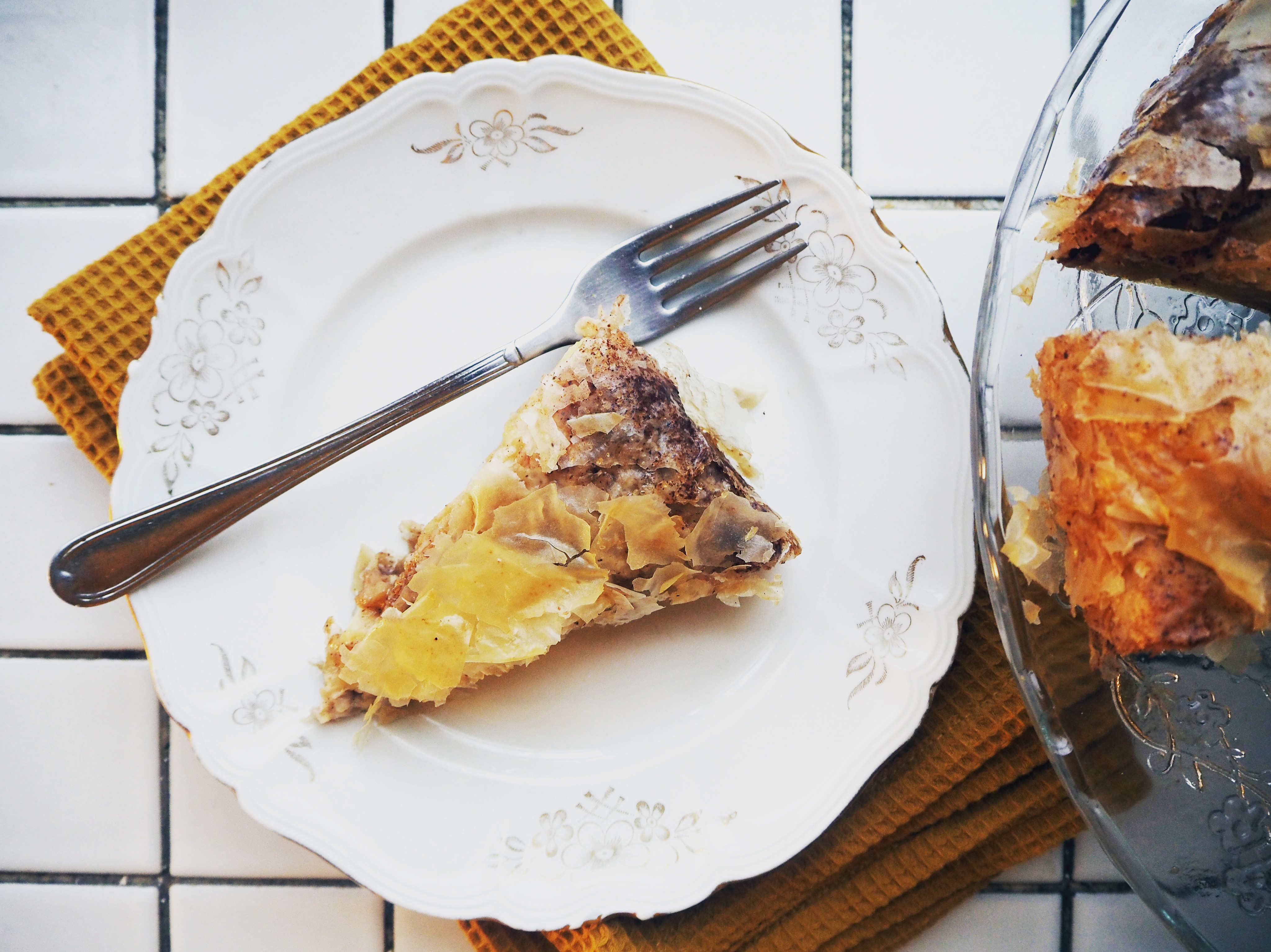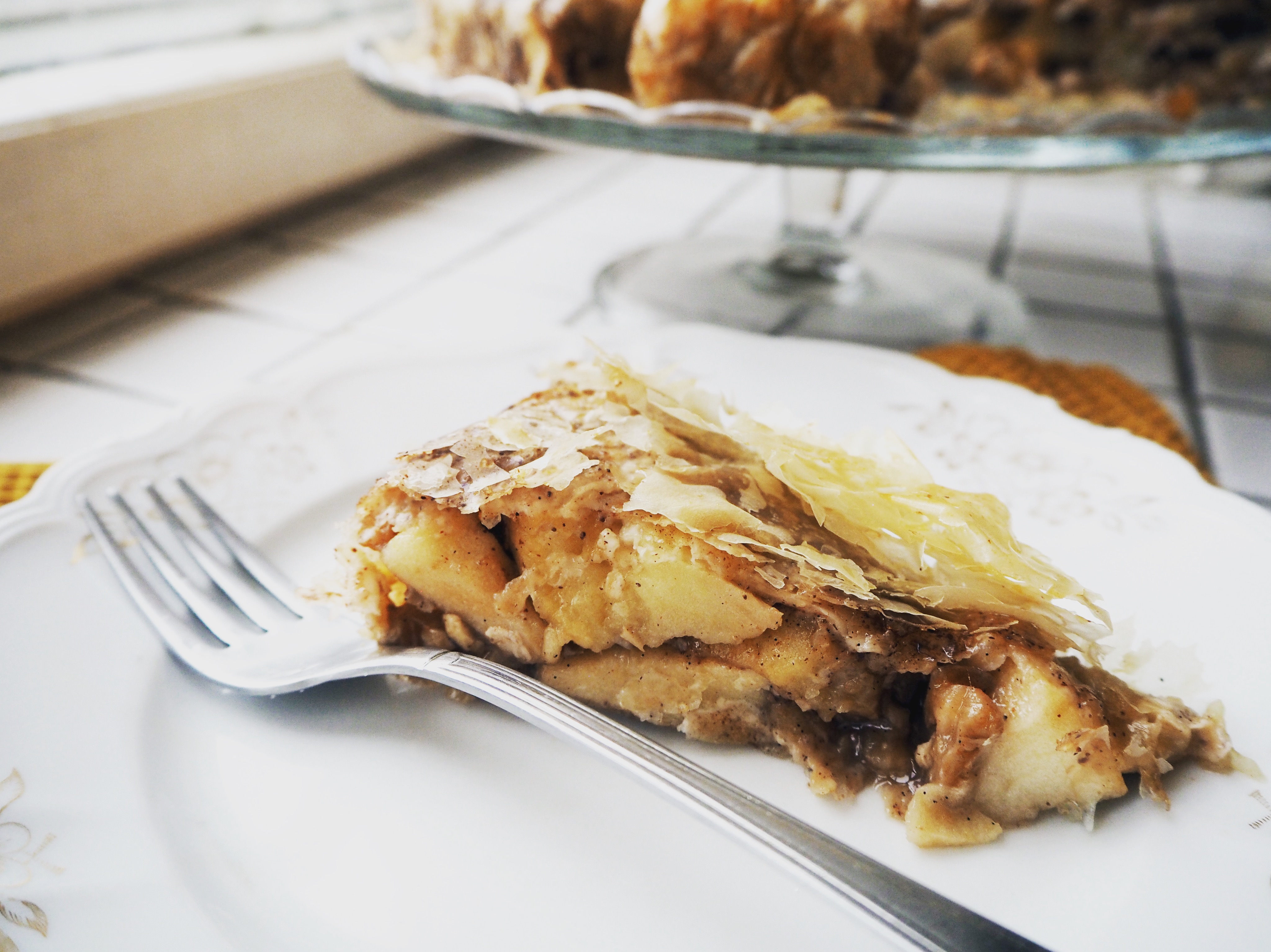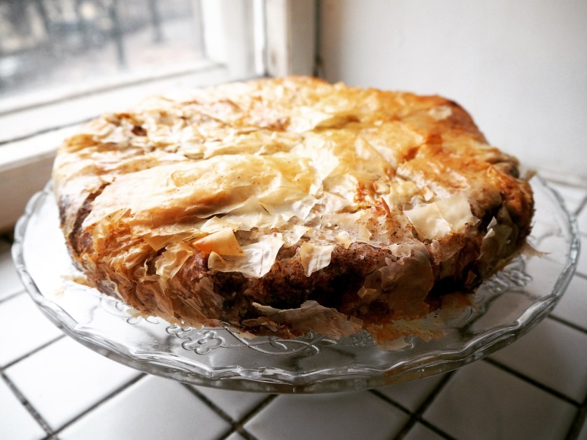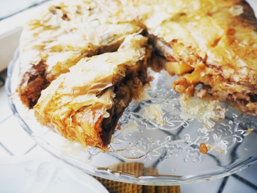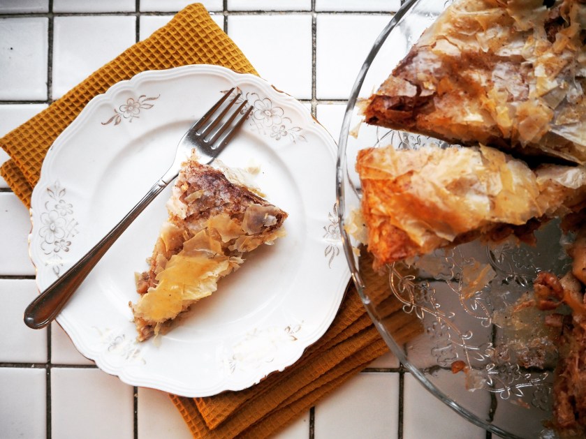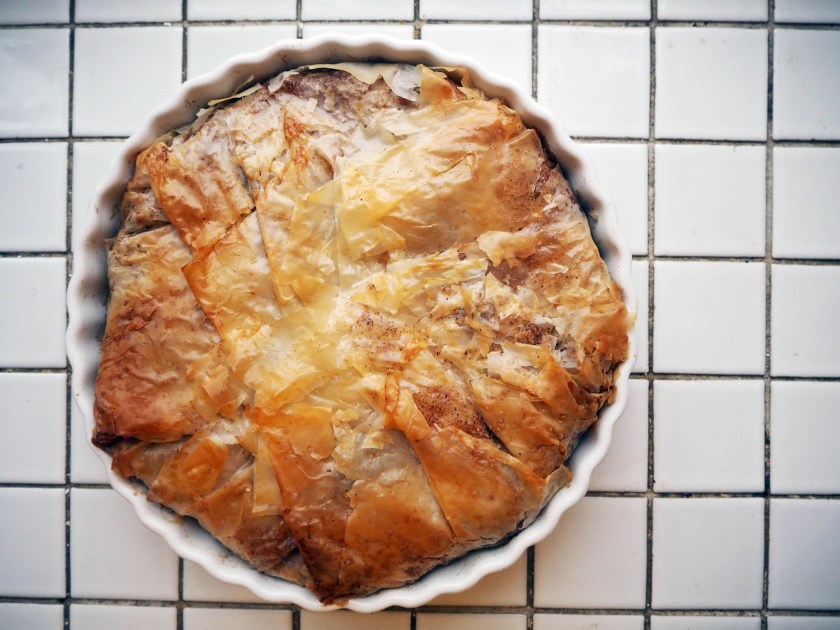 So, I’ve never been a fan of apple pies, really. But it goes back to my dislike for heavy pie doughs. That’s why when I made this pie, using phyllo sheets as the pie dough, I absolutely loved it – it is so so much lighter and crispier, and indeed flakier than other pies.