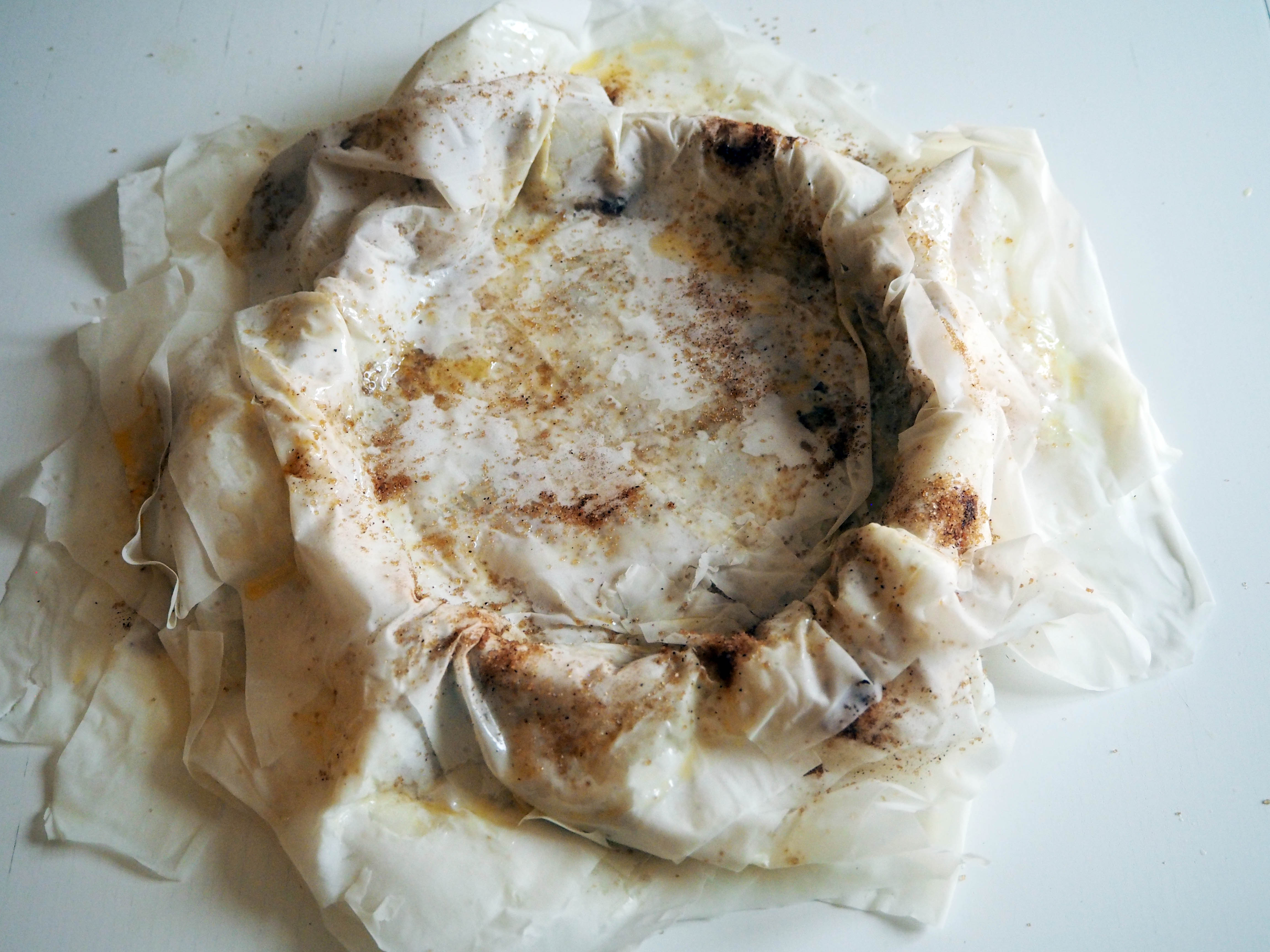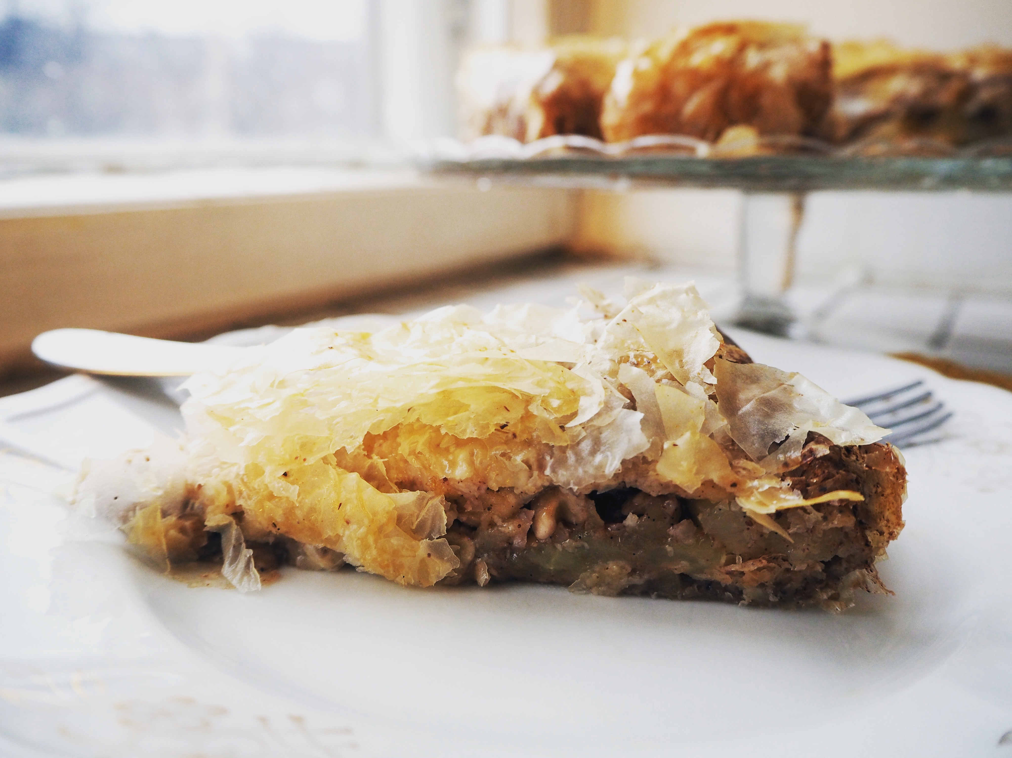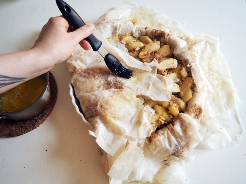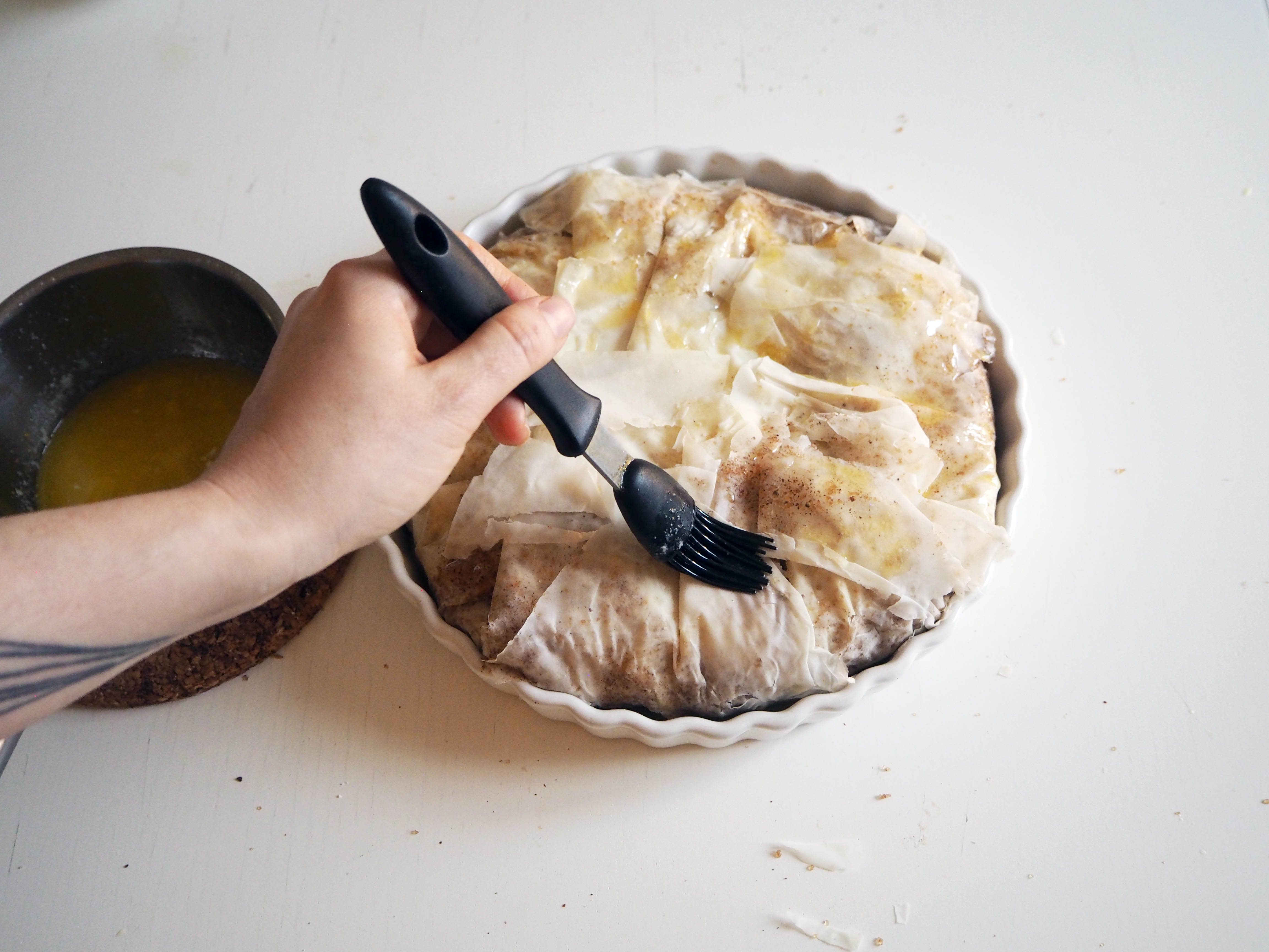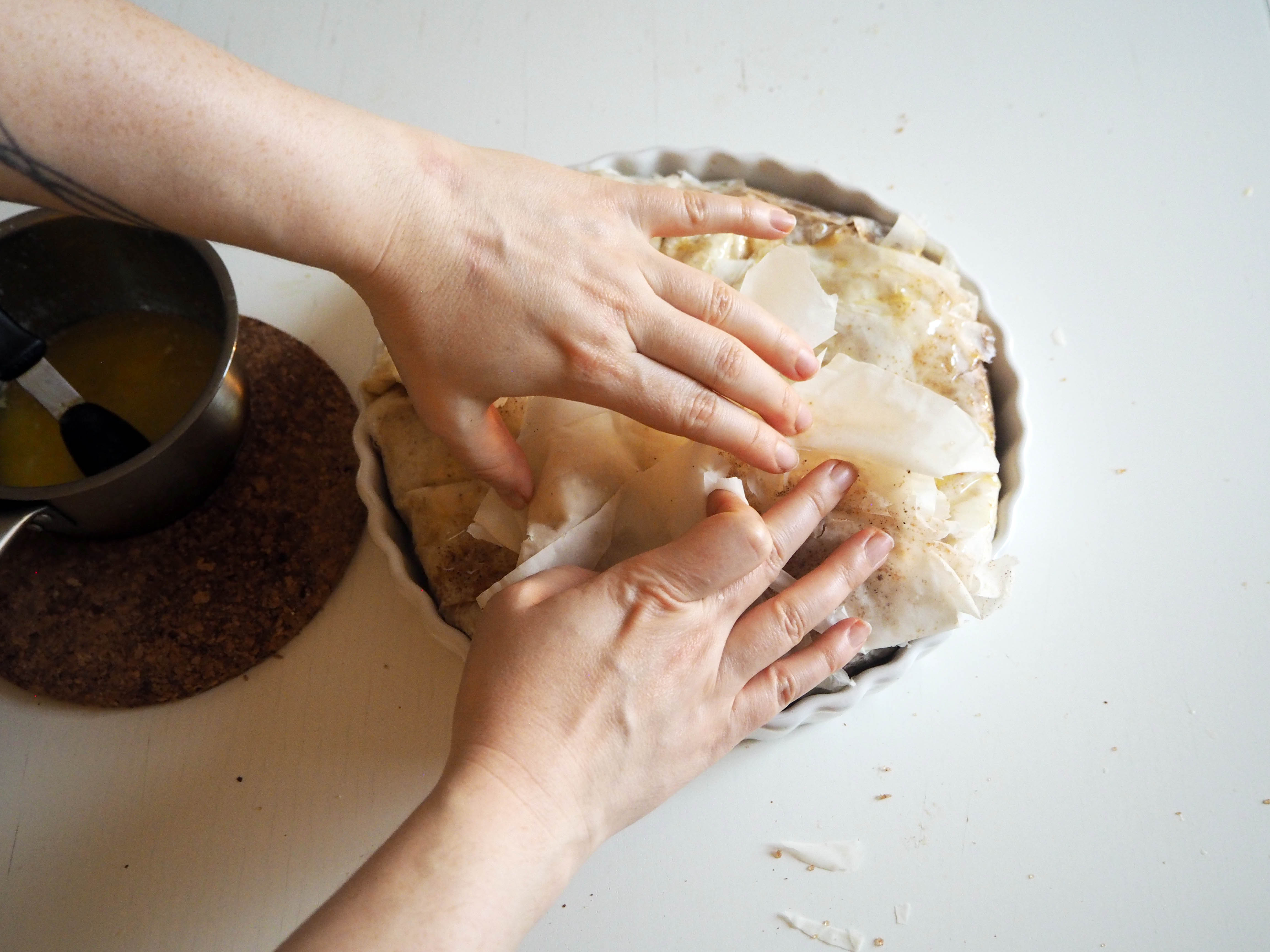 12. Fold the phyllo parts hanging out of the pie dish bit by bit on top of the filling and kind of “glue” them on the top using remaining melted butter. If you have still some butter left in the end, brush the whole top with it for extra crispiness.