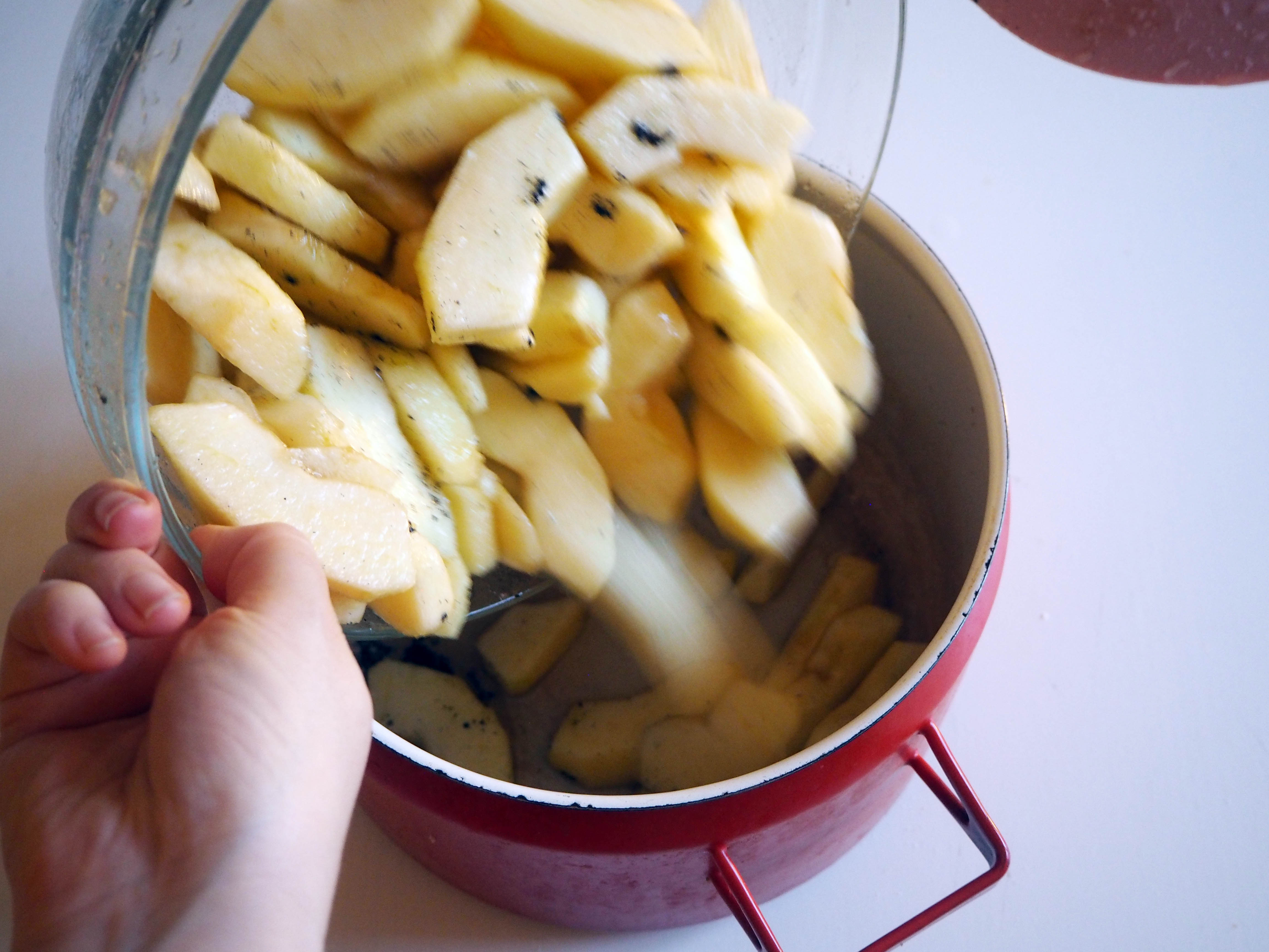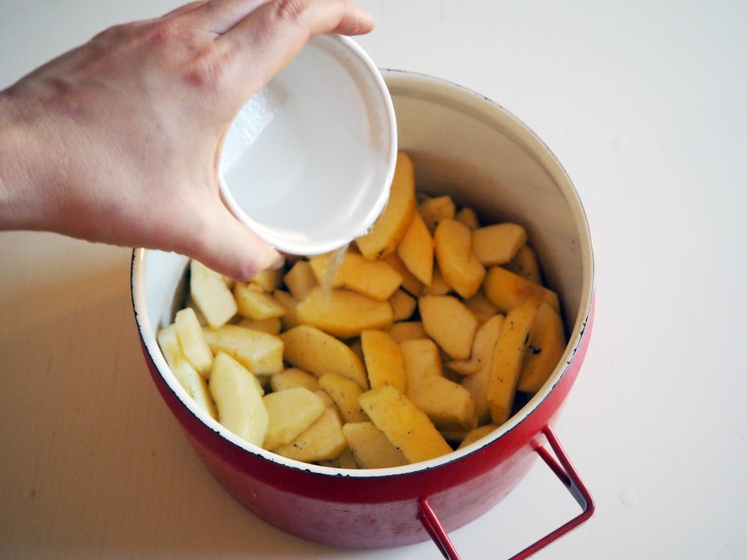 3. Transfer the apple mixture to a large pot and add water. Cook on medium heat with cover on for 10 minutes, until the apple slices get soft but not mushy. When ready, strain the cooked apples and transfer back to the bowl and let them cool completely to room temperature.