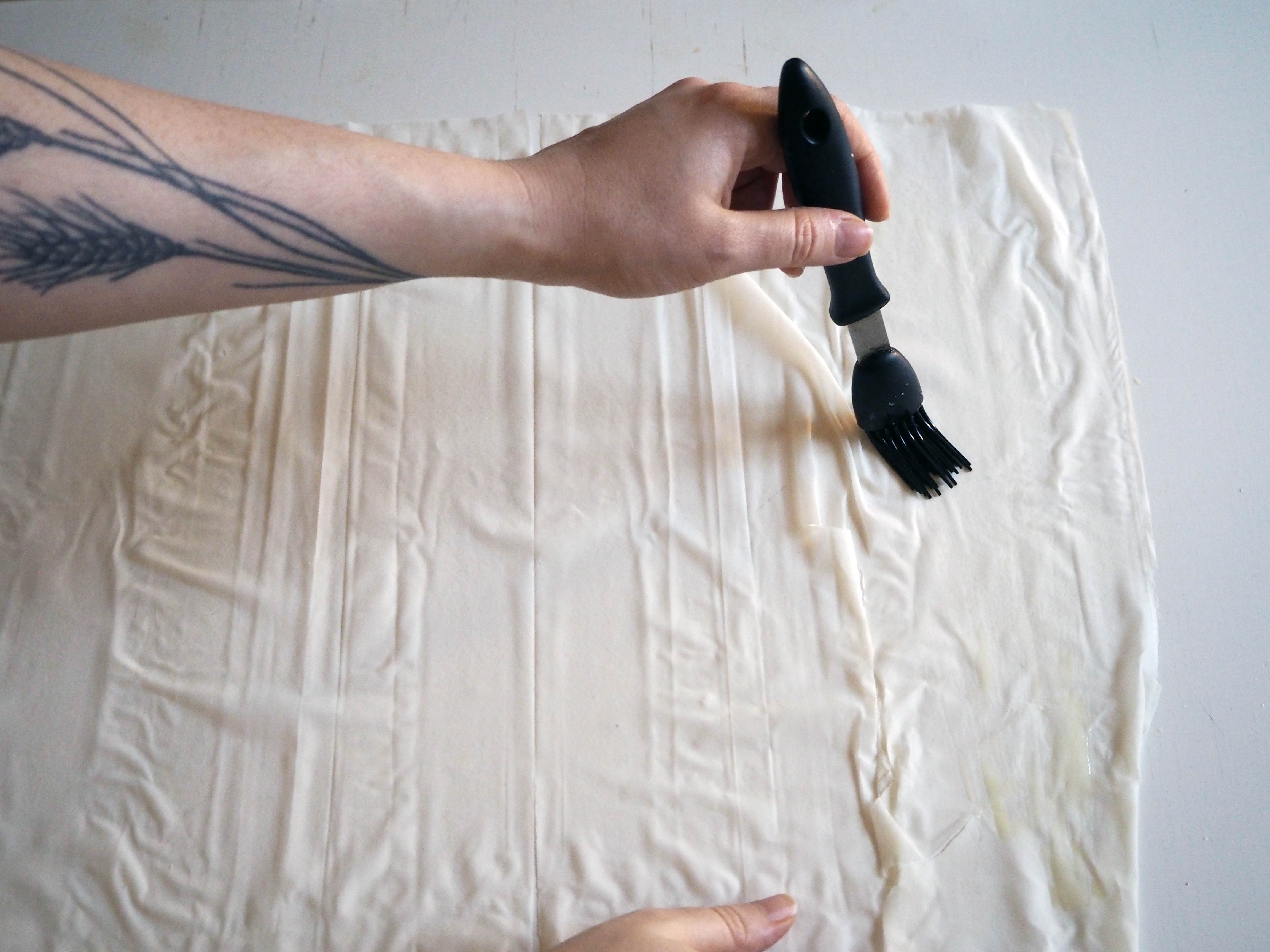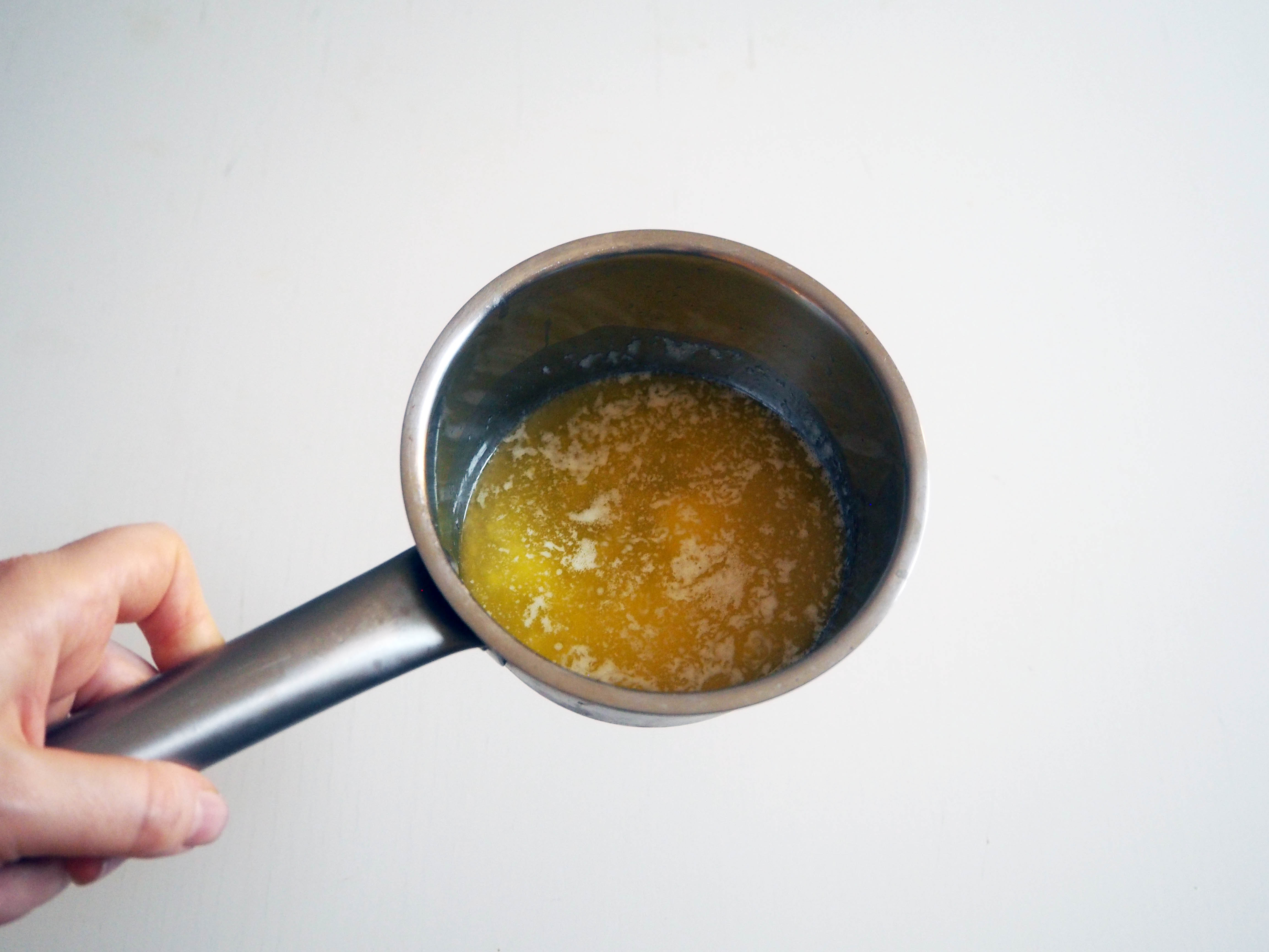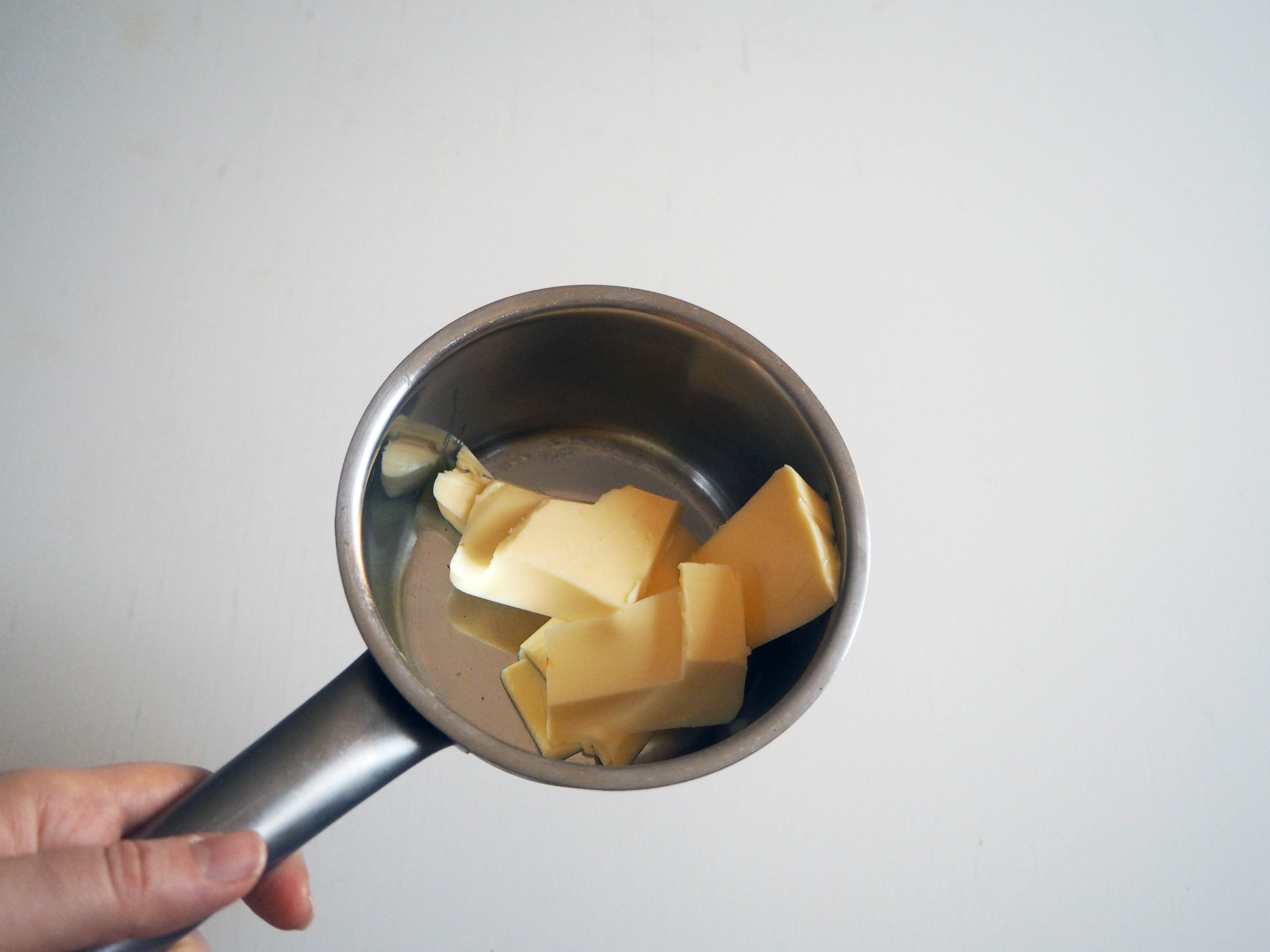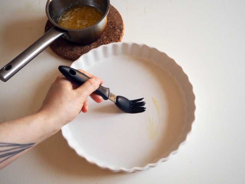 5. Melt the butter in a small saucepan and let it cool for a few minutes. Take a 24cm pie dish and brush base and sides generously with melted butter. Put the pie dish aside.