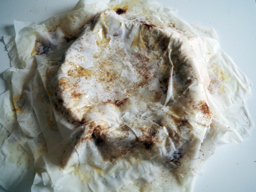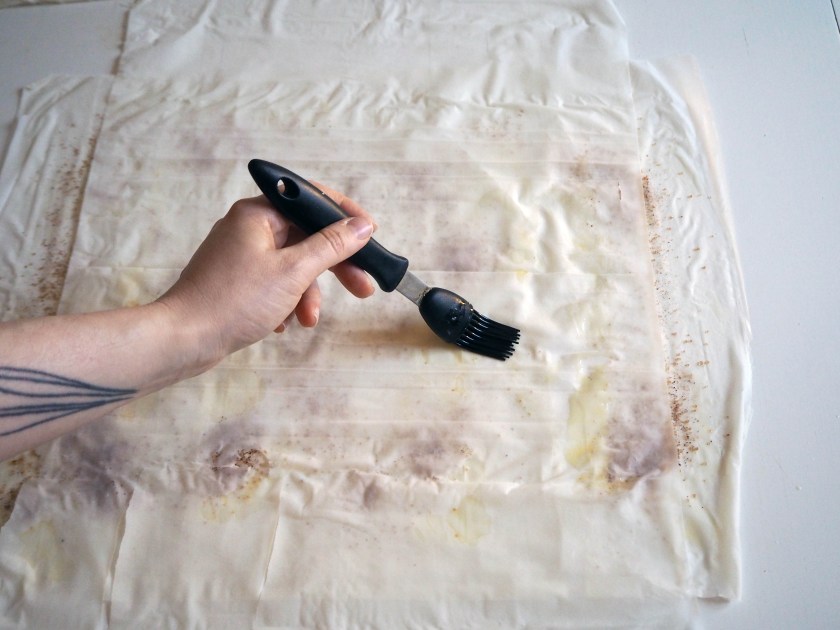 7. Take phyllo sheets, one at a time and stack on top of each other, brushing with butter and sprinkling brown sugar / cinnamon mixture after each layer. The layers should be put on top of each other in a way to create a large almost circle in the end. For a more detailed version of this, check my pumpkin pie recipe: https://mydearkitcheninhelsinki.com/2018/09/23/pumpkin-pie-with-phyllo-crust-autumn-continues/ In this recipe I used 6 sheets but you can add 2 more when you get the idea.