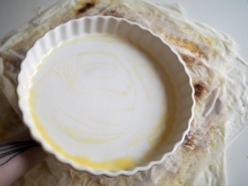 8. When phyllo sheets are ready, take the greased pie dish and put it under the phyllo pile. Push the pile gently into the pie dish so that phyllo sheets take the shape of the dish.