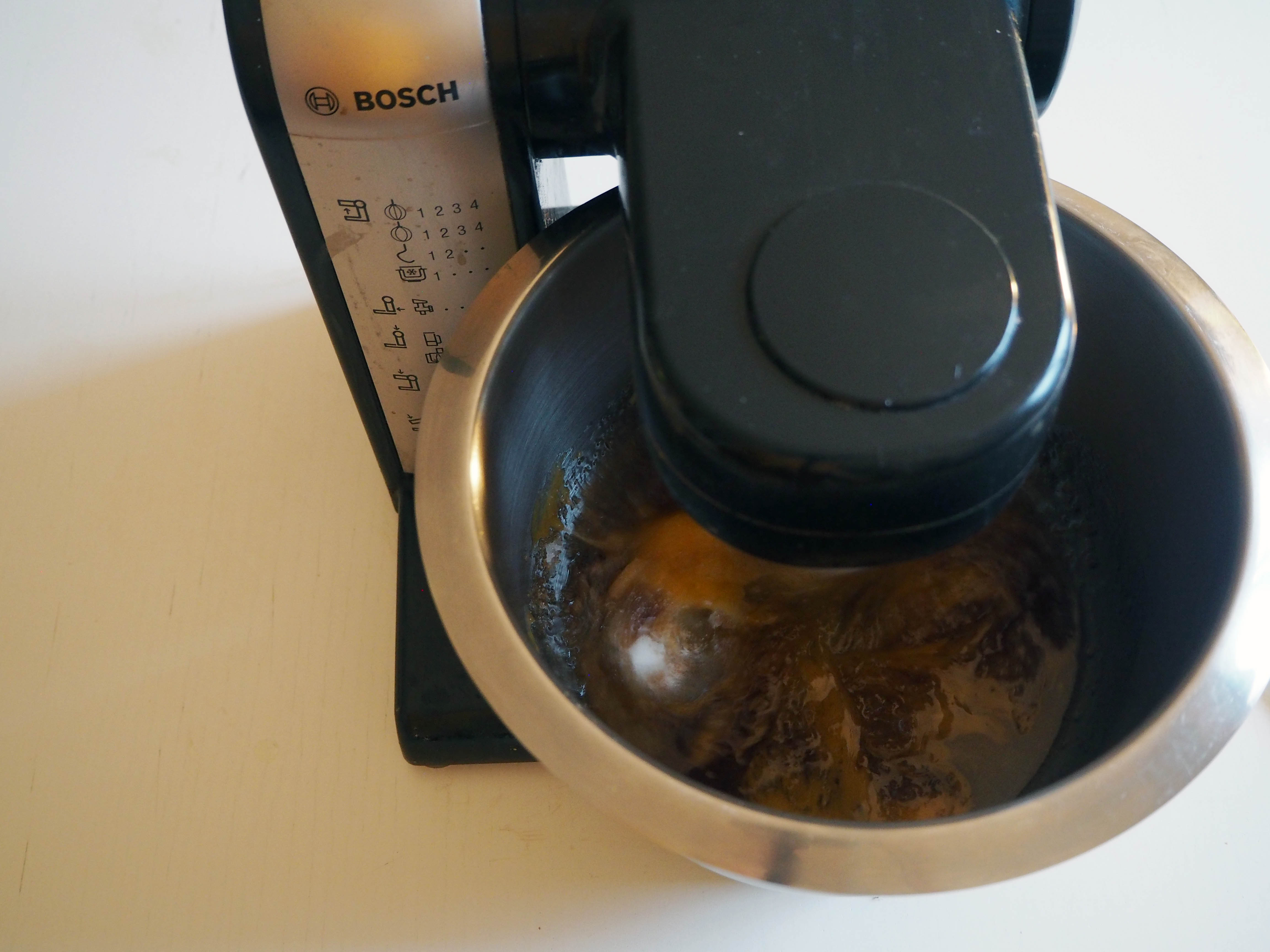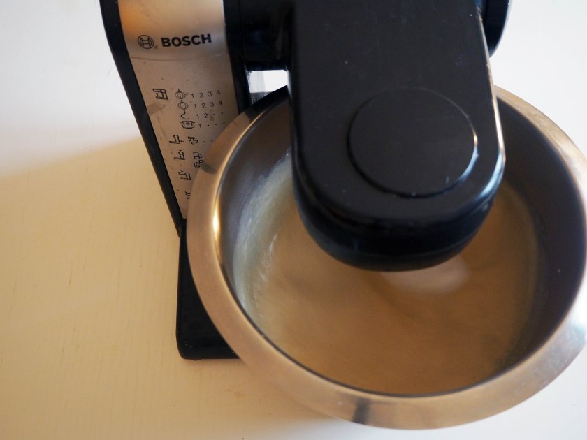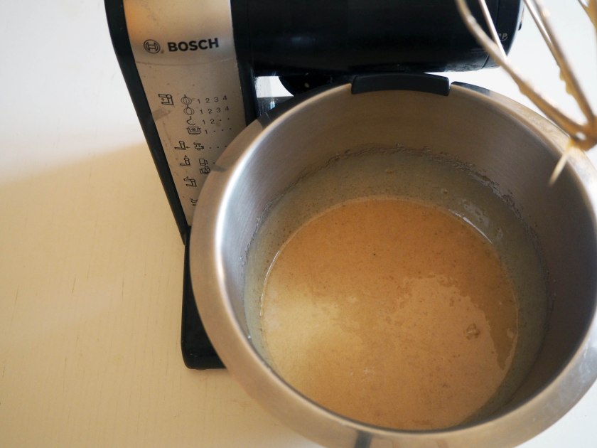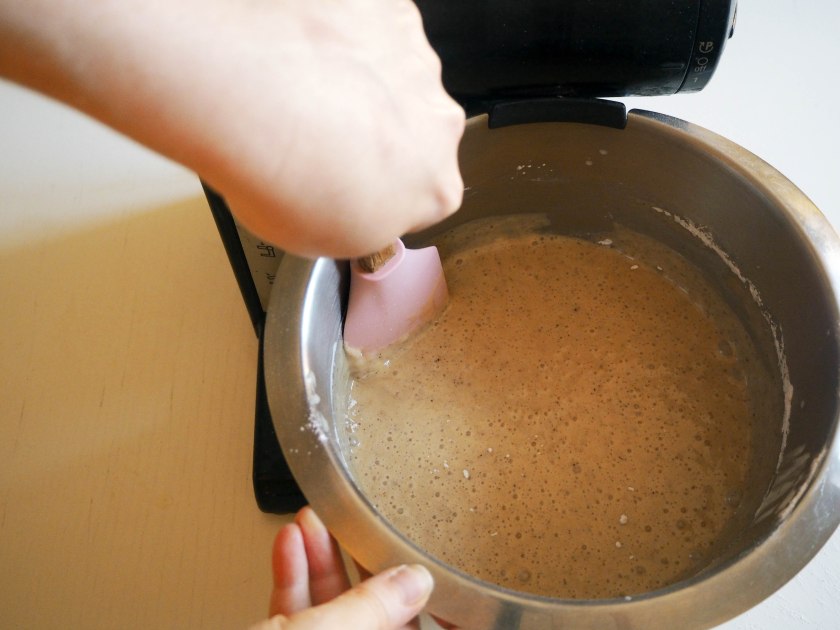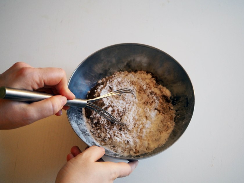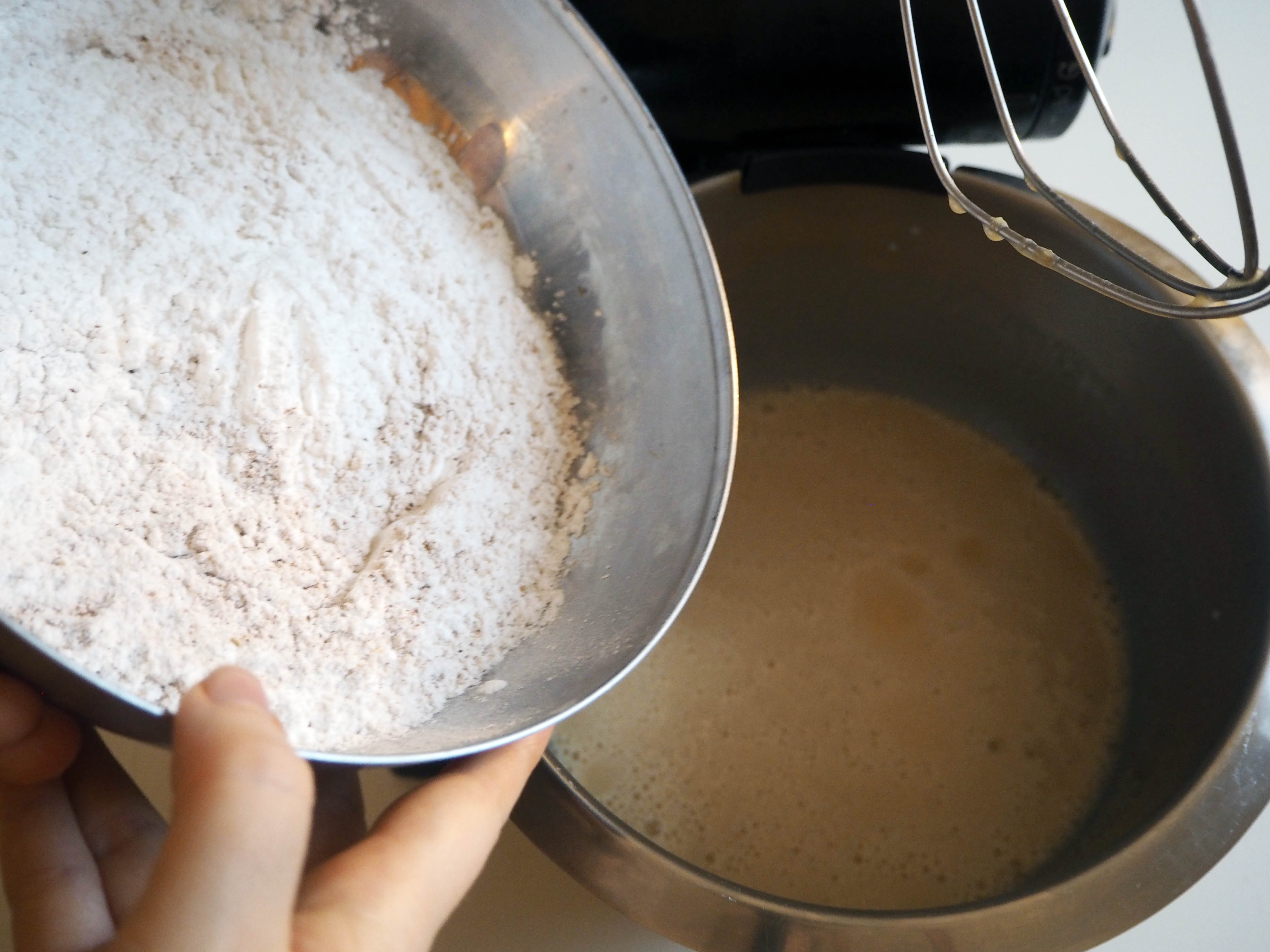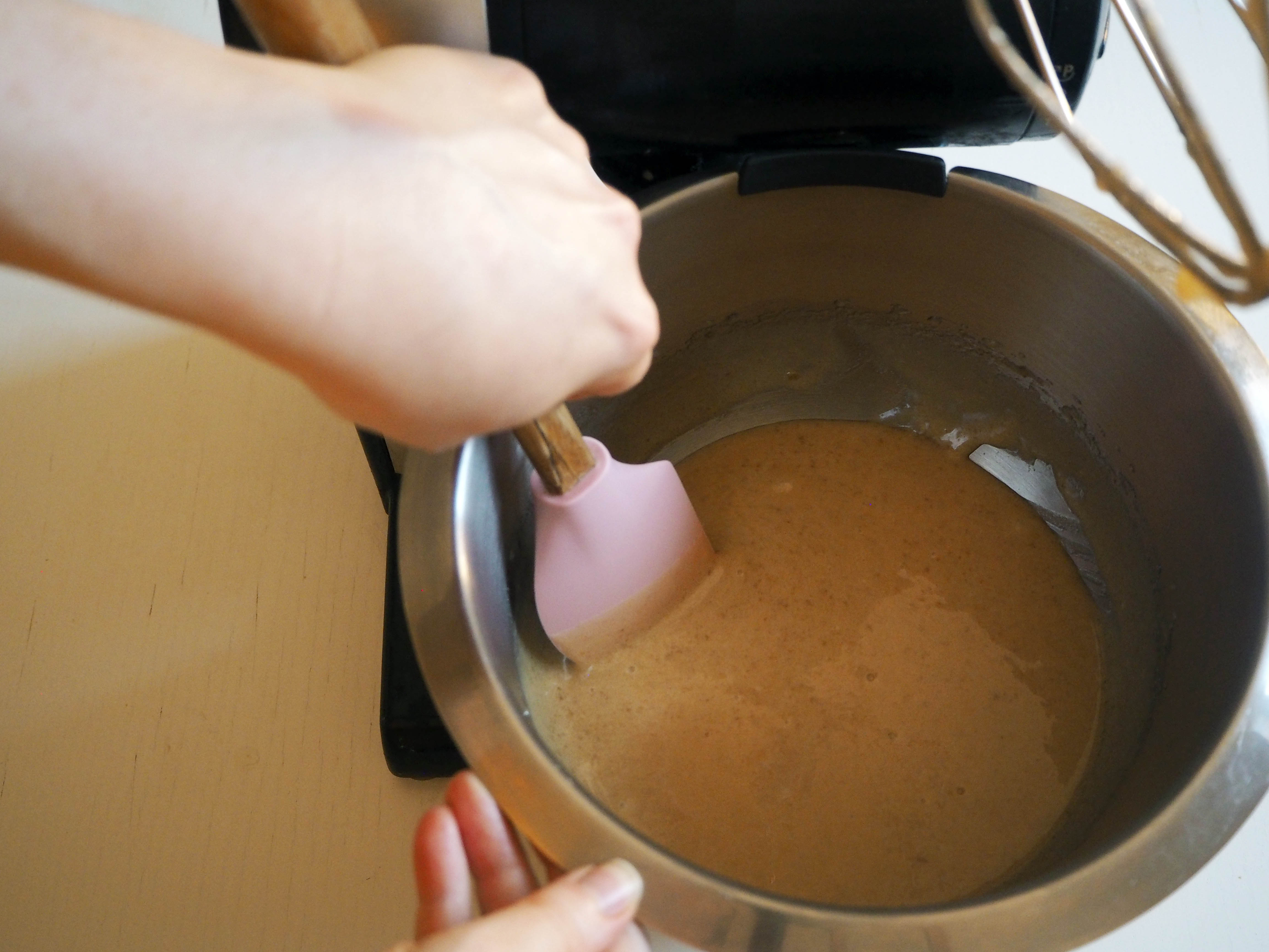 6. Put all the dry ingredients in the bowl and continue beating in low to medium speed until you have a smooth batter, scraping the sides of the bowl if needed.