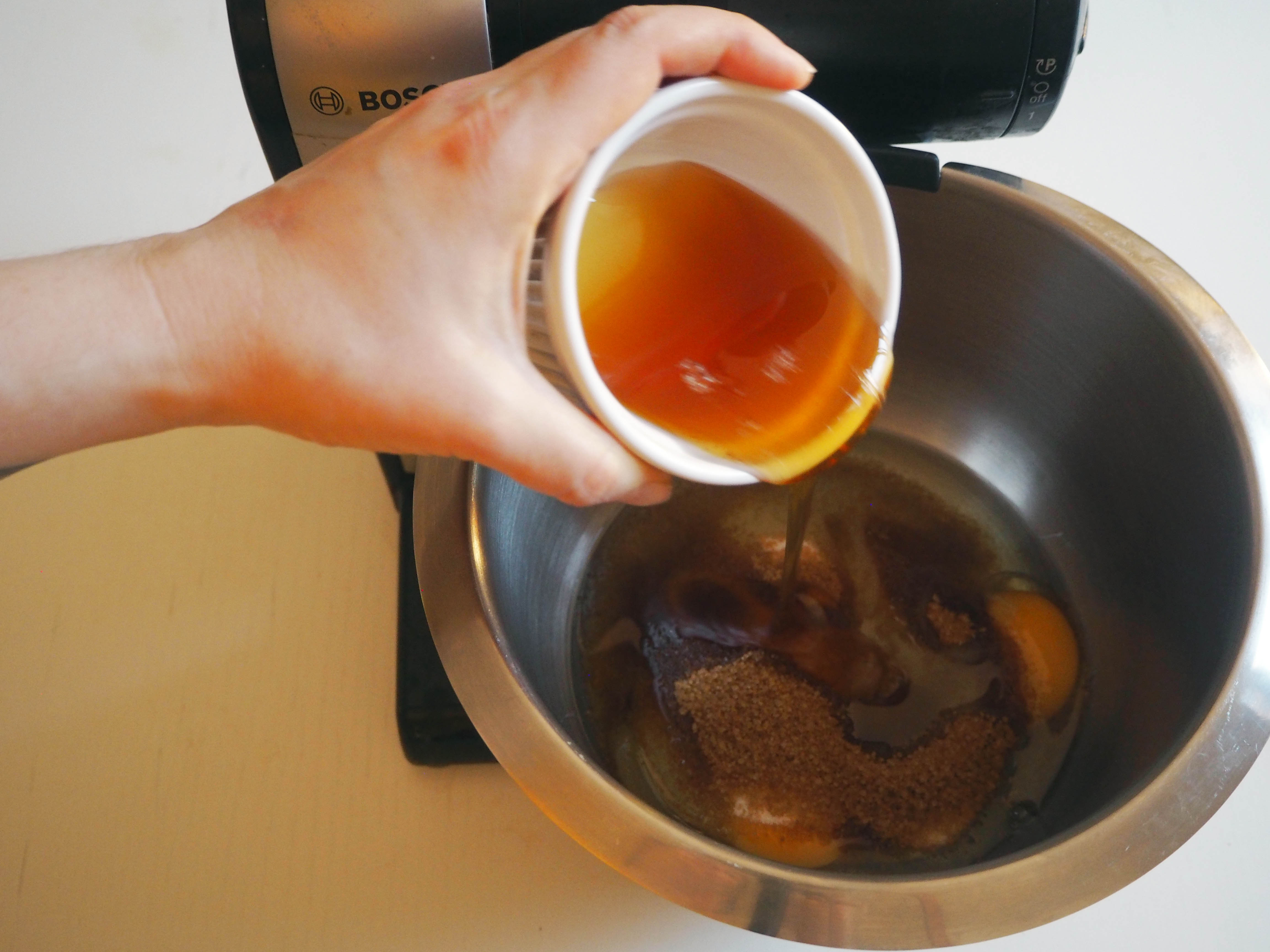 3. In a mixing bowl, put the next 6 ingredients (from white sugar to honey) and beat until they are fully incorporated in medium speed.