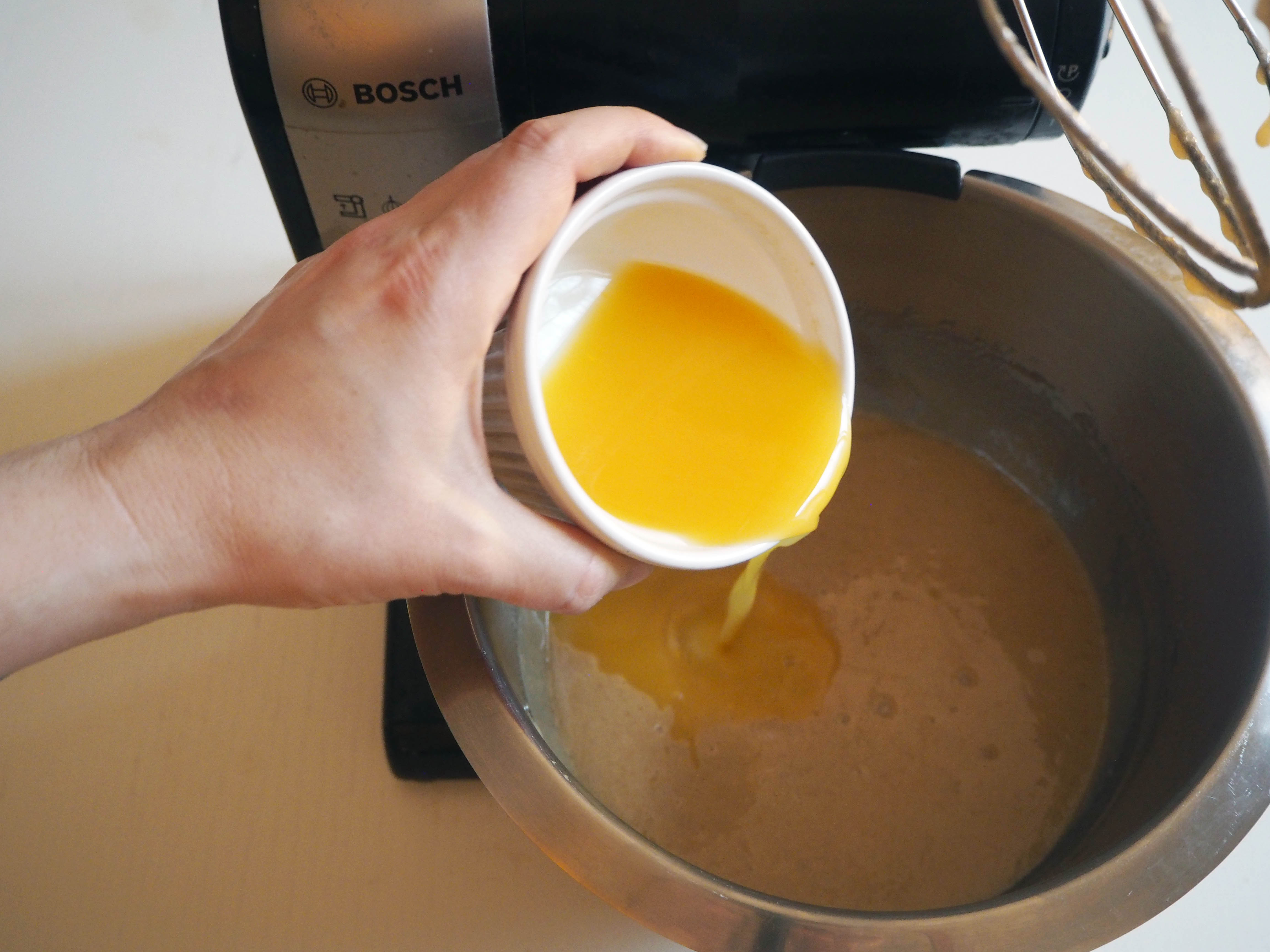 5. Add remaining ingredients (orange juice and buttermilk) to the bowl and continue beating until smooth in medium speed.