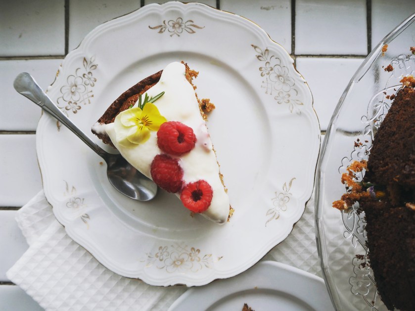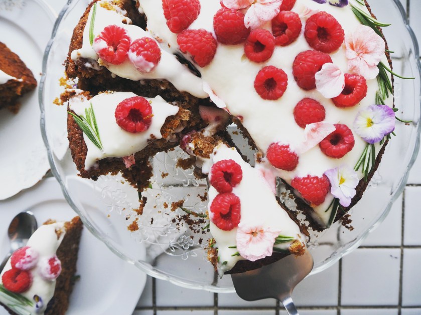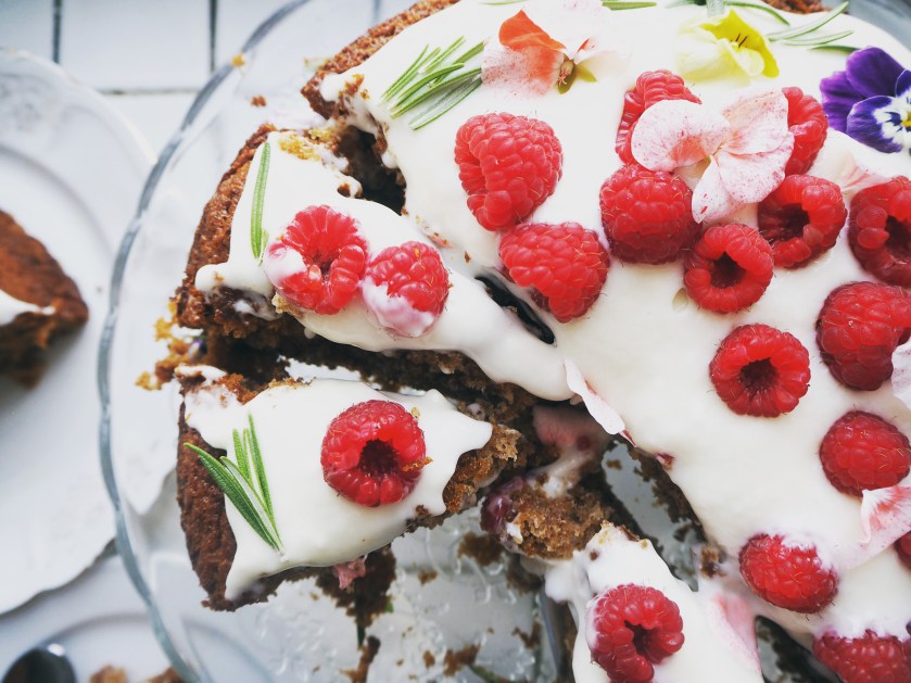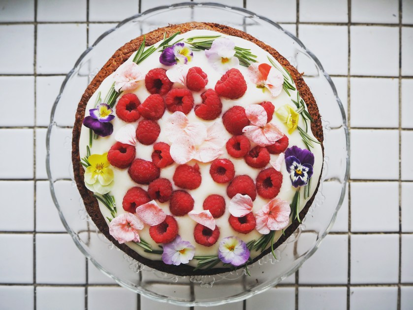 I decorated the cake with raspberries, fresh rosemary and edible flowers but you can decorate it any way you like. You can also double the amount of frosting, cut the cake in 2 and put some frosting also in between 2 layers. The cake is thick enough to create 2 layers.